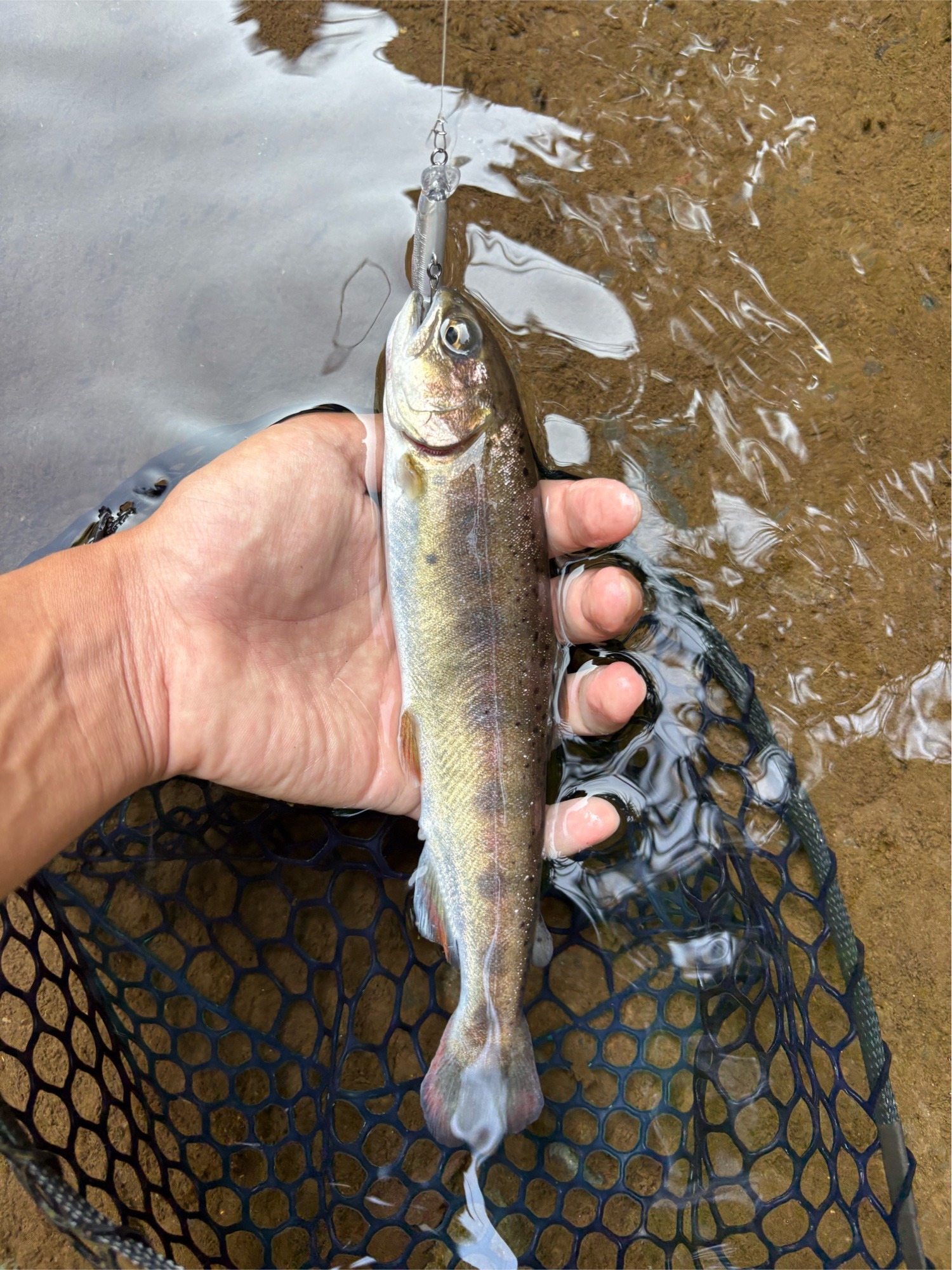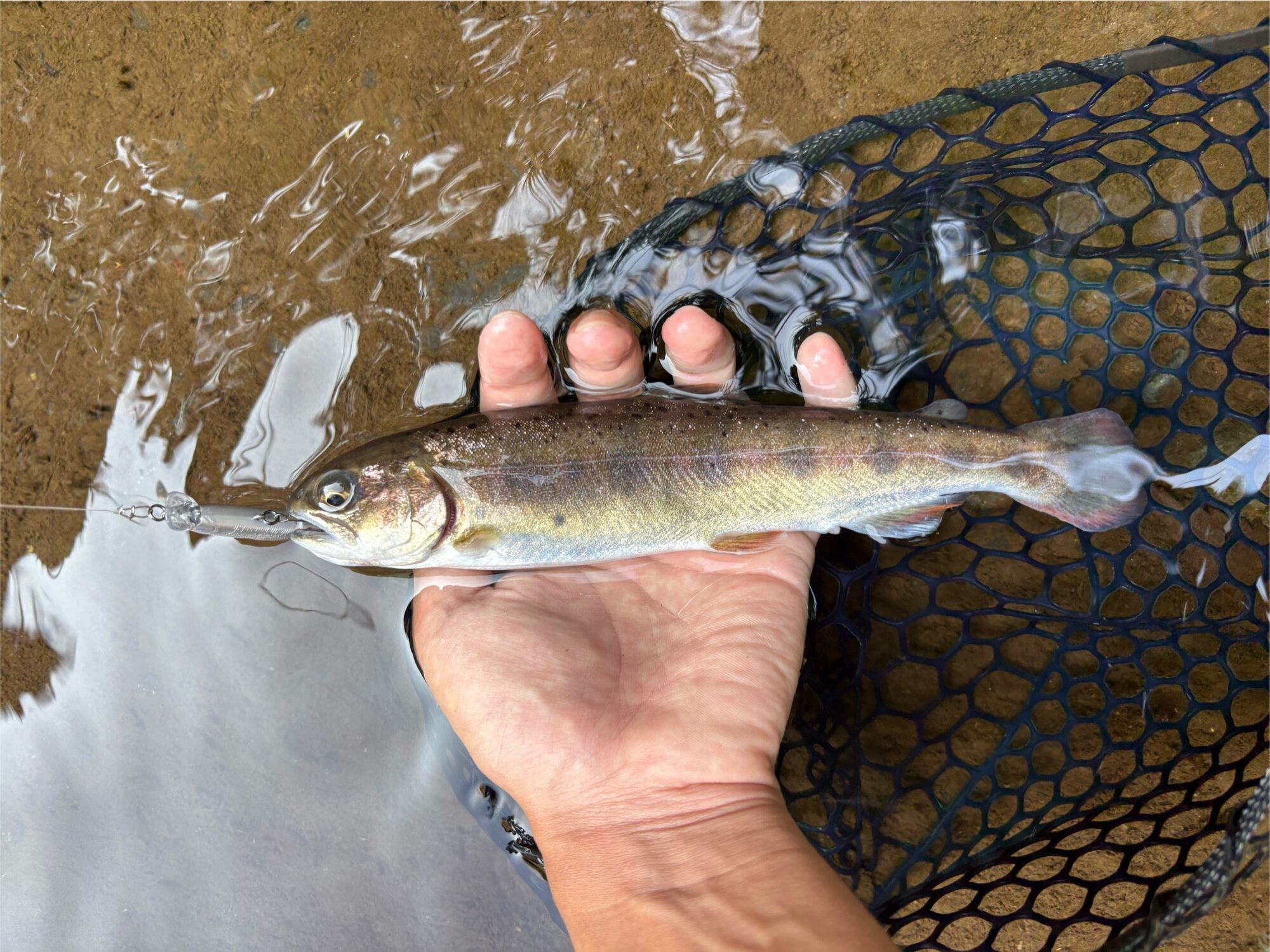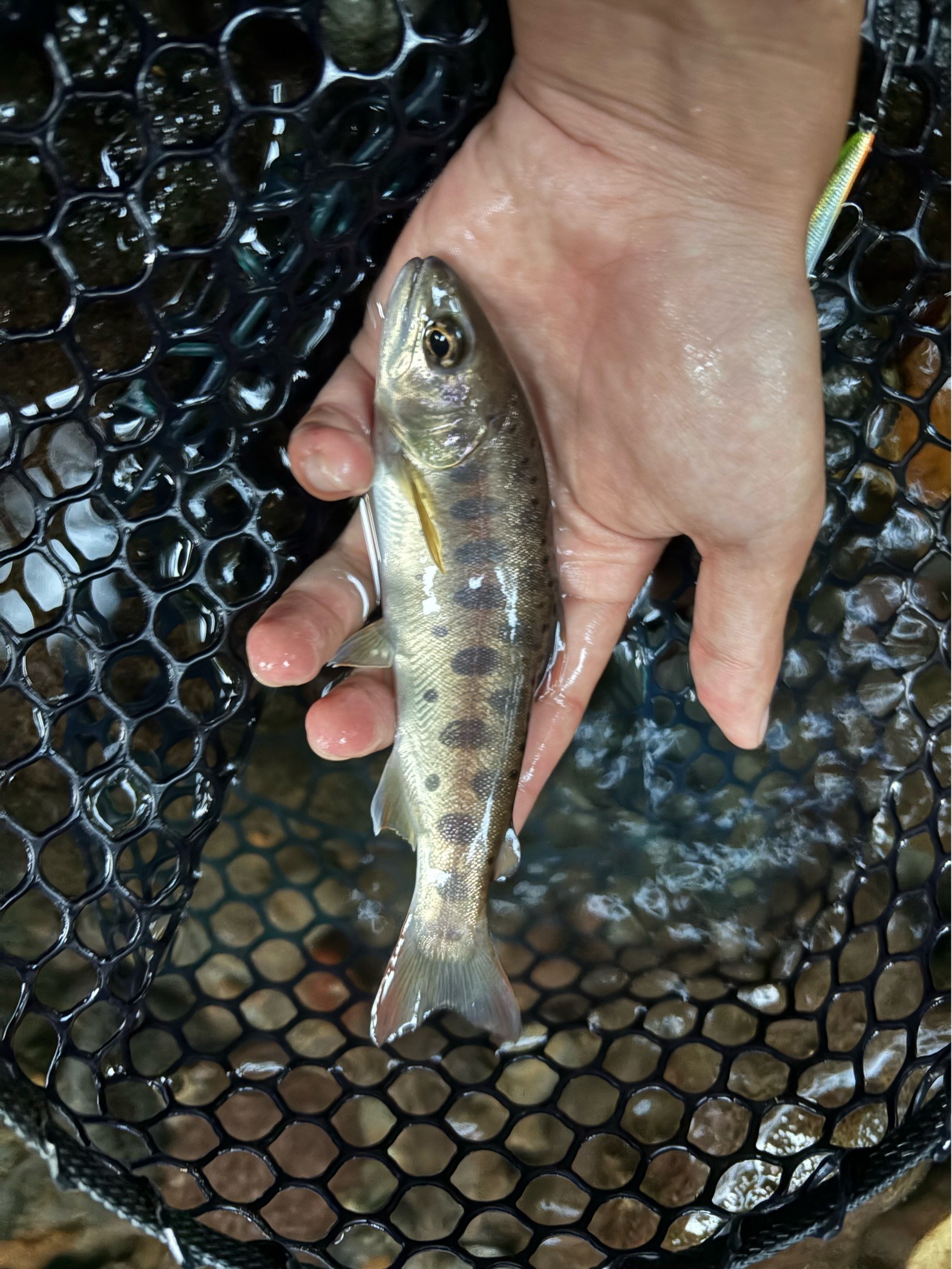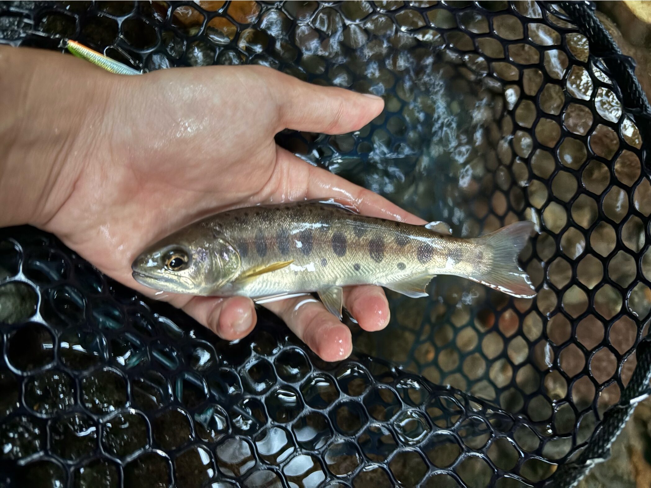 黒っぽくて細長い成魚放流っぽいヤマメでした。 尾鰭が丸く、鰭の欠損もあったのでこういった緩いポイントにいたのかなと思います。