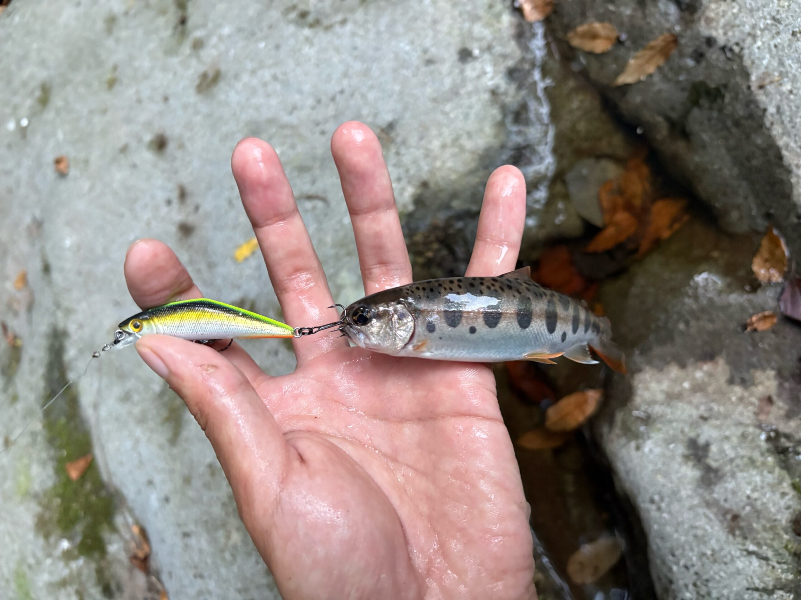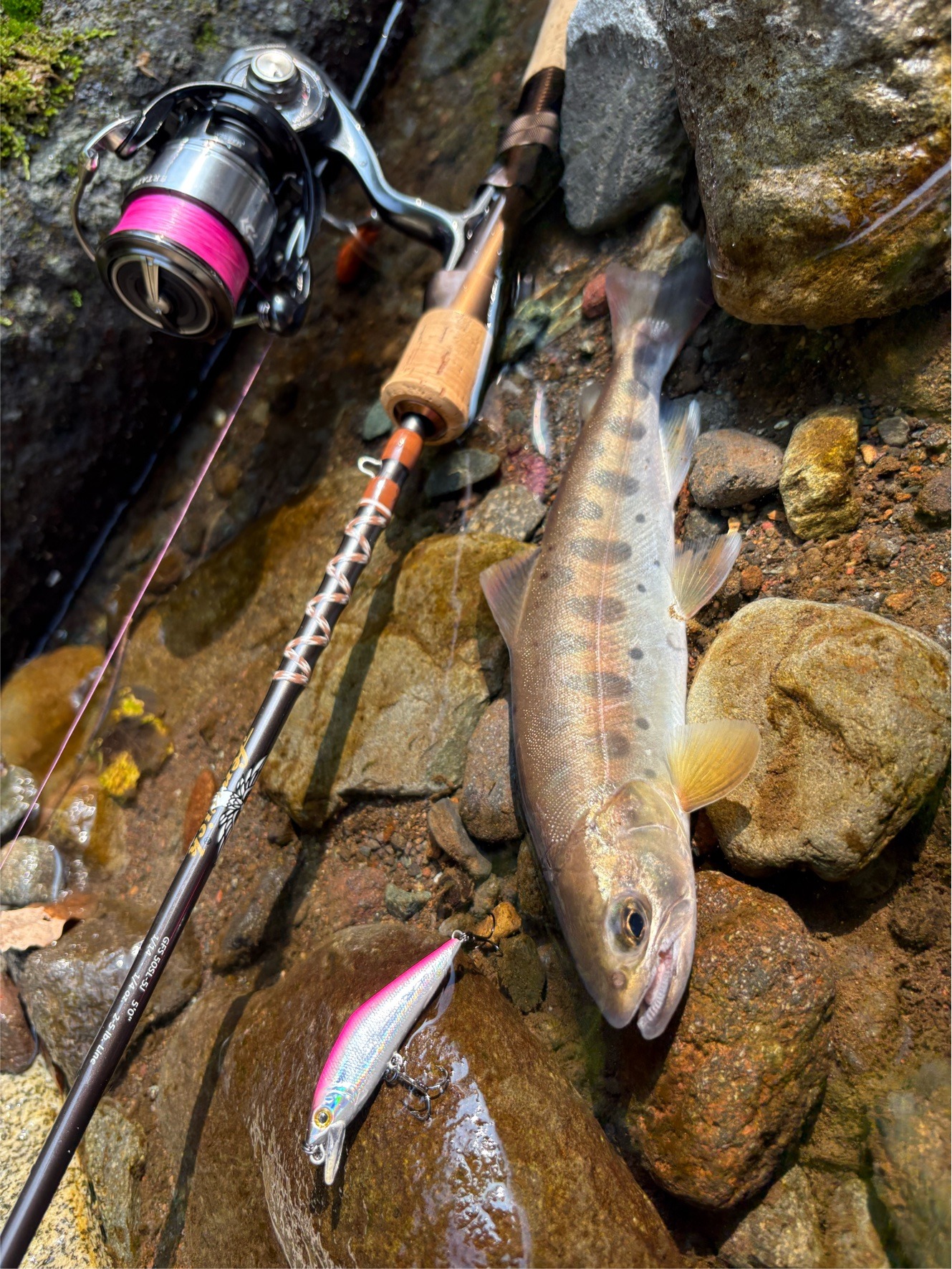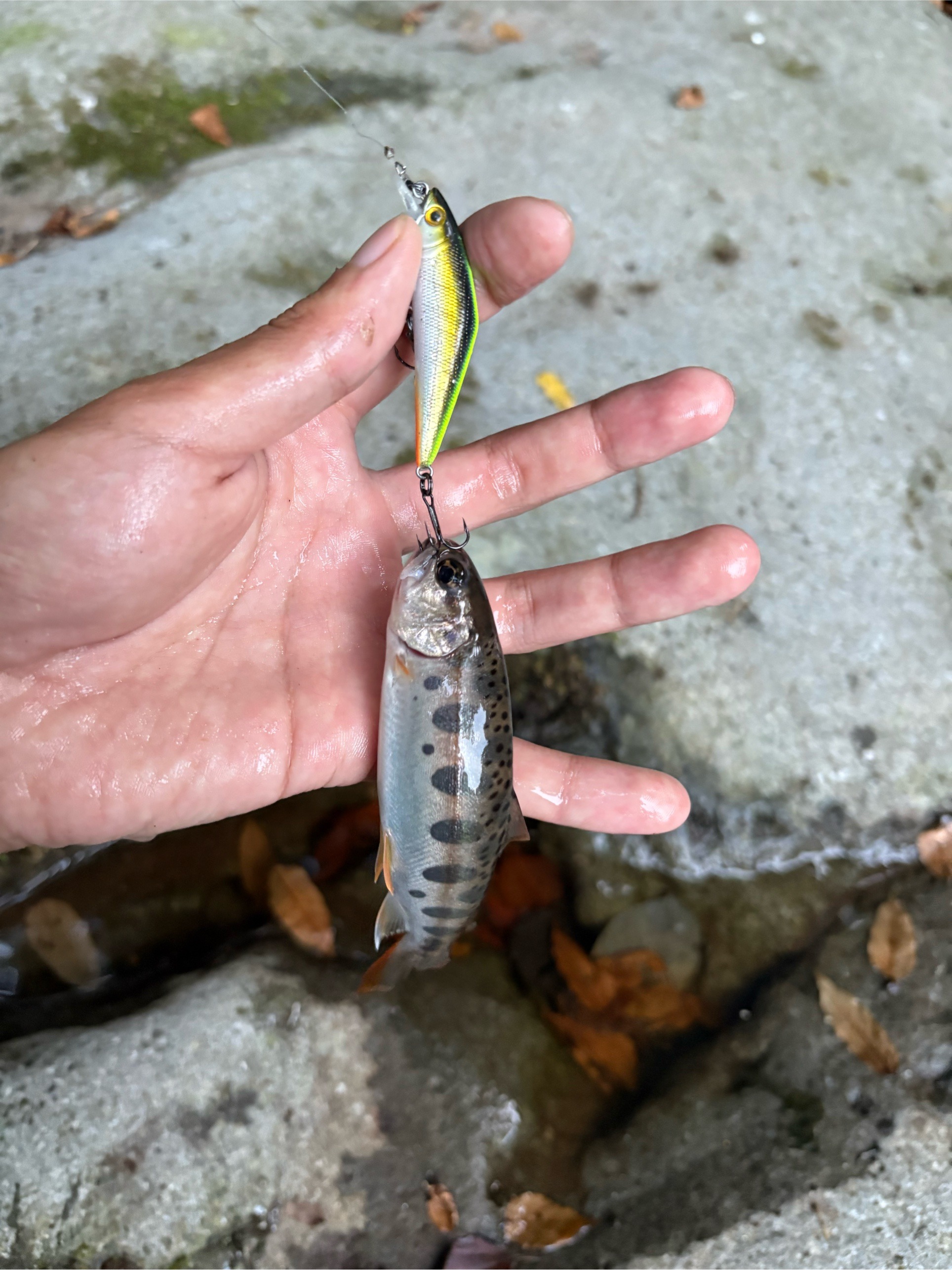 黒っぽくて細長い成魚放流っぽいヤマメでした。 尾鰭が丸く、鰭の欠損もあったのでこういった緩いポイントにいたのかなと思います。