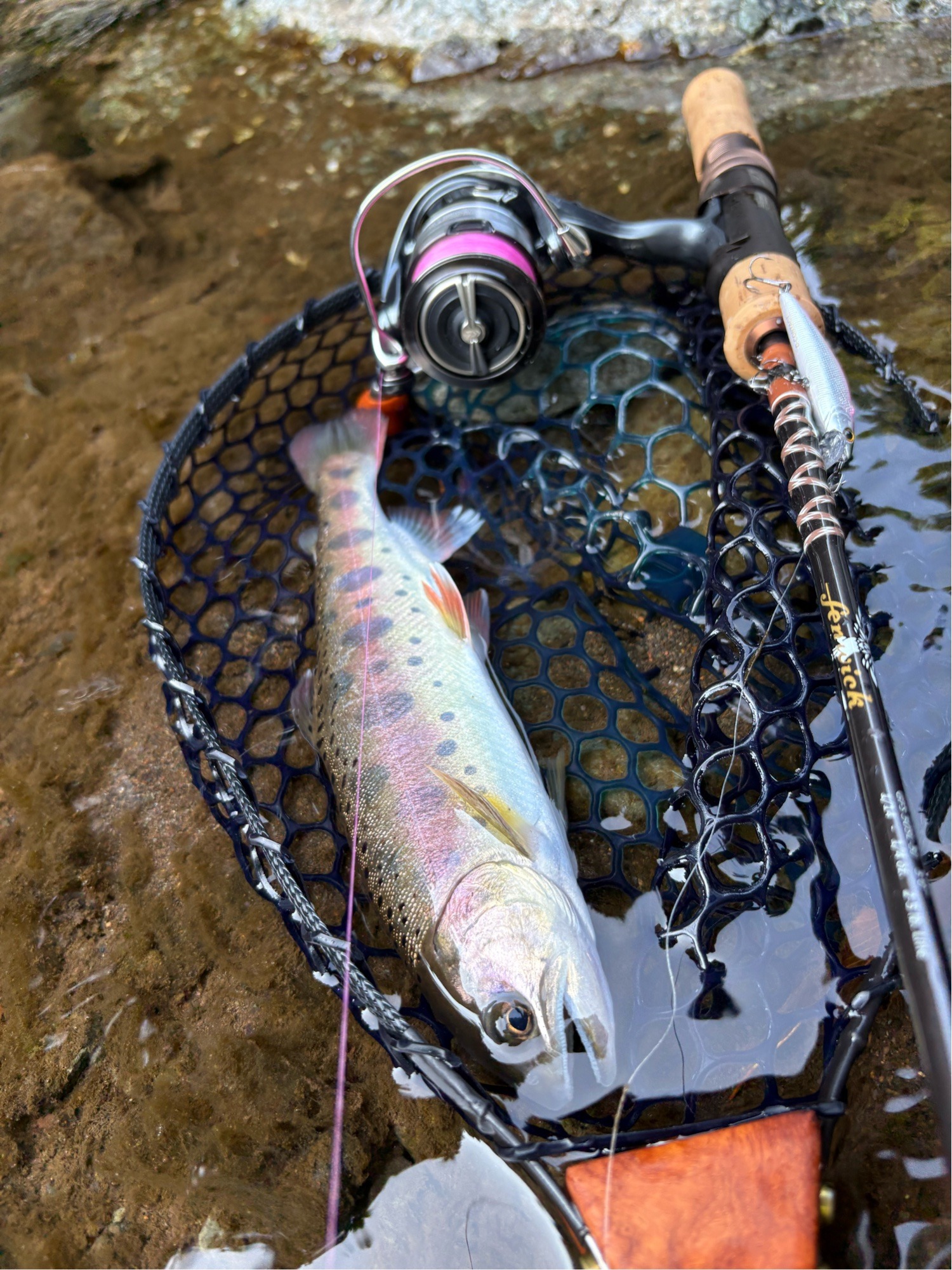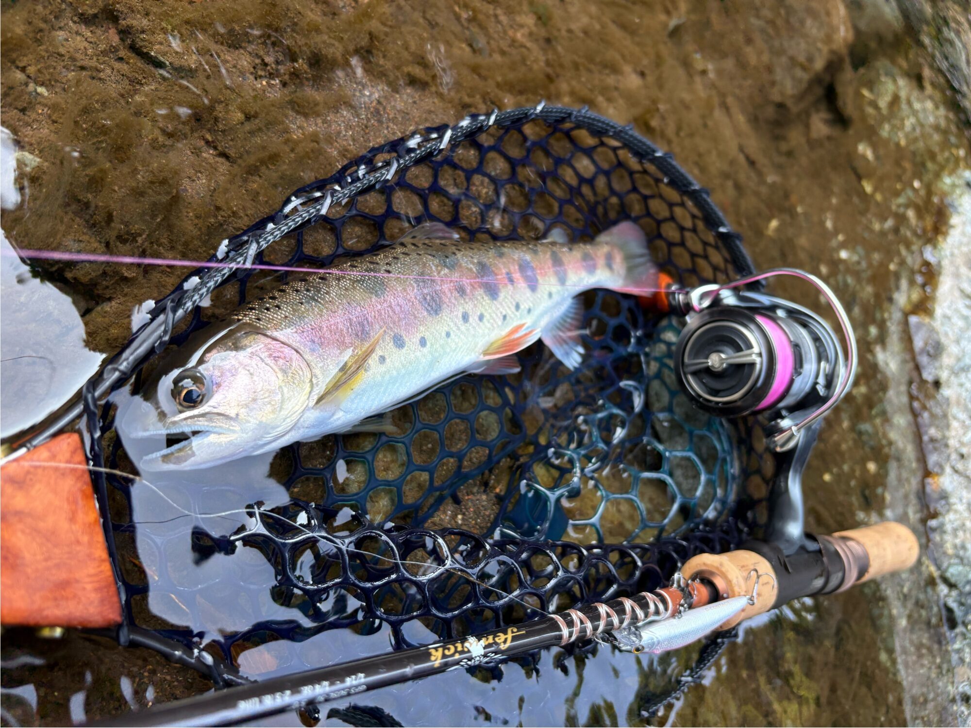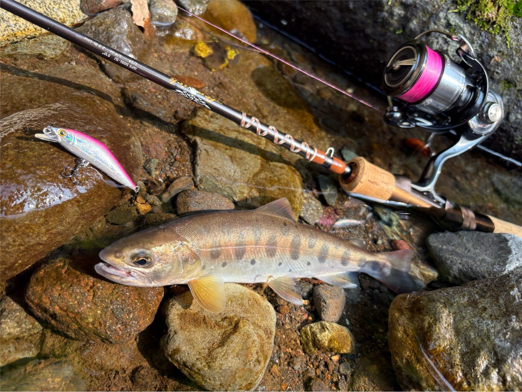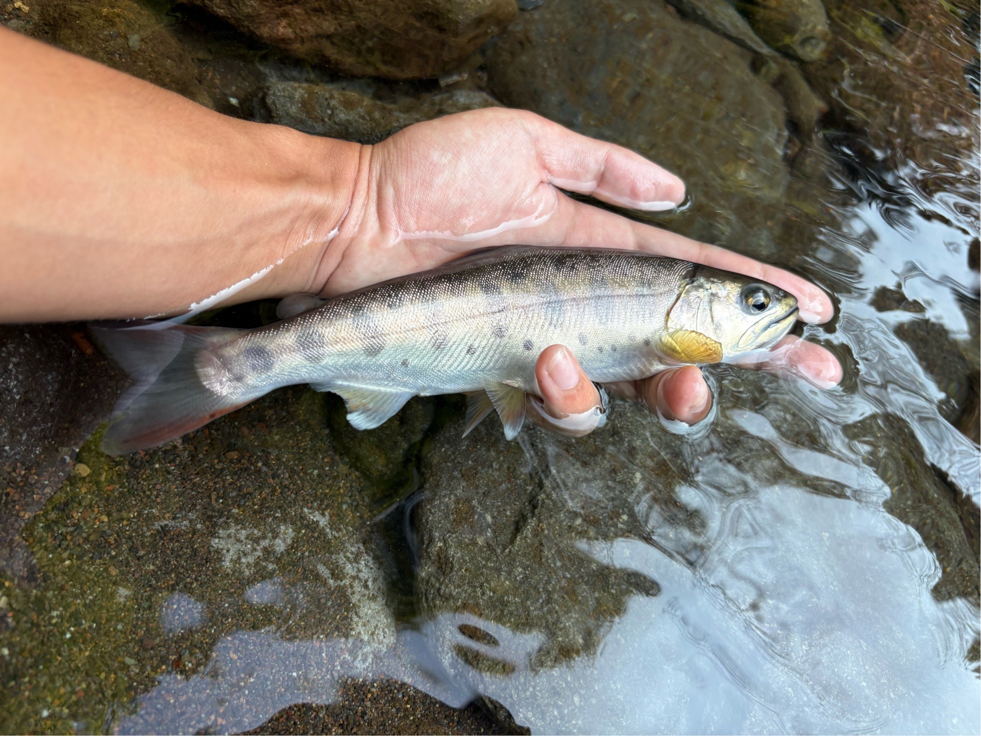 黒っぽくて細長い成魚放流っぽいヤマメでした。 尾鰭が丸く、鰭の欠損もあったのでこういった緩いポイントにいたのかなと思います。