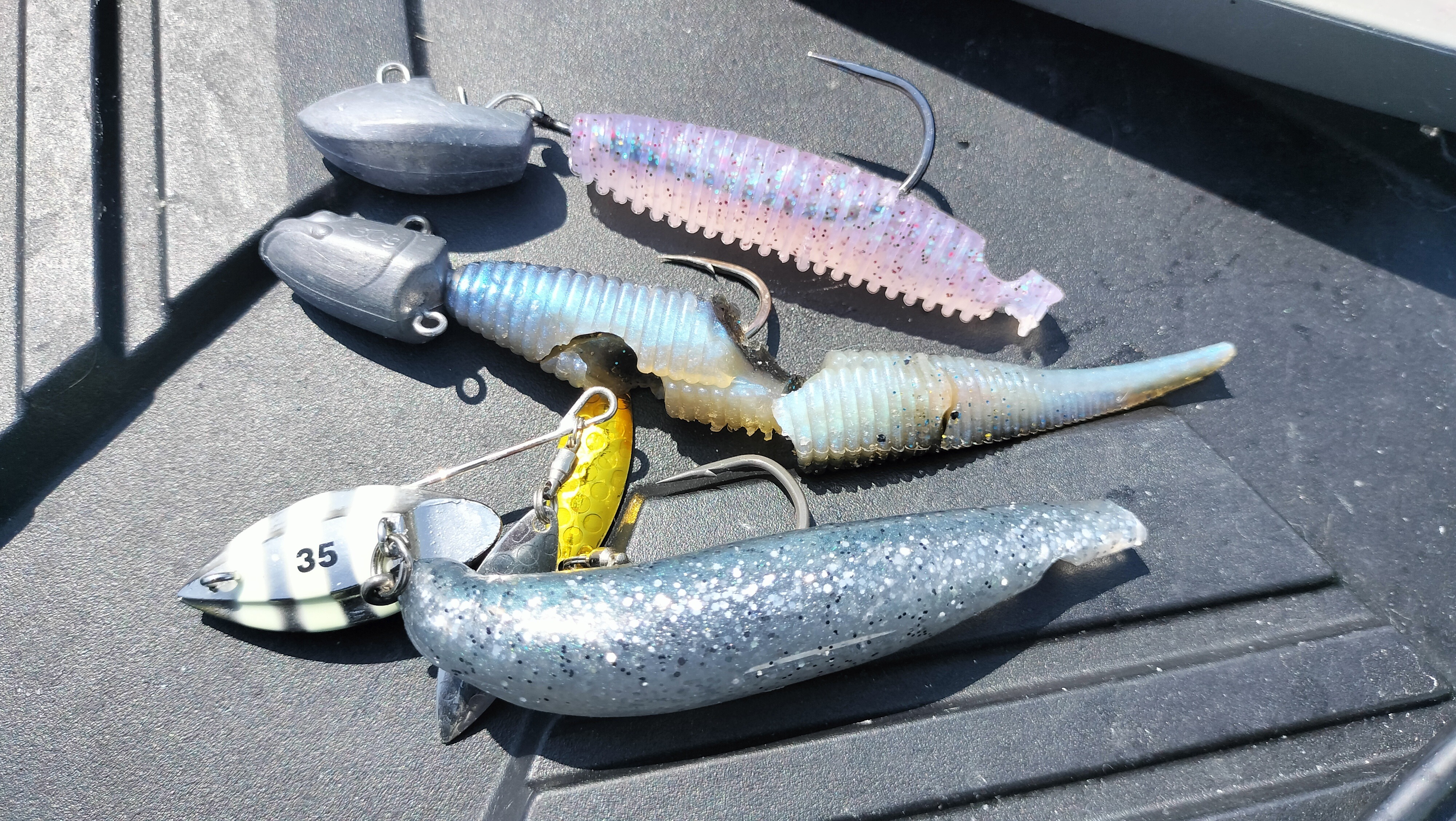 - JHスイミング:ジグヘッド30〜40グラム+4インチ前後のシャッドテールワーム フリーリグ:オフセットフック3/0〜4/0程度、シンカー1オンス程度+3.5〜4インチのグラブ、カーリーテイルワーム メタルジグ:ブレード系ジグ/スピンテール30〜40グラム程度(シマノ エクスセンス サルベージブレードやマキッパなど