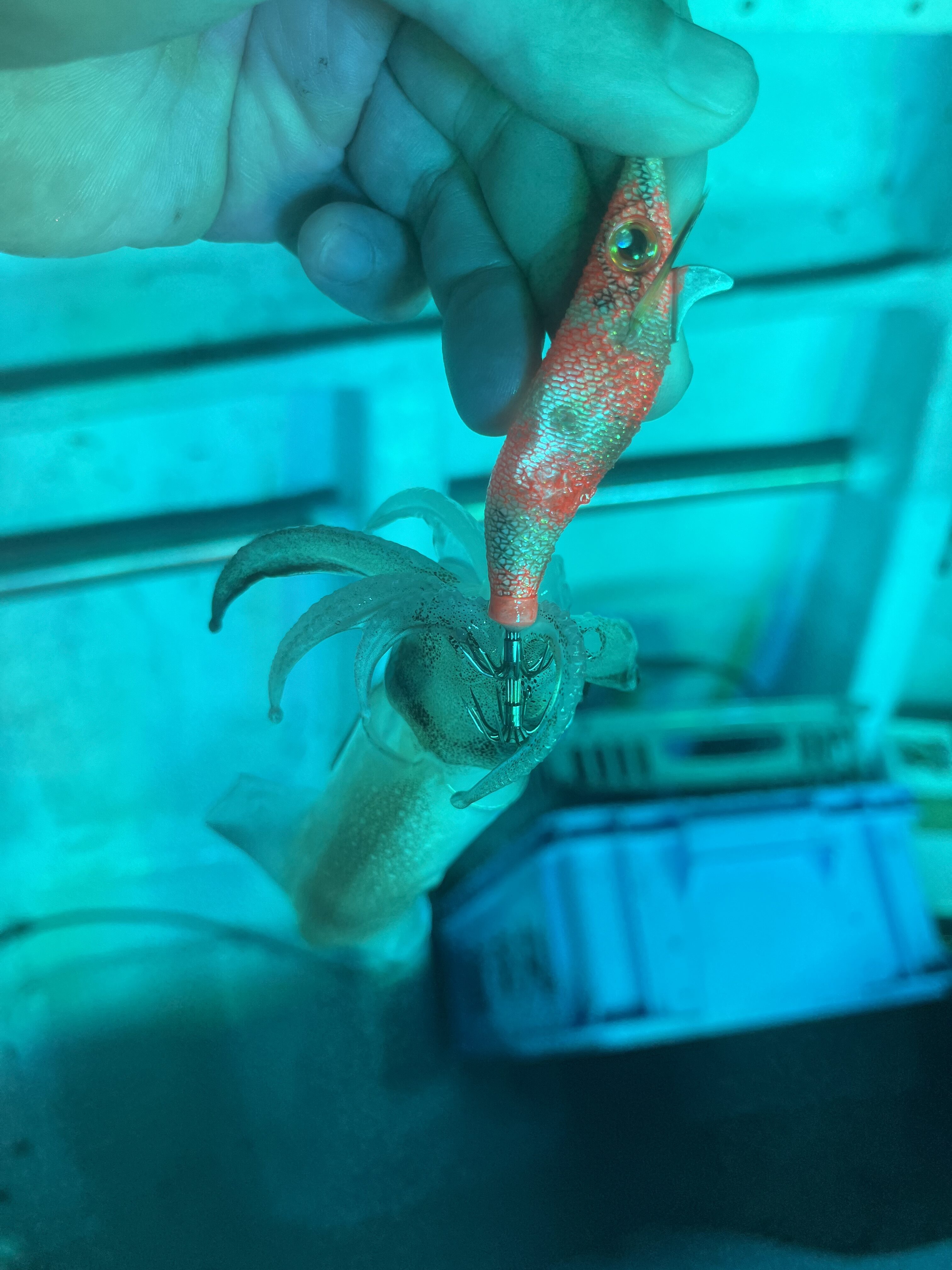 水深は90mの深場。ヒットレンジは40〜70mほどとのことだったのでまずはオモリグで幅広く探っていると幸先よくヒット🦑