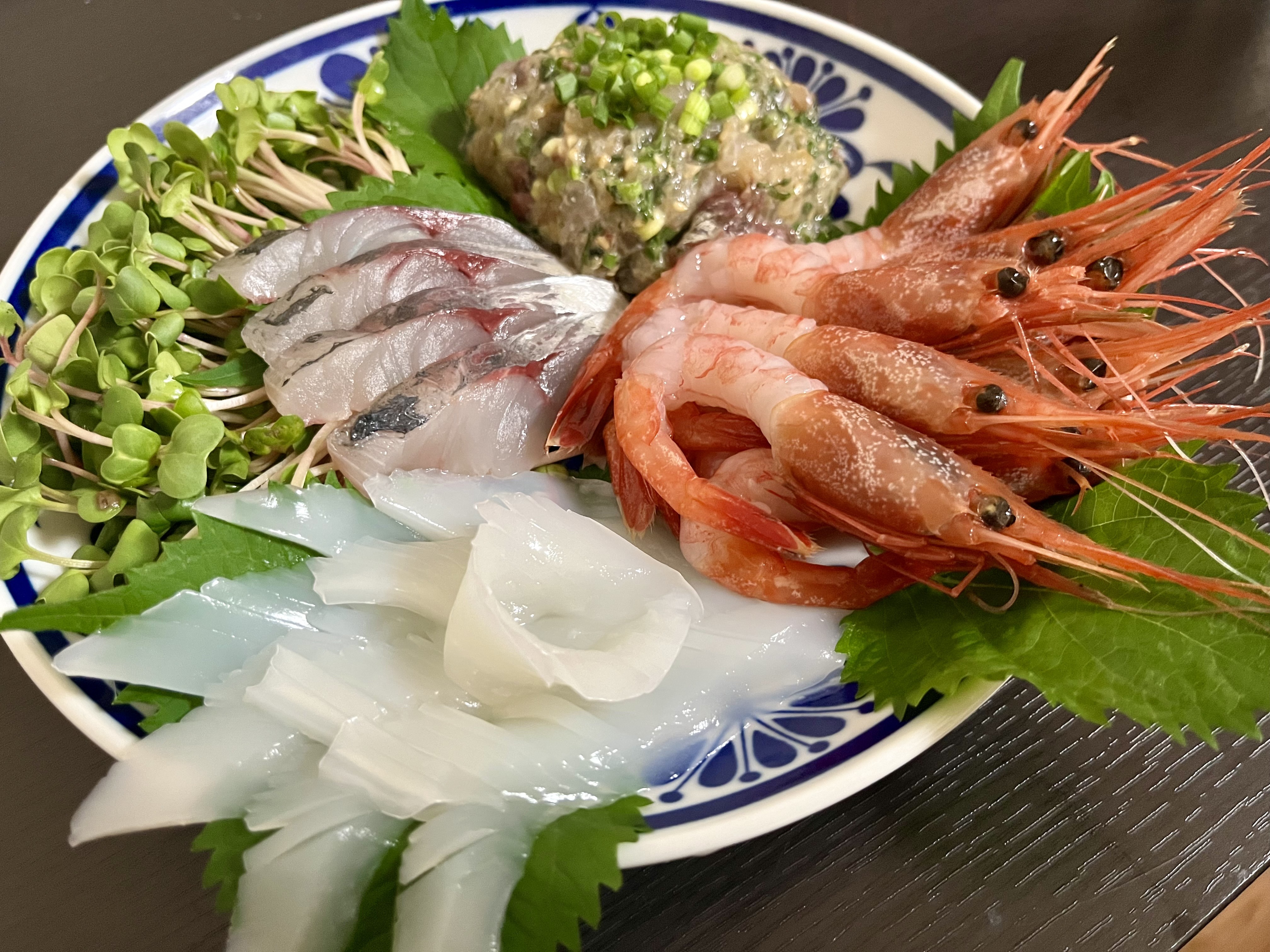竿がしら賞でいただいた甘えびと釣りたてのイカとアジで贅沢刺身盛り😋