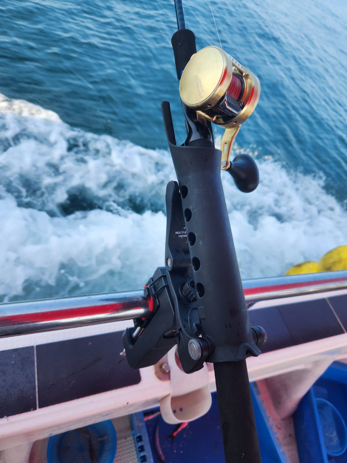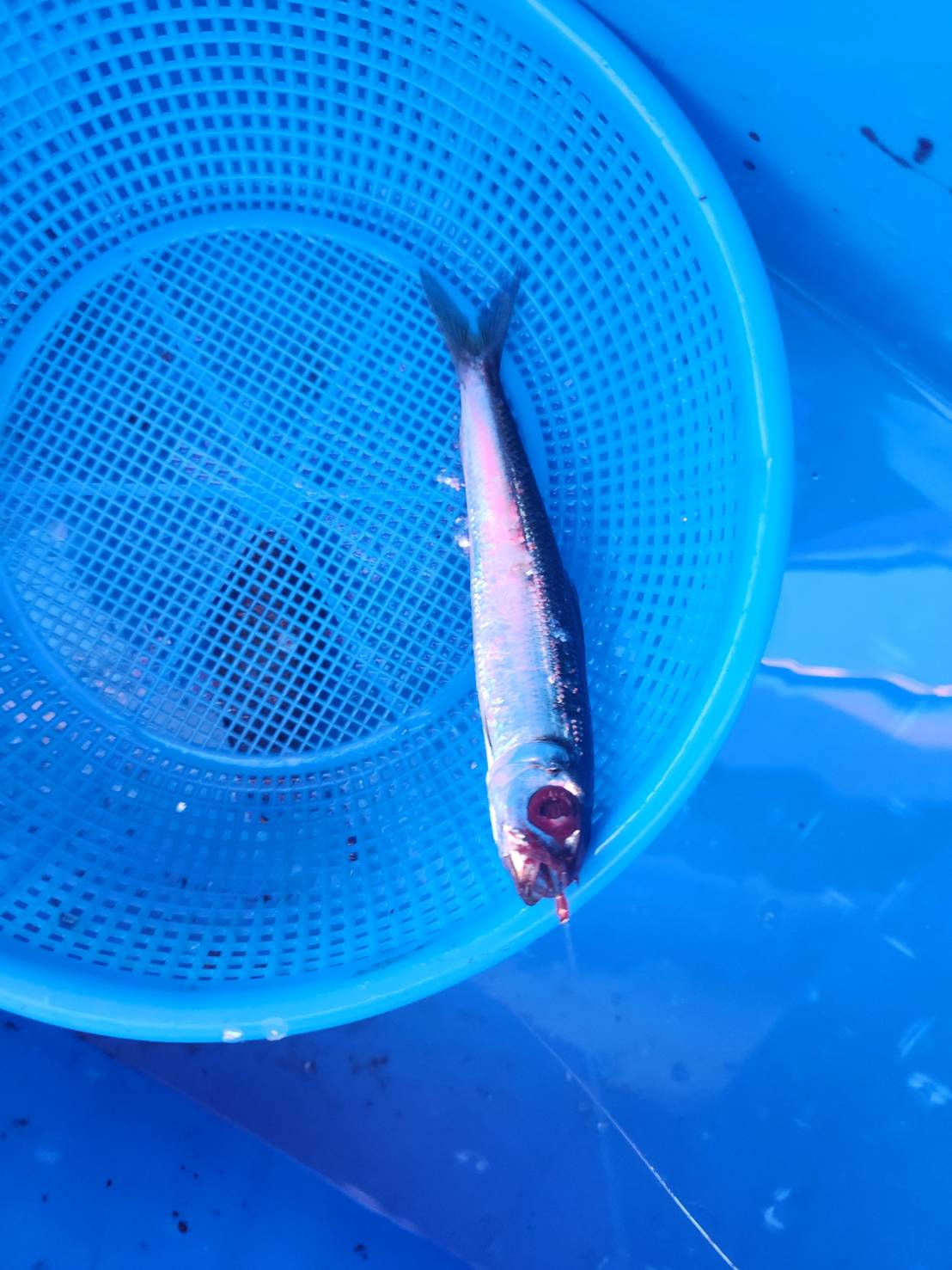 その後、朝マズメのラッシュが終了し、ベイトの掛かりが悪くなったところでポイントを少し移動。飲ませ釣りに変更、オモリは60号。エサは船長が用意してくれた豆アジ(たまに豆サバ、レアなイワシも混じってました)。