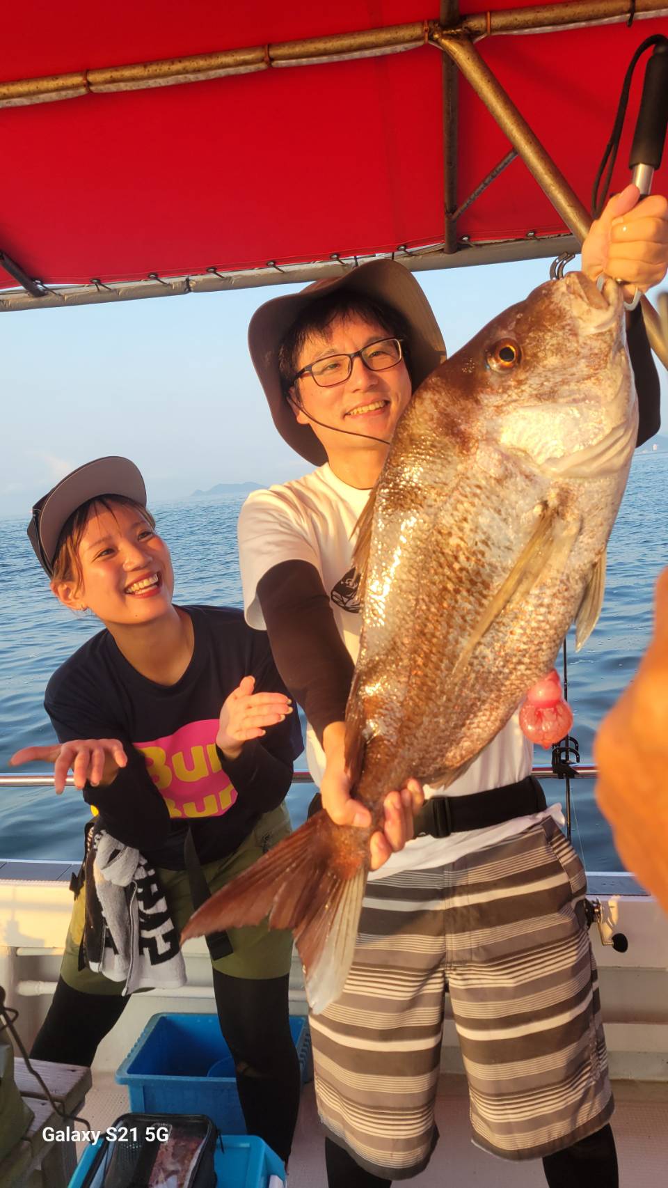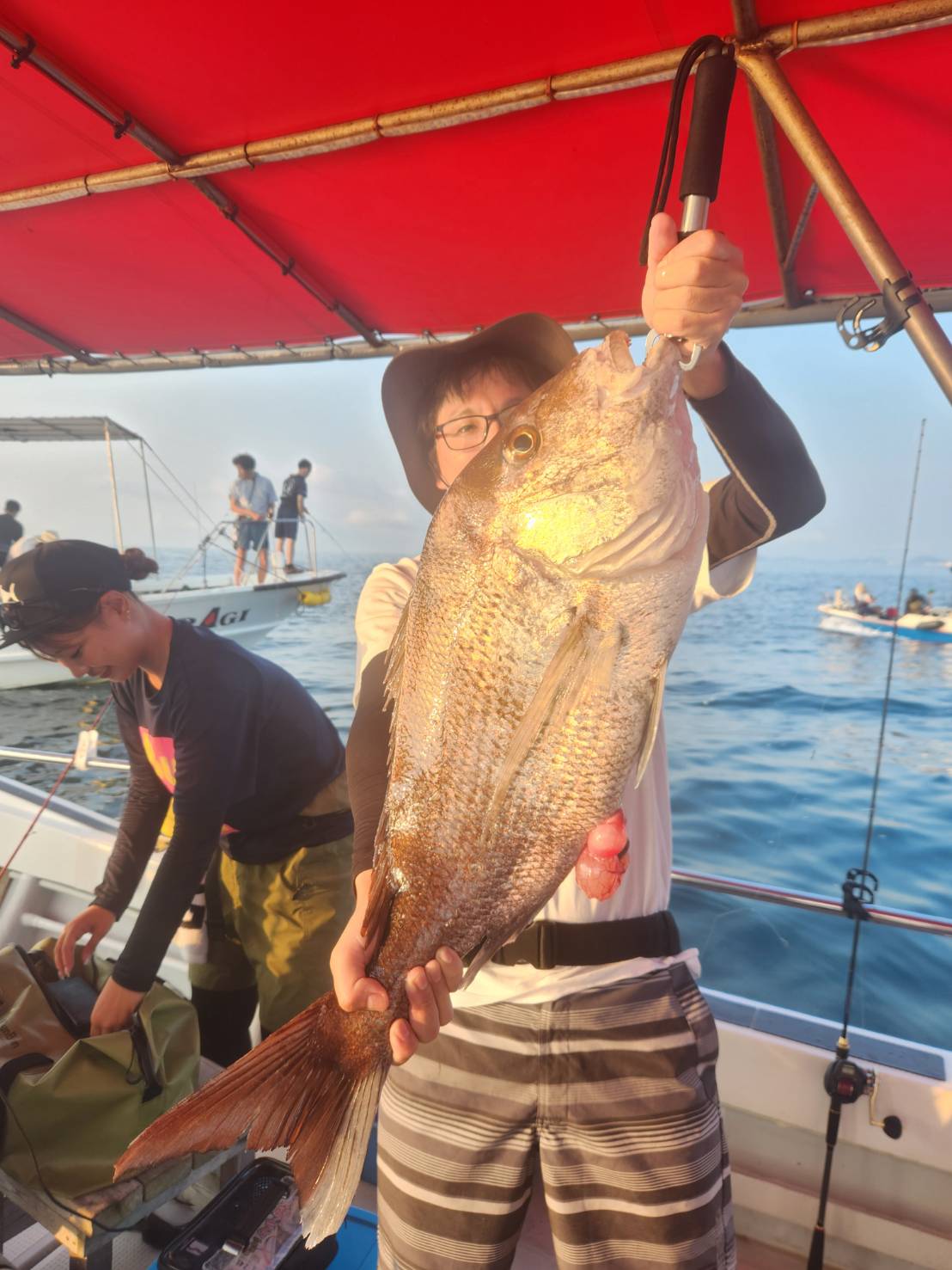 朝マズメのラッシュ中、青物とは違う引きに、本命のヒラメかと思いましたが、上がってきたのはデカいマダイでした。