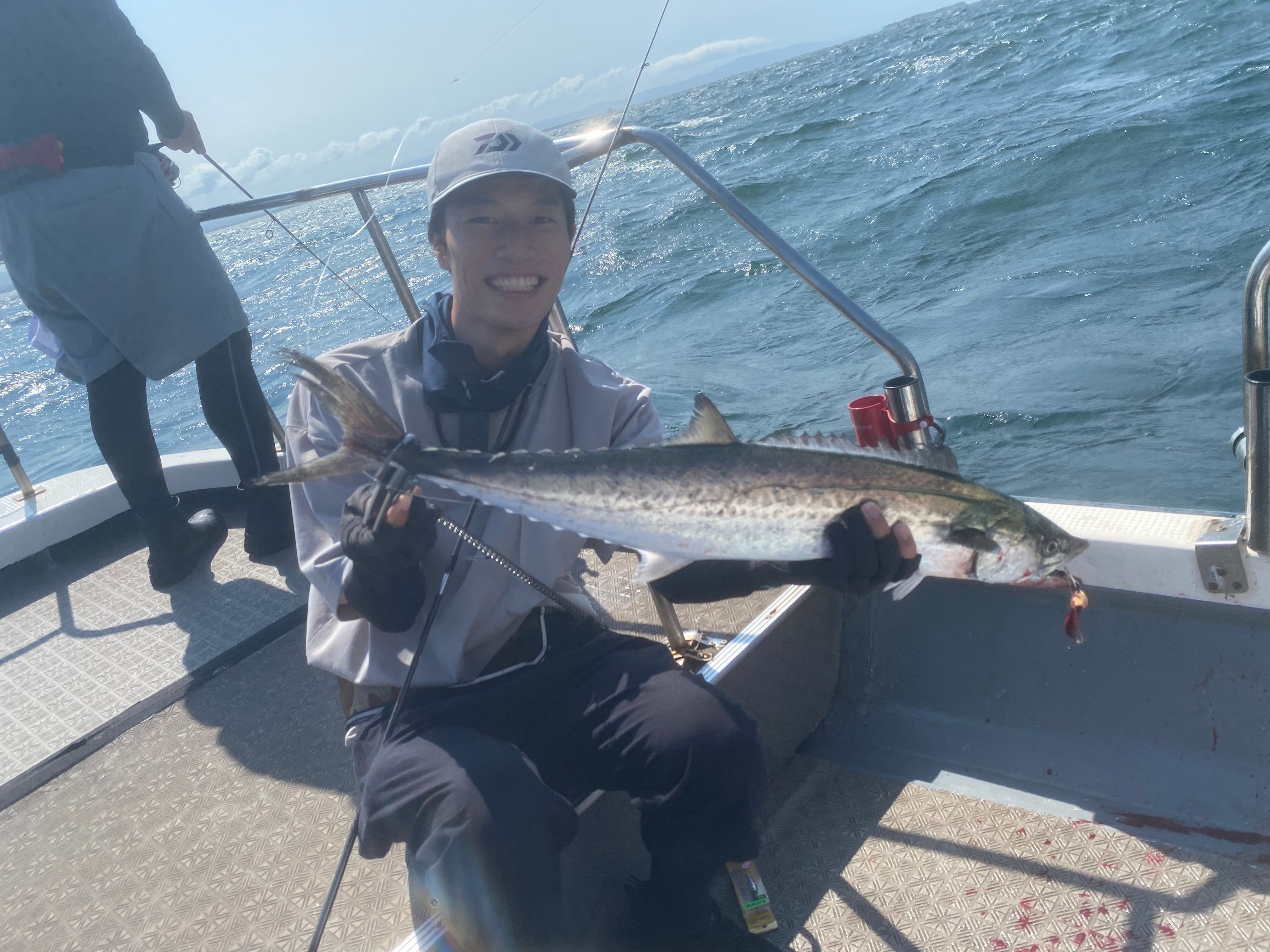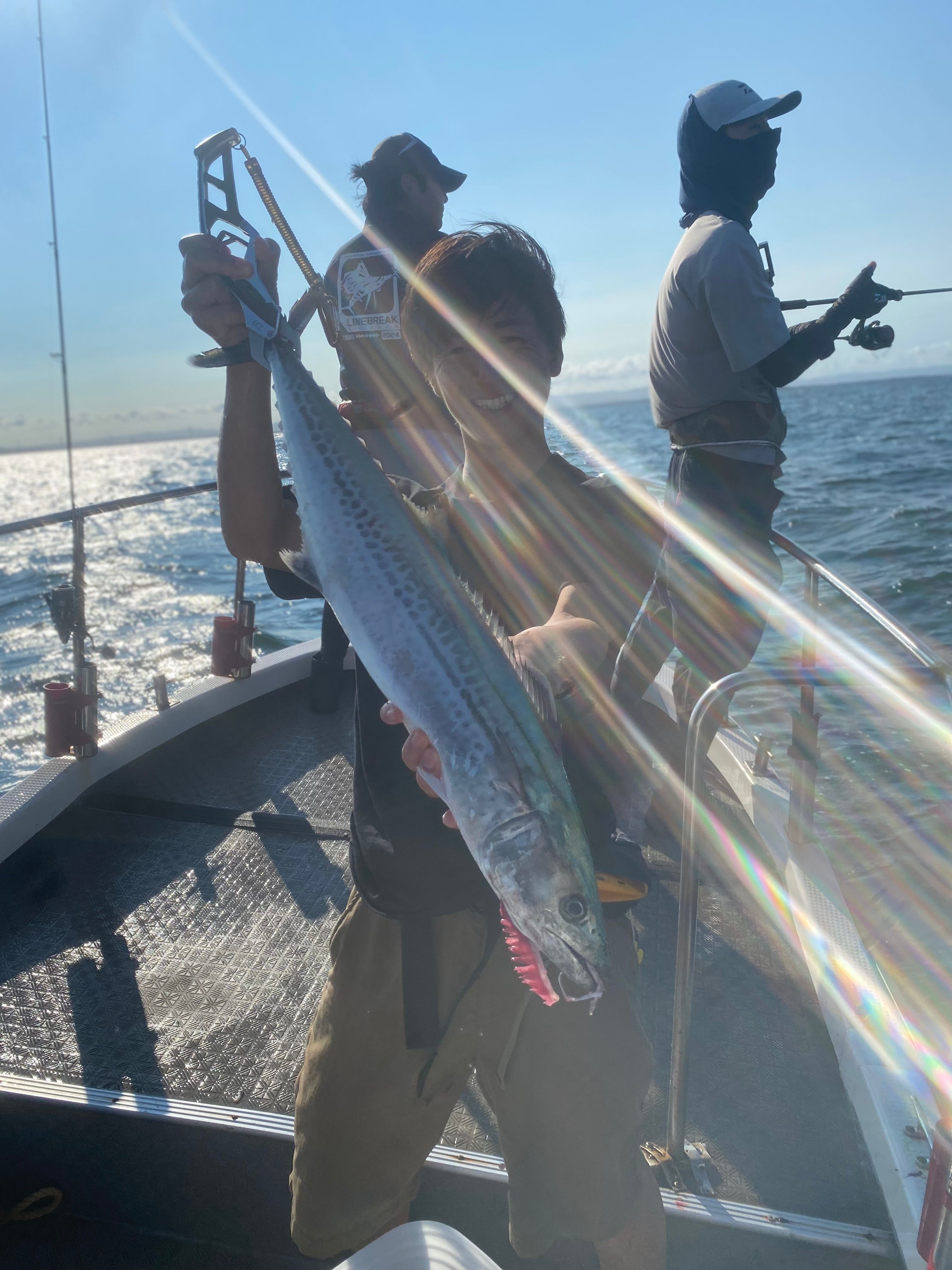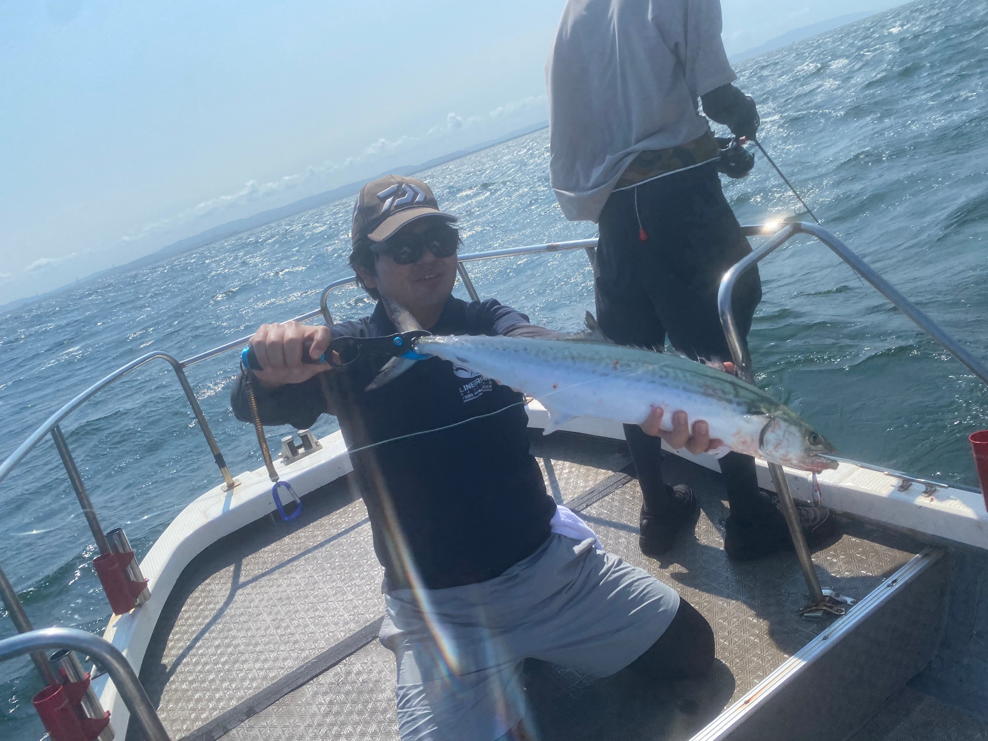 良い水しぶきを浴び、クールダウンしながらポイントに向かっていると僚船から1投目から釣れたよー!と無線が!これはもしやと期待を持ちつつポイント到着。まあまあなベイト反応が出ており、サワラの反応も出ている状況。早速釣りをスタートさせていくとE・S・Oが連発。そんな中キャプテンが投げるとあっさりHIT!さすがです!