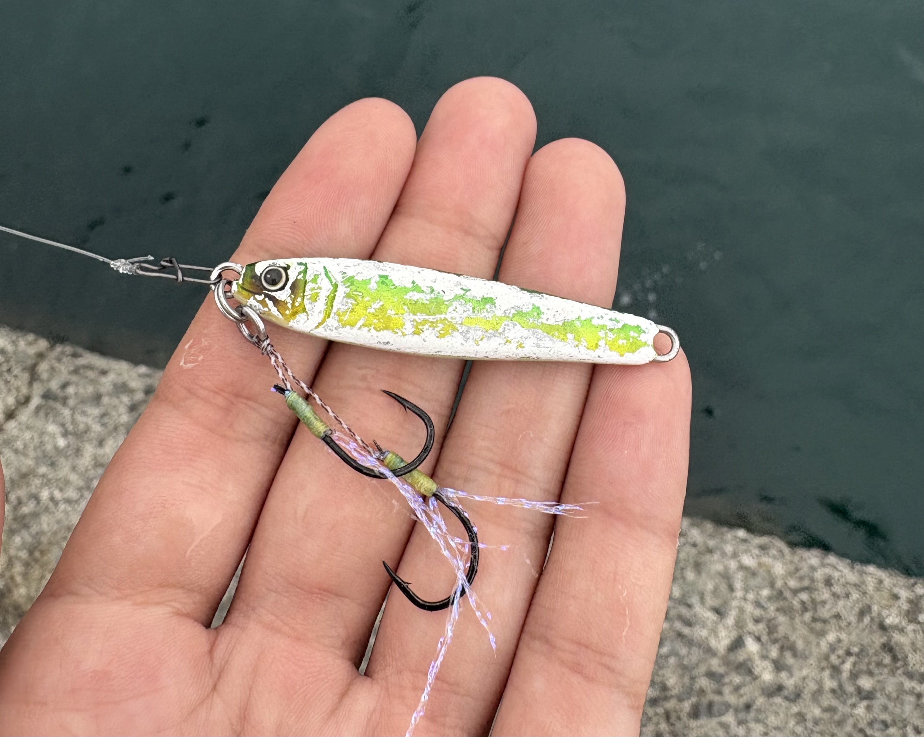 前日フックが鈍っていることに気づき、ソウダを想定し作ったティンセル付きフックを使用。 金、銀針で作れば、更にフラッシングを強められると思います!
