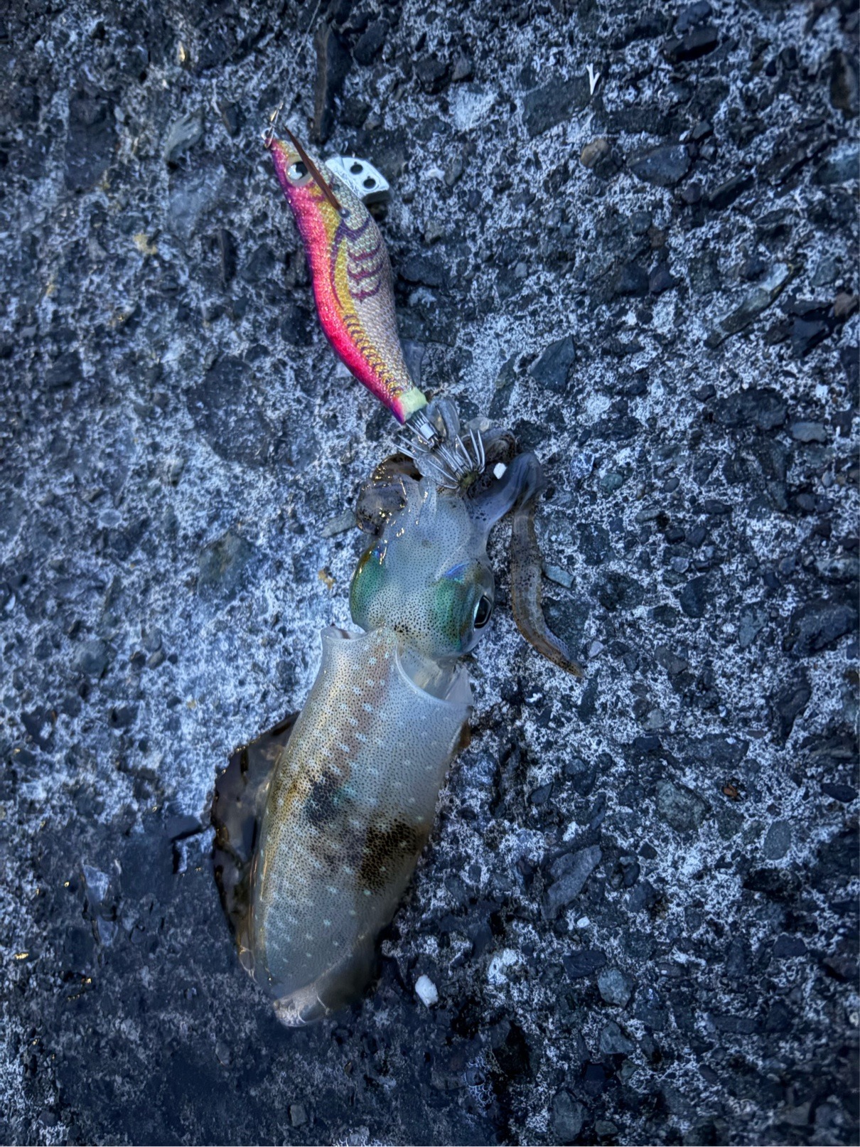 回遊魚は諦め、暗くなり始める前にエギングにシフト。 2.5号や3号のエギをしゃくってみます。 釣りは割といろいろやりますが、実はエギングが1番苦手な釣りです笑