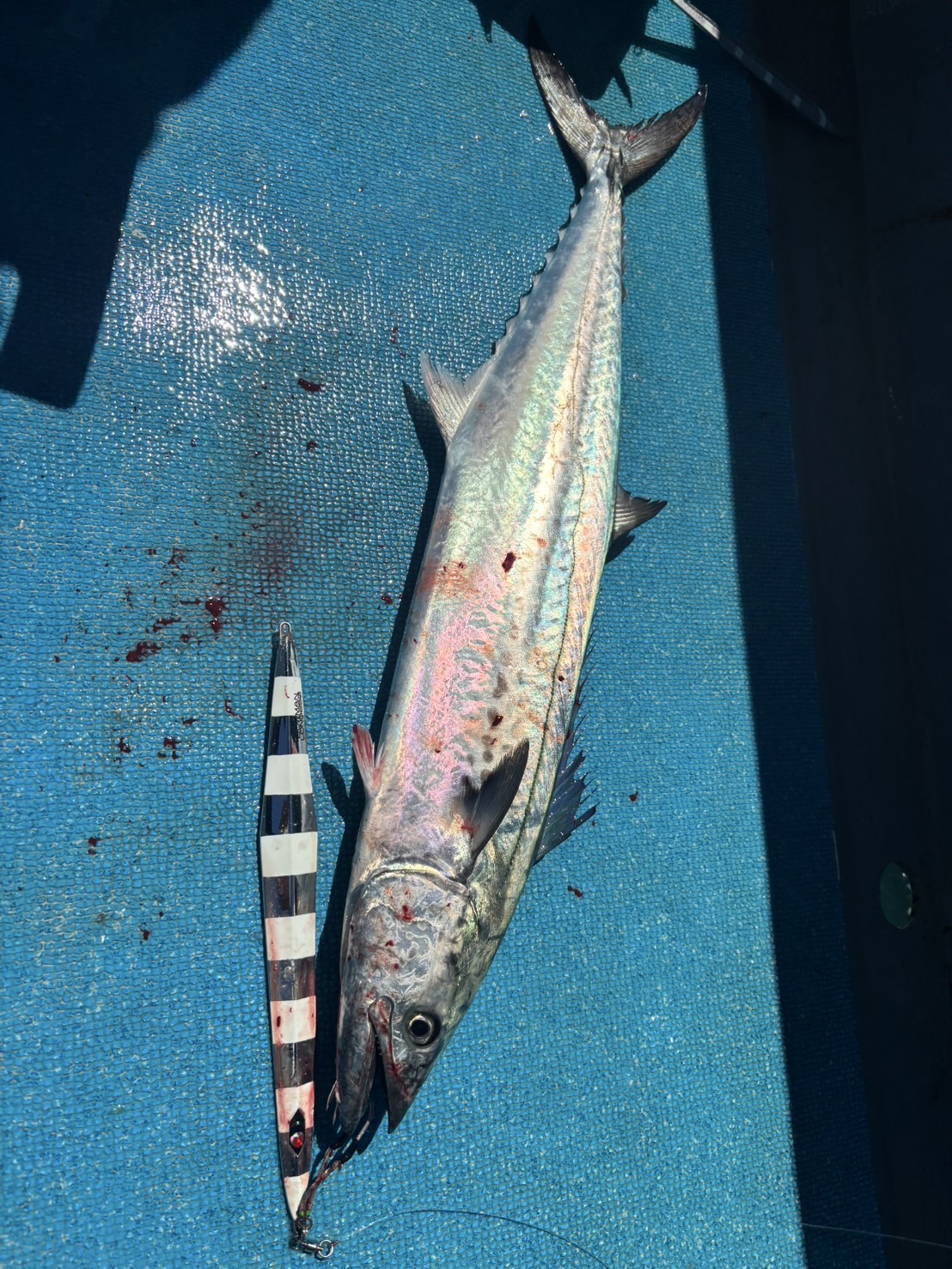 バチェラーを使用しても反応なし。ジグを変え、プレッジ ボウマンロング250gを使用したところ一投目でサゴシをキャッチ!