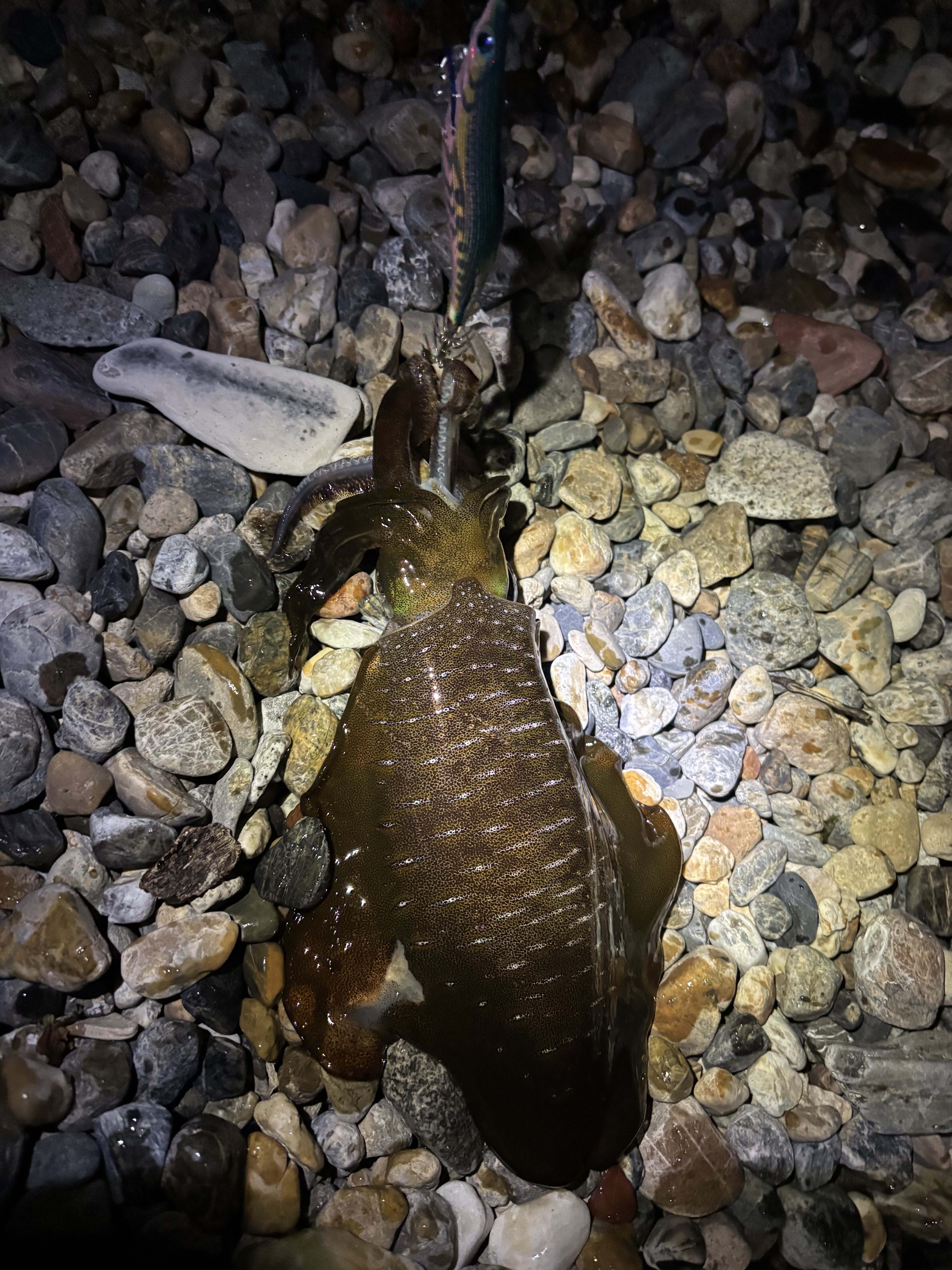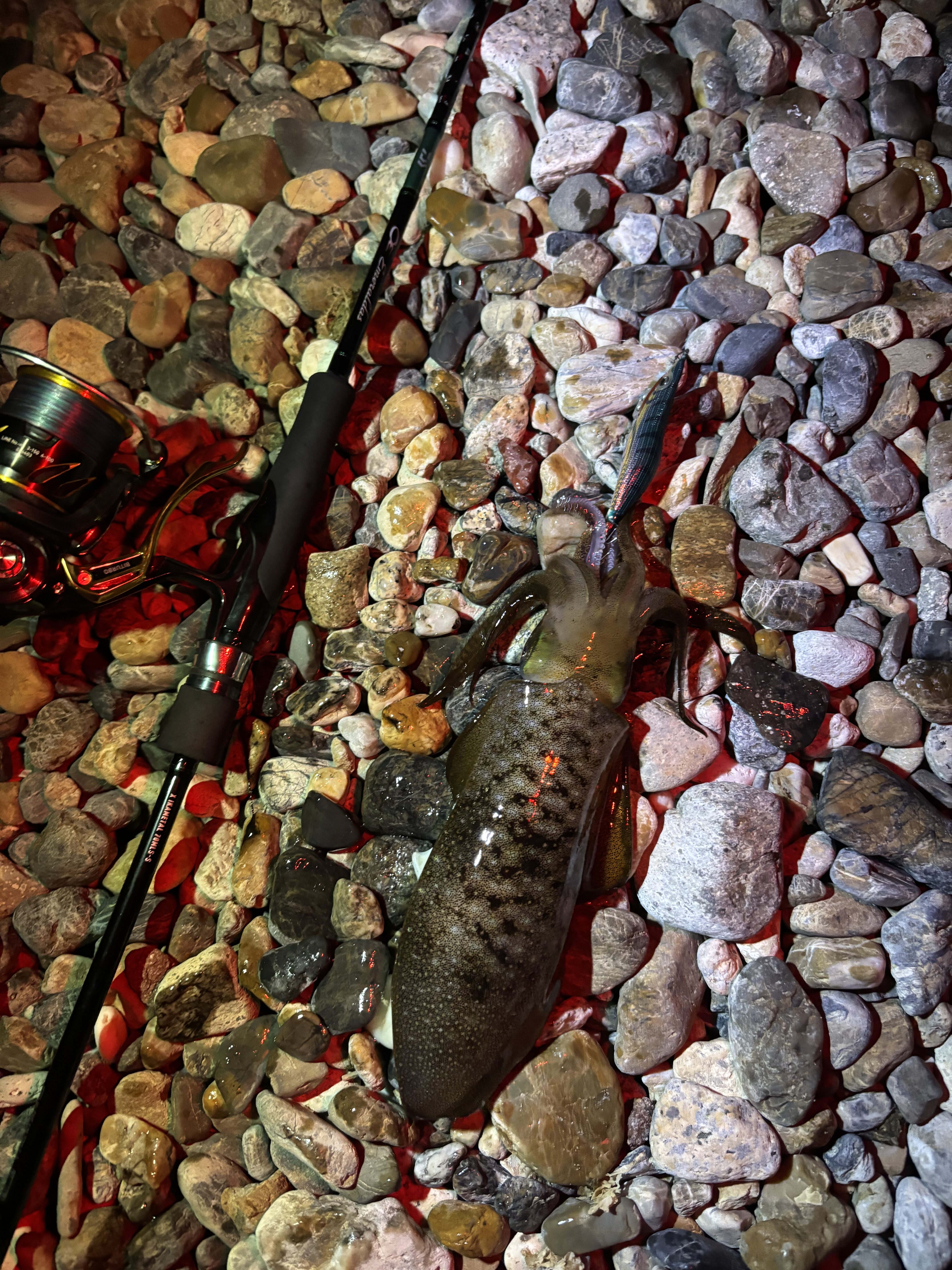 2025.09.10 印刷する 人生初のエギング‼️ 魚種 アオリイカ サイズ MAX520g 数 2杯 釣り方 ☆エギング 場所 兵庫県 天候 晴れ スタッフ 酒井 敦司 店舗 関西 リンクスウメダ店 釣行日 2025.09.08 コメント リンクスウメダ店の酒井です。今回は 人生初のエギング に挑戦してきました🦑 ポイントは兵庫県明石〜須磨エリア。満月大潮のタイミングで、19時頃からのトライです。 初挑戦スタート! 右も左も分からない初心者なので、同店スタッフ佐々木に教えてもらいながらの釣行。 キャストして底に着かない程度のスピードで巻いてくると…なんと、同行した釣りデビュー初日の釣りガールが 一投目でヒット‼️ 上がってきたのはこの時期には珍しい 520gの良型アオリイカ。秋の走りシーズンにこのサイズはなかなか釣れないとのこと。羨ましい…! そんな光景を横で見ていると、自分にもアタリが。イカ特有の「ムニムニ…」とした引っ張り感!しかし、うまく乗せきれず💦 「これは奥が深い…」と思っていると、次のキャストで再びアタリ!今度はしっかりフッキングが決まり、350gのまずまずサイズをキャッチ‼️ さらに新子サイズも追加でき、少しずつ釣り方の感覚が掴めてきました。 潮止まりになり回遊も減ってきたところで納竿。「あと1ヶ月ほど経てば型も良くなり、数も狙える」とのことで、これはリベンジ必至ですね🔥 今回は専用タックルを持っていなかったのでオモリグロッドを代用。秋イカ用の軽めのエギ+小場所だったので、特に問題なく対応できました。ただし…専用タックル購入は要検討です👀 リンクスウメダ店には アオリイカエギングに精通したスタッフ が数名在籍。実際に釣果もバッチリ出していますので、エギングにチャレンジしたい方はぜひお気軽にご相談ください✨ 使用した釣具 ロッド ダイワ エメラルダスX イカメタル 70MLS-S リール ダイワ ラグザス2500LBD エギ ヤマシタ エギ王K2.5 3.0 ノーマル・スーパーシャロー 軍艦グリーン
