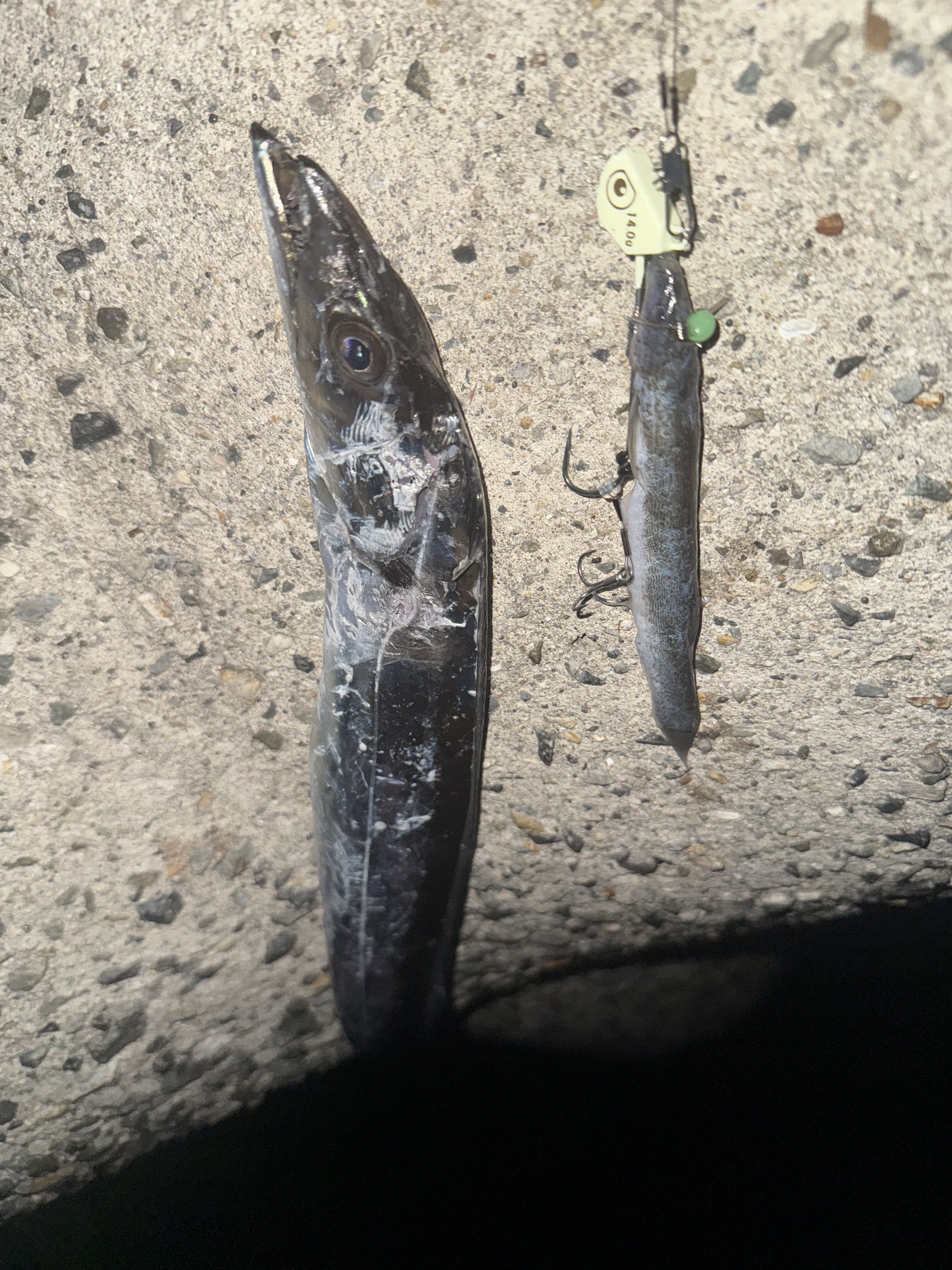 上がってきたのは指3.5本ほどのタチウオでした。