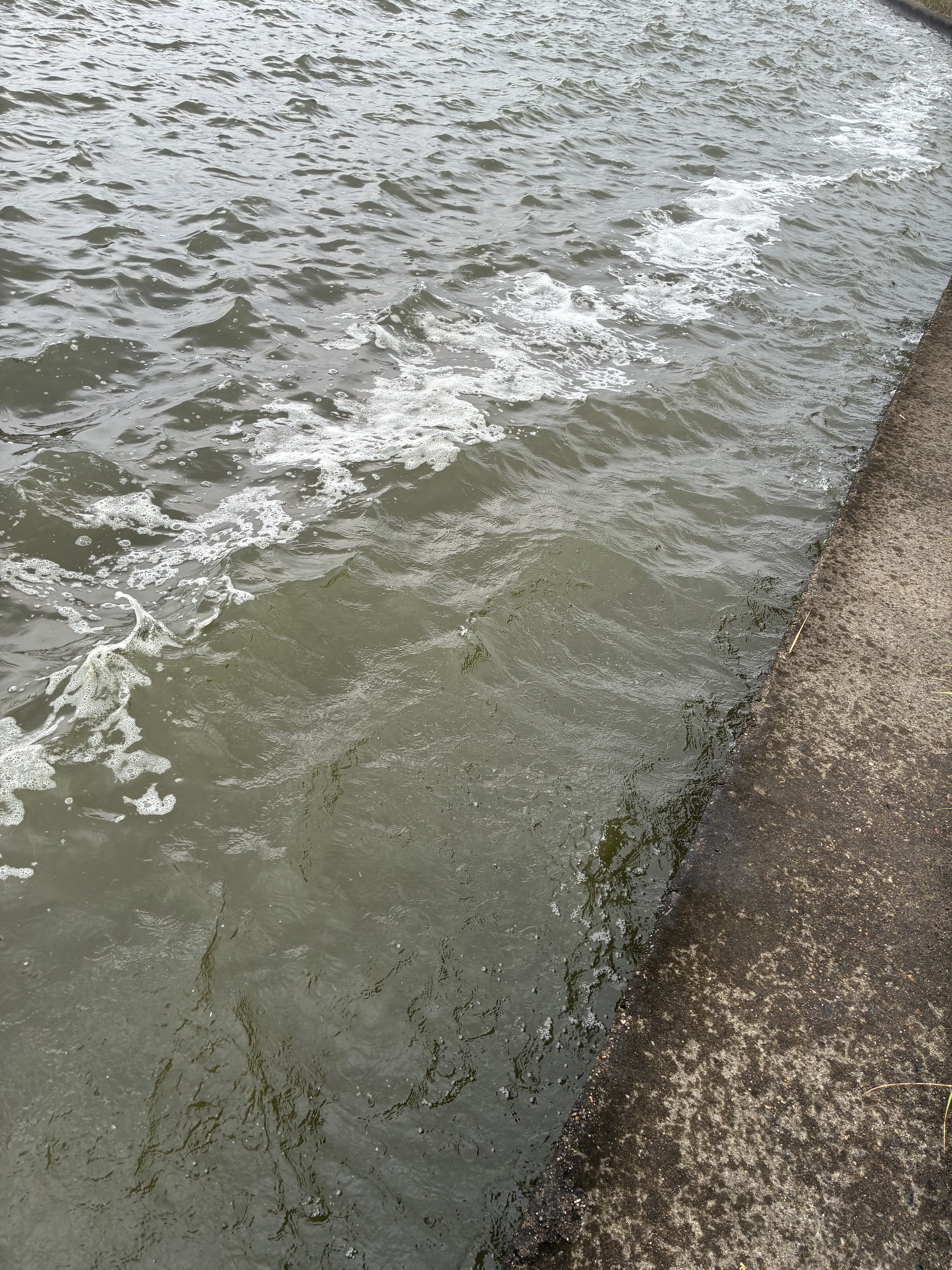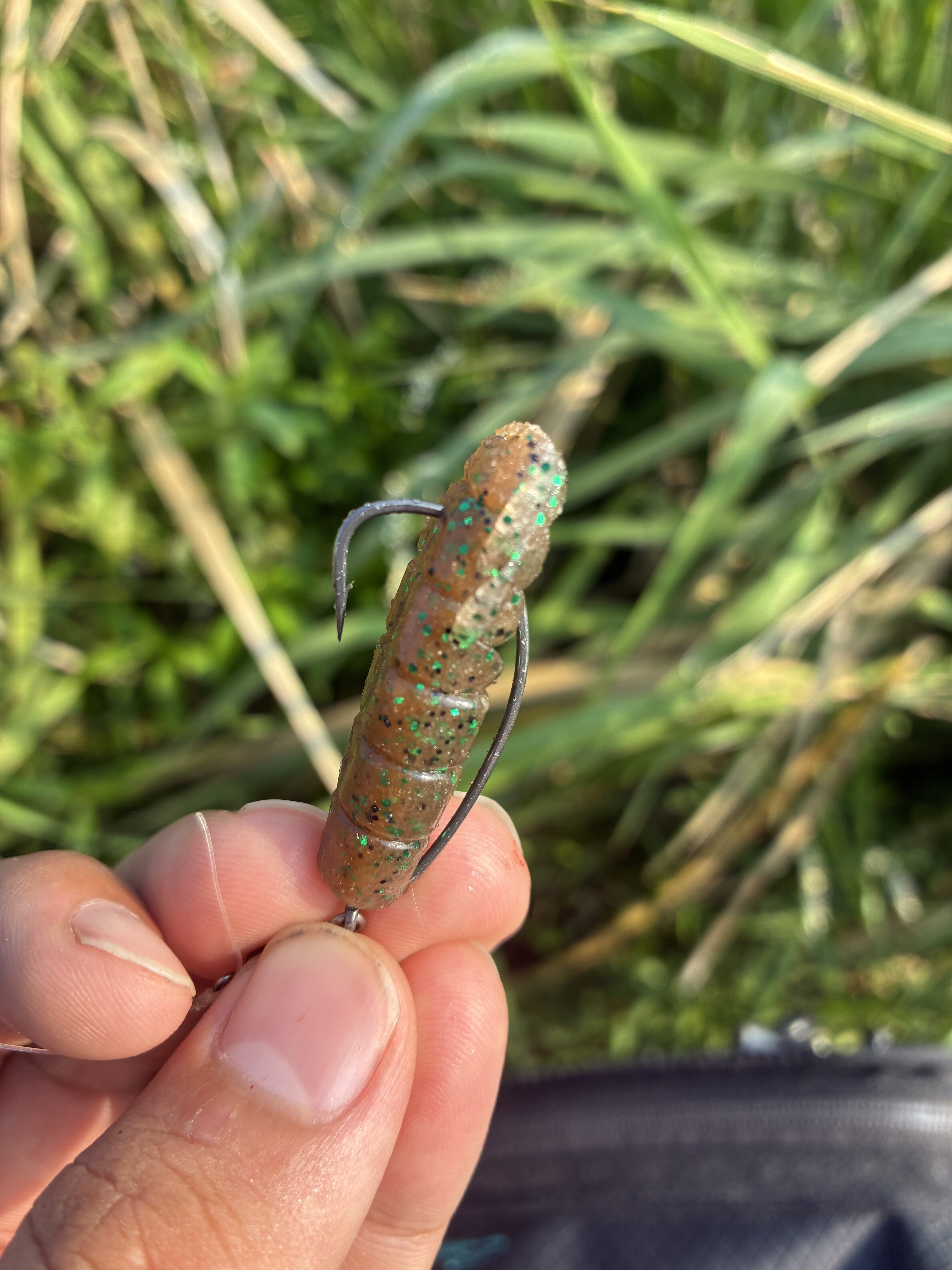 次は本流側の方に行き、護岸際にはモエビが多いのでサイコロラバーロングリーダーのリアクションダウンショットで丁寧に水門、護岸を攻めて行きます!するとグッと重さが乗ります!が、小バスがチラッと見えてバレてしまいました笑