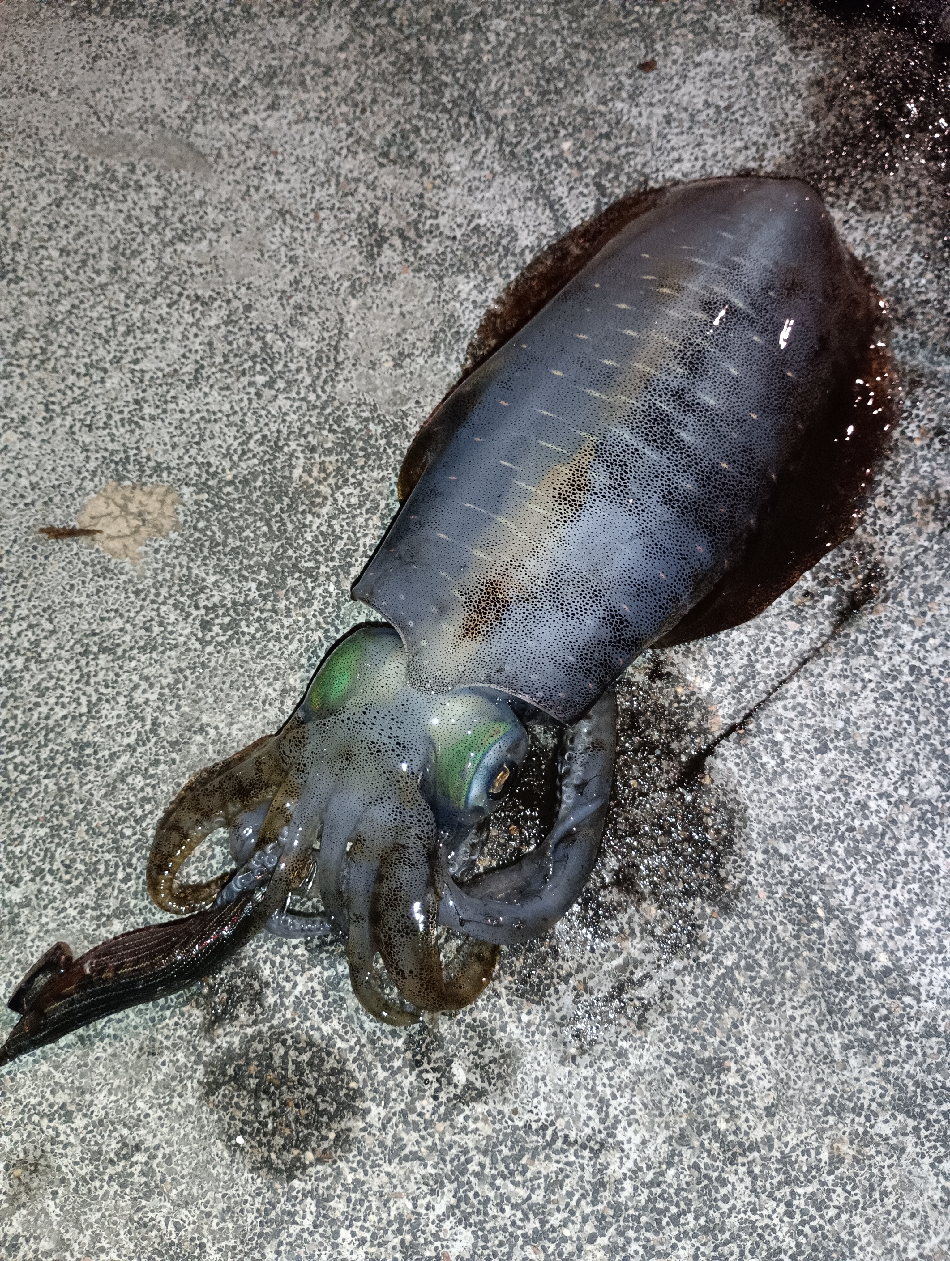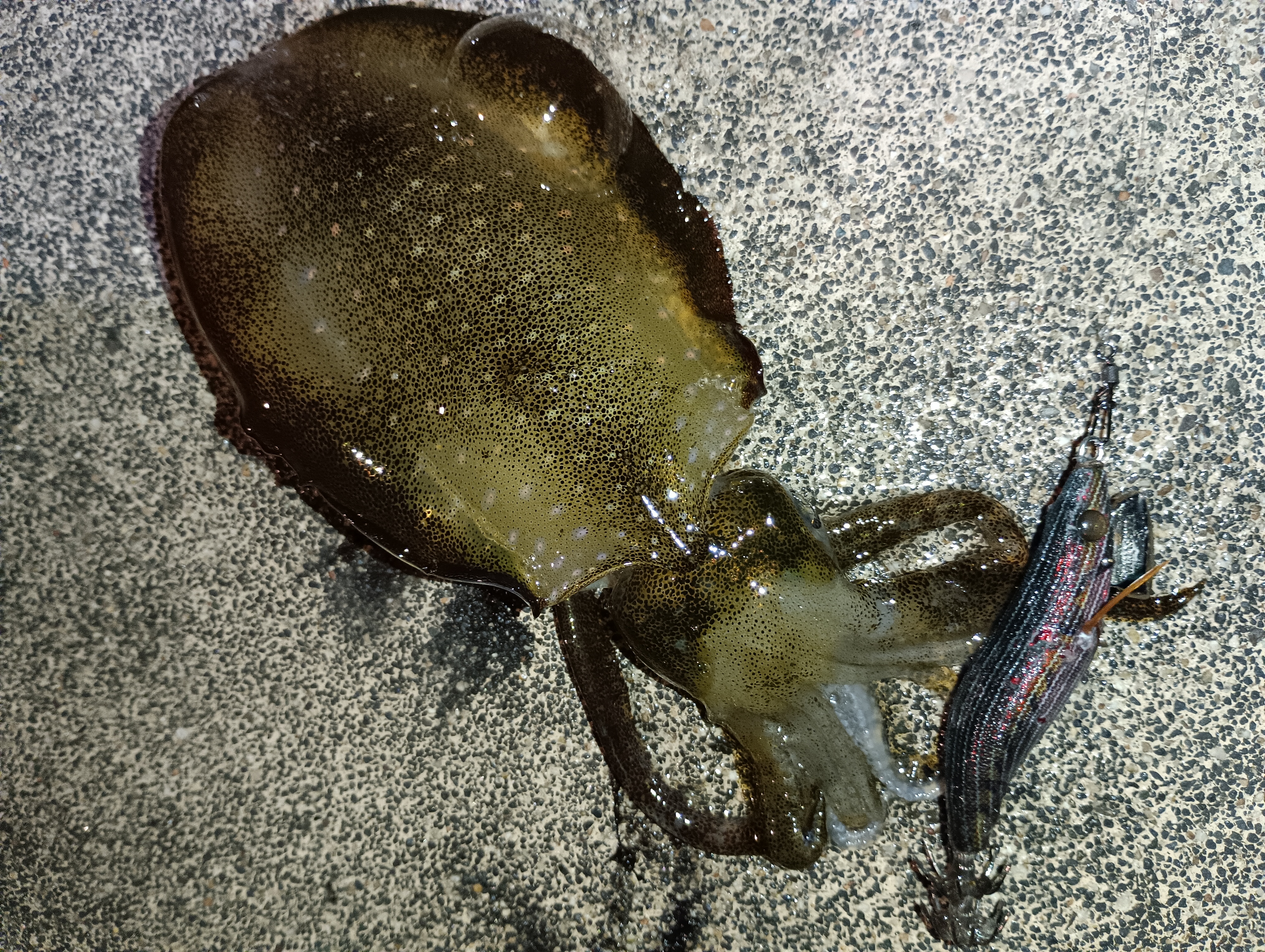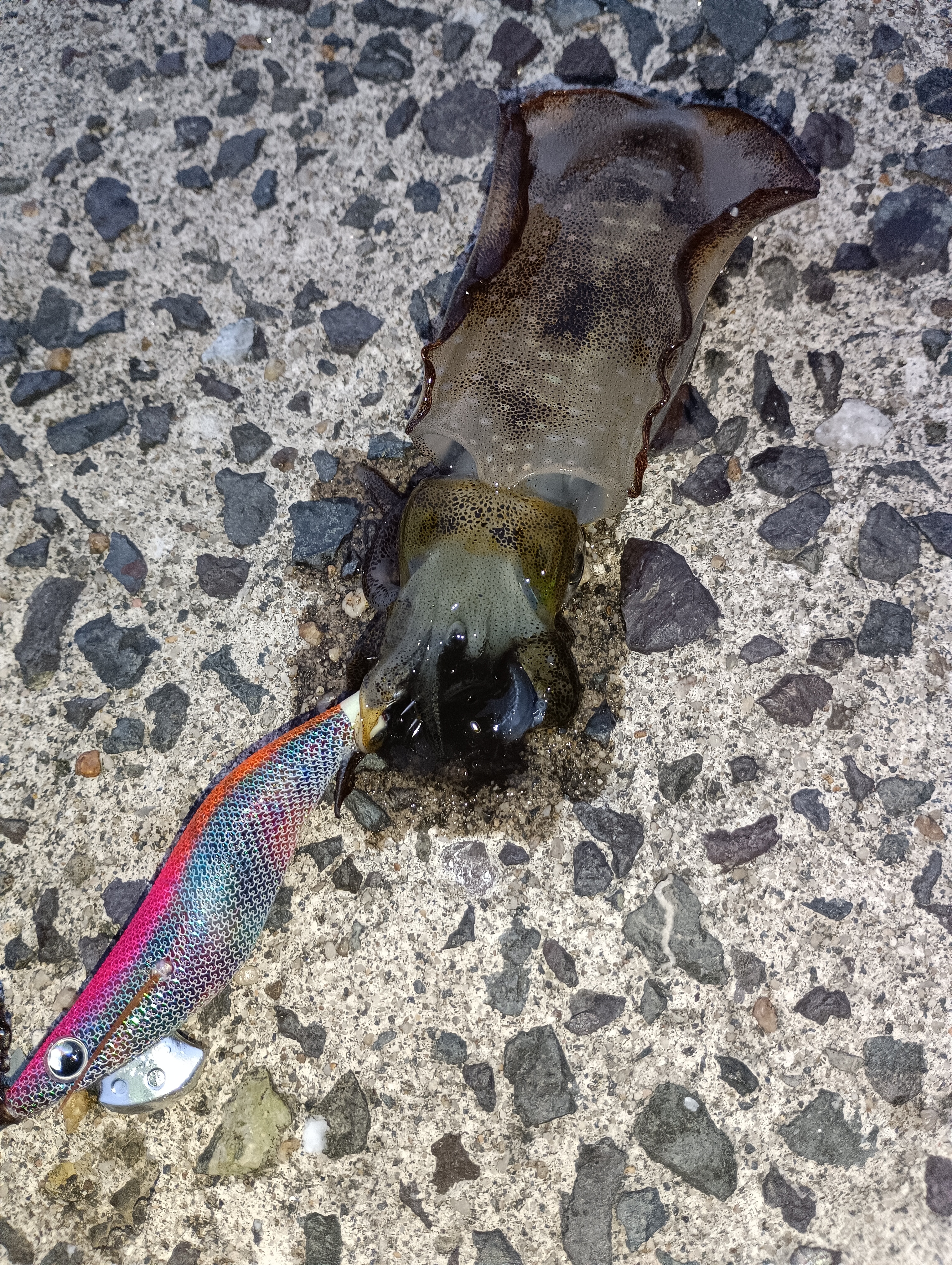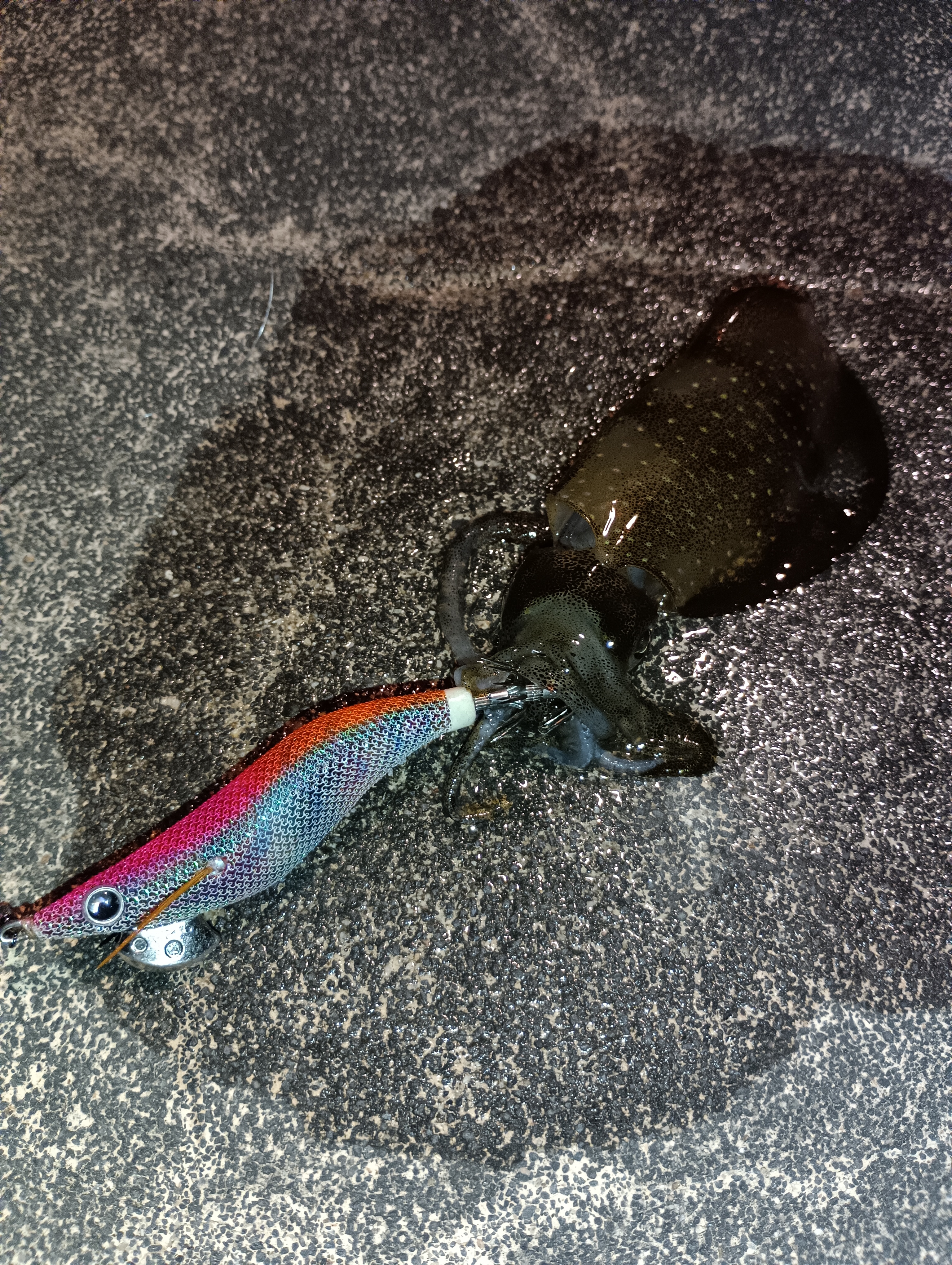 前日からの雨で濁りも入っているので、ボトムにいるパターンかと、エギ王ライブ2.5号であまり動かさず、ボトム常に意識してやっていると、一投目よりHIT。