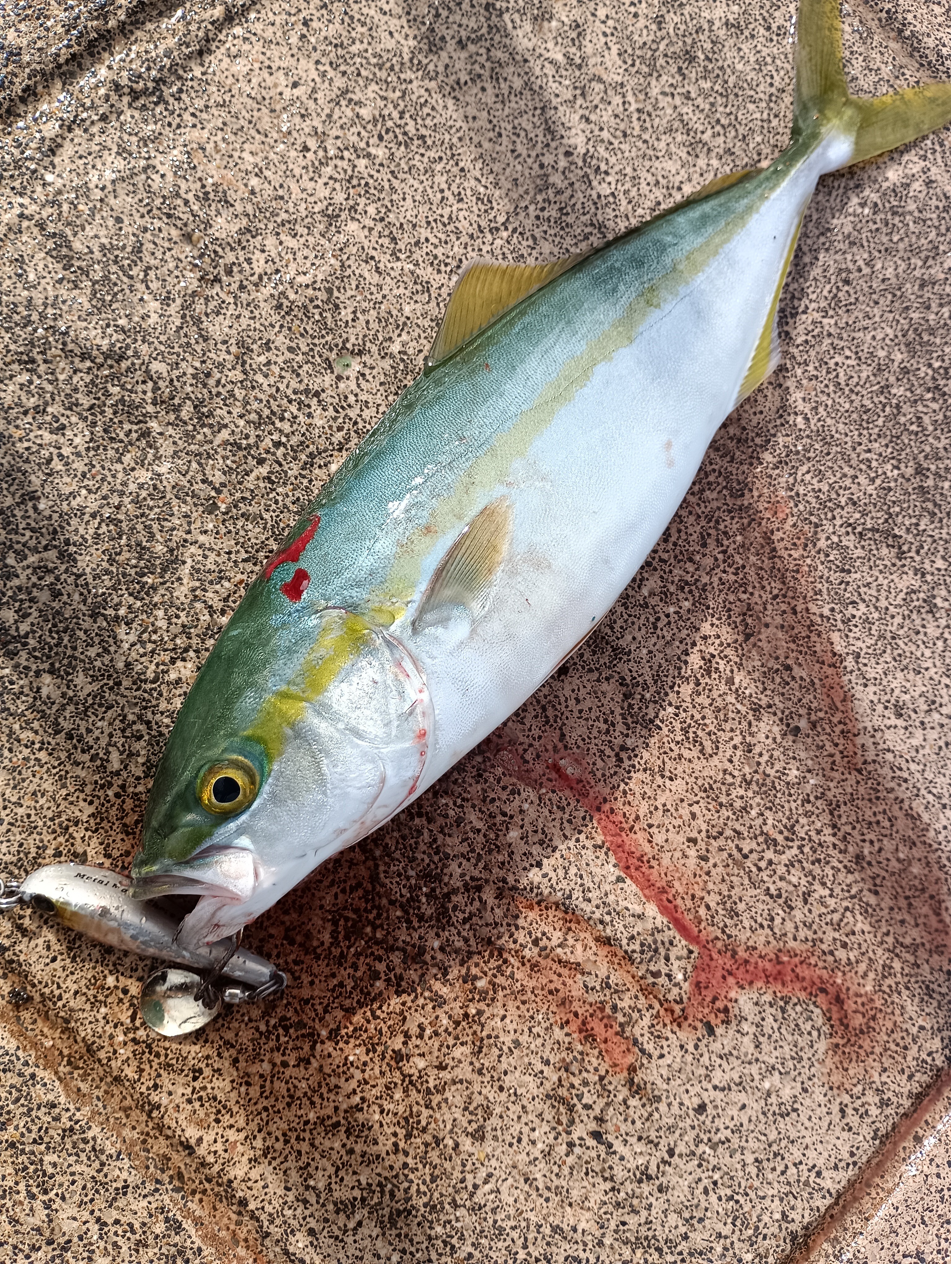 また少し仮眠した後、海の様子見ているとかなりベイト多く、青物回っていないか気になったので、メタルマジックを投げ、様子見てみるとボトムからの超早巻でHIT。