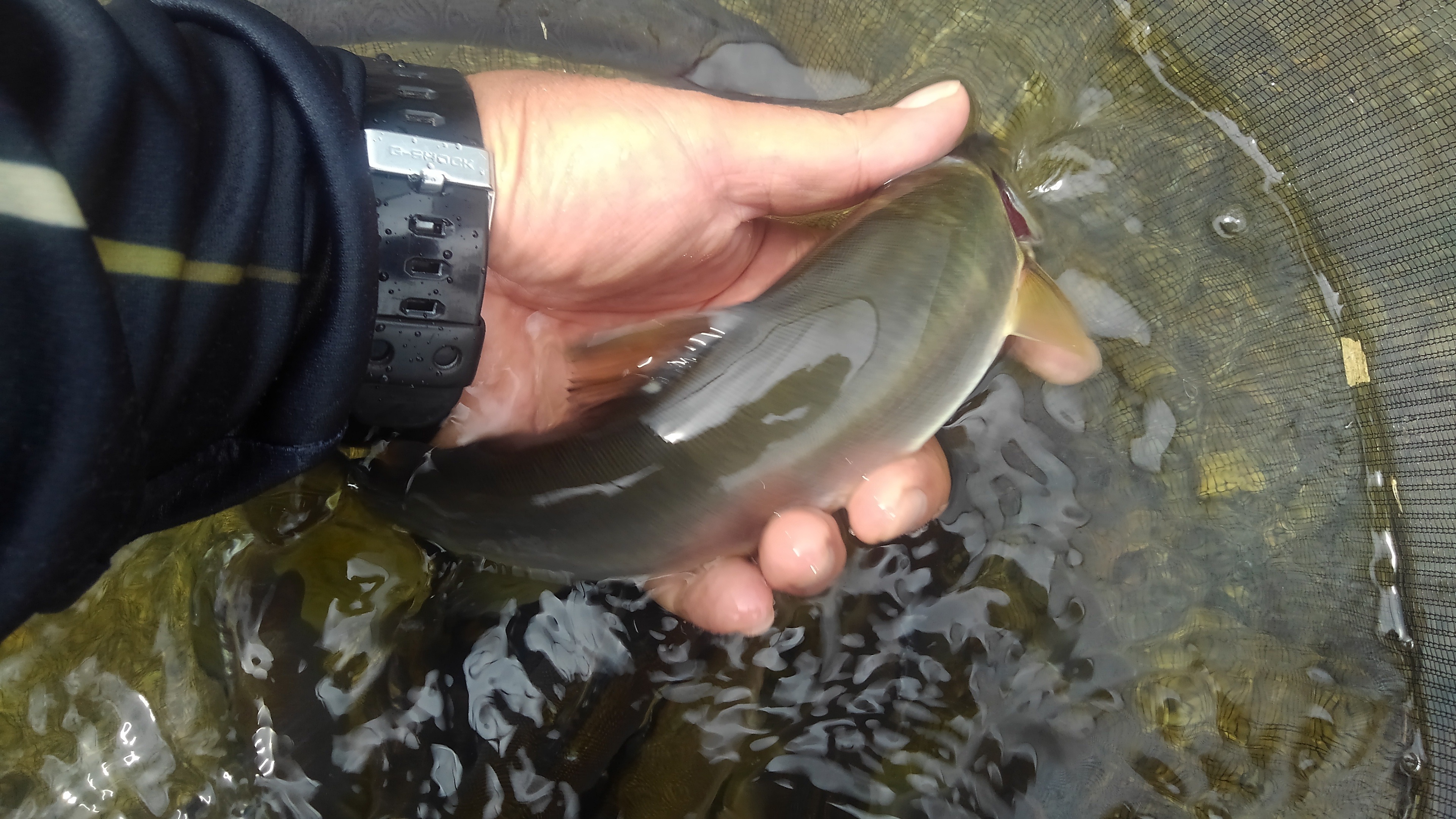 二日目は、例会が入ってるようで人だらけ。かろうじて空いてるポイントへ。オトリを良さそうなとこに差し込むとガツーン!またまた、一匹目からデカイの掛かって、25センチのオトリにちょうどいいサイズに入れ替え成功!こっからポンポンとデカイの連チャンして26~27センチまで5連発して、すっかり満足!