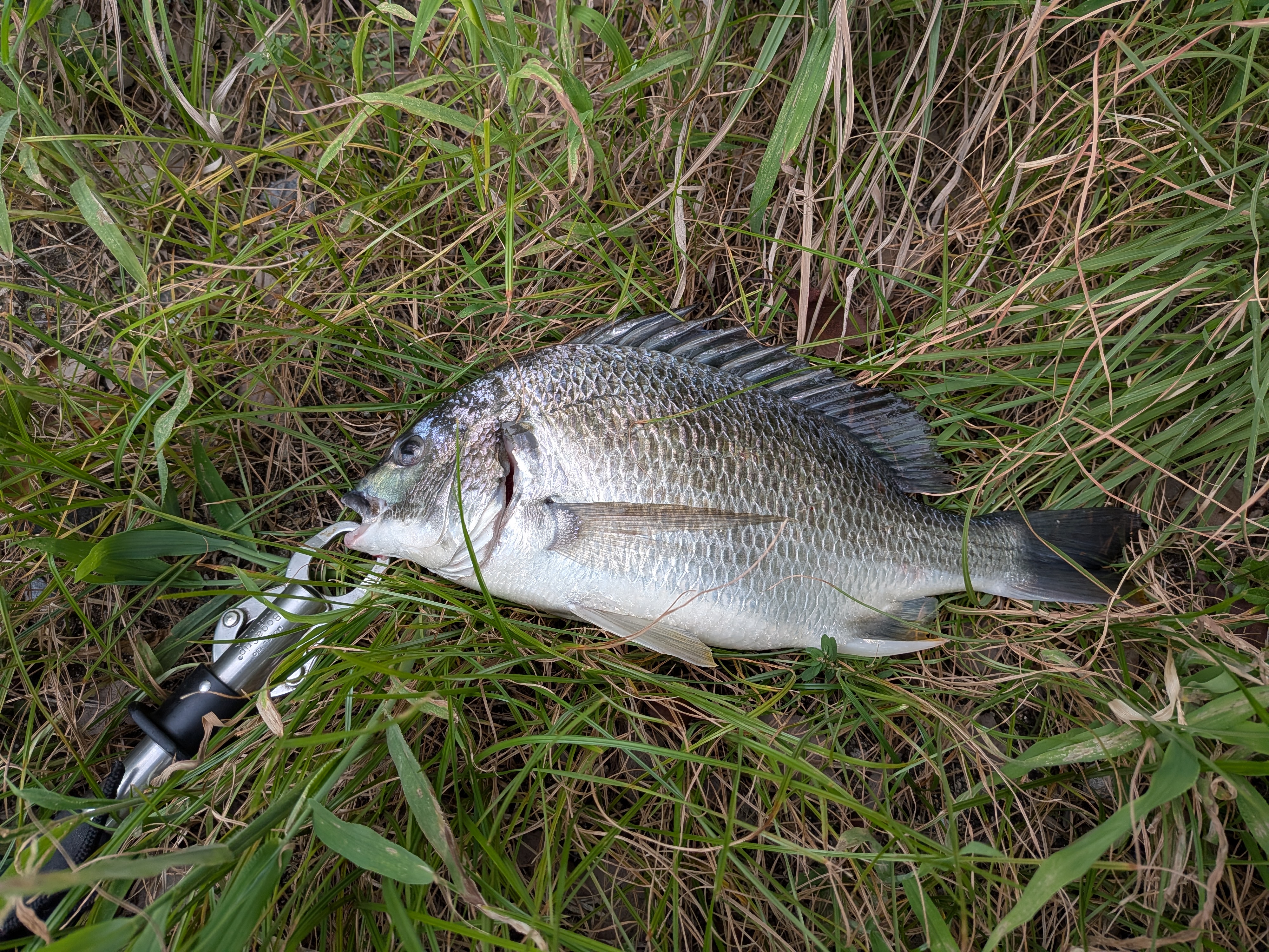 その後もアタリがわからずワームがズレたり、あわせ遅れでかからないのが続きましたが、なんとかもう1枚おんなじサイズのキビレをゲット!