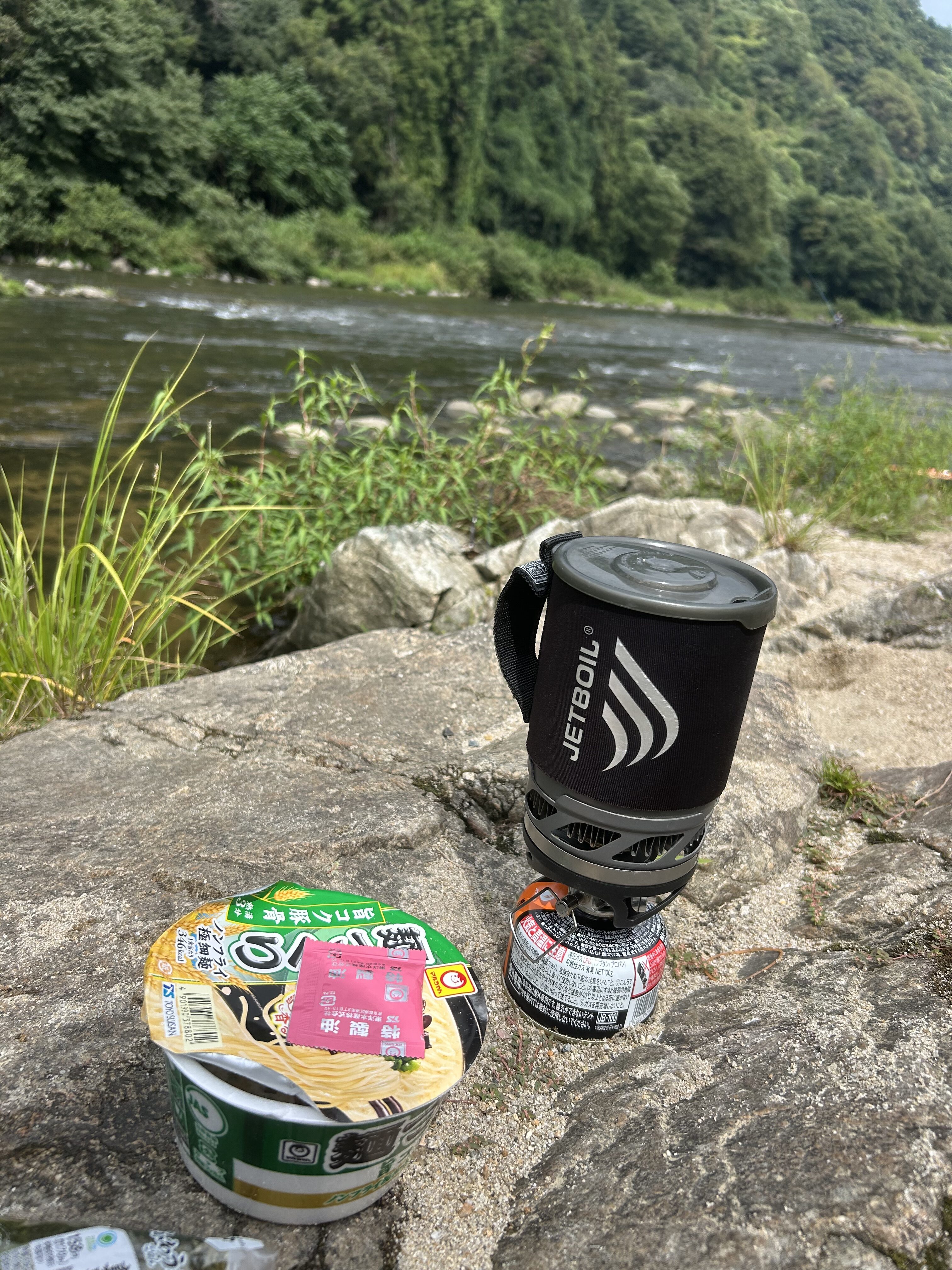午前中で何となく魚のかかる場所とオトリの泳がせ方が分かりましたので、ここで小休止!お昼はいつもカップラーメンを食べます。川原で食べるカップラーメンは最高で、他の釣り人の姿を見ながら、のんびり過ごします。