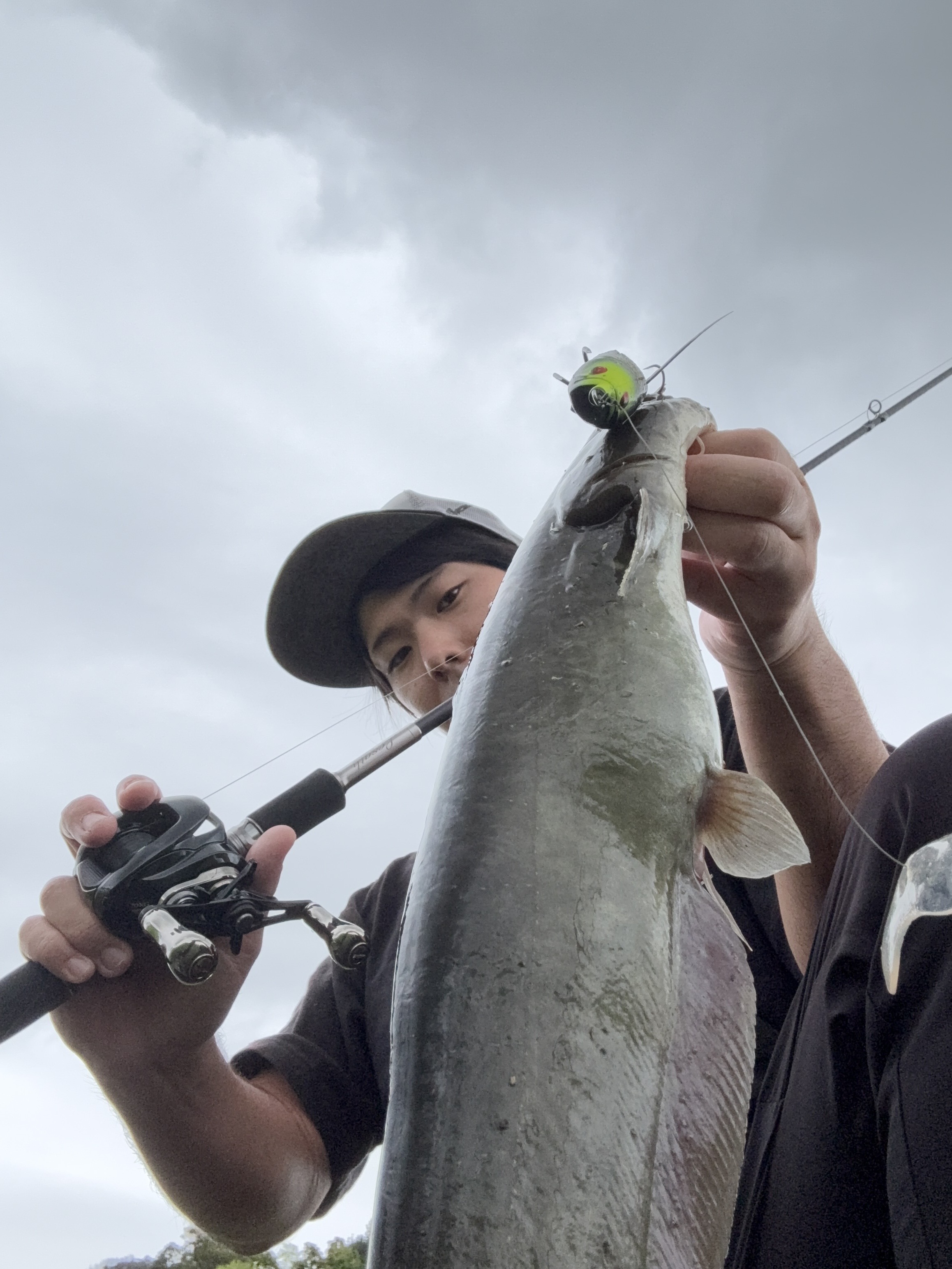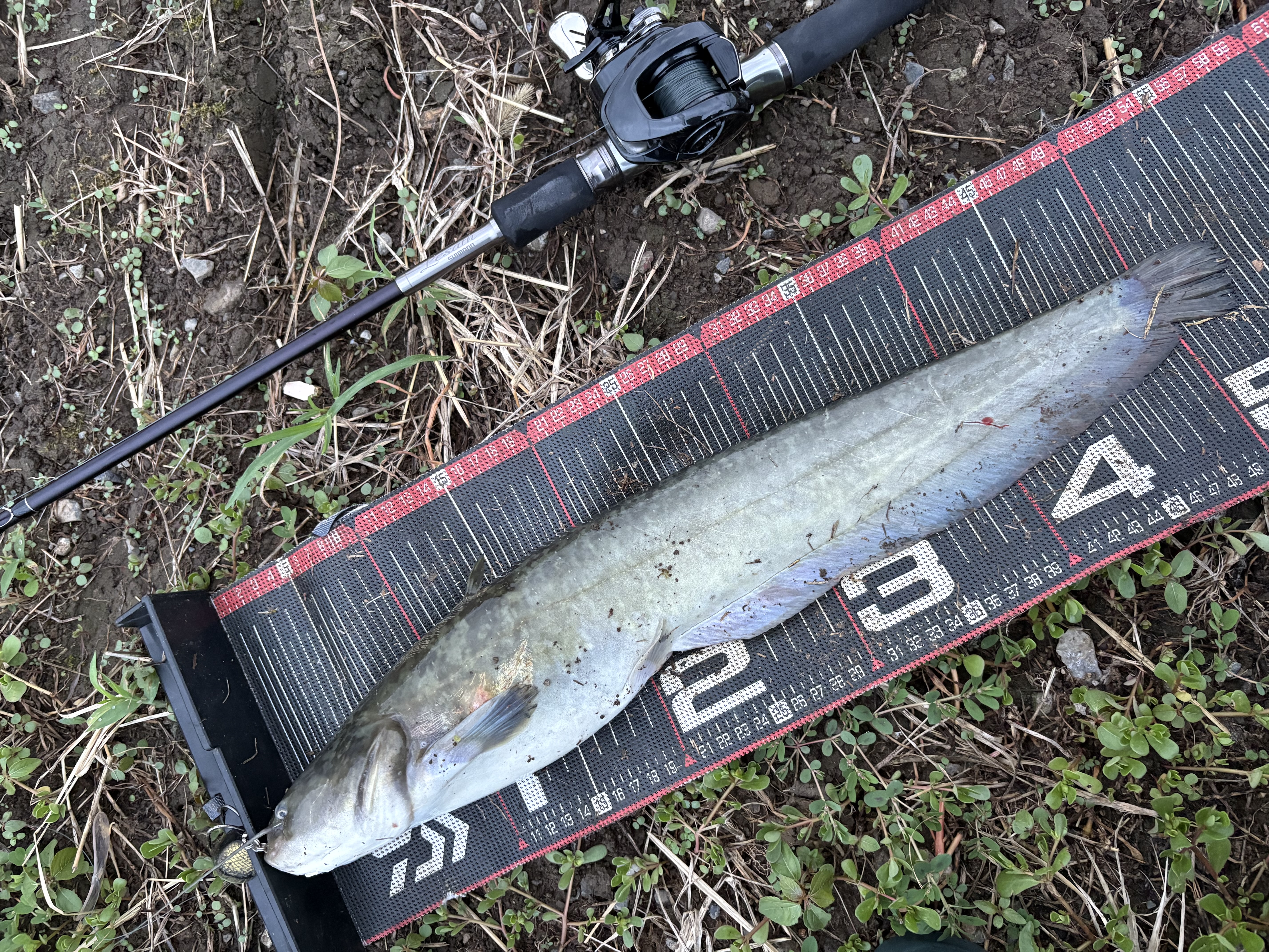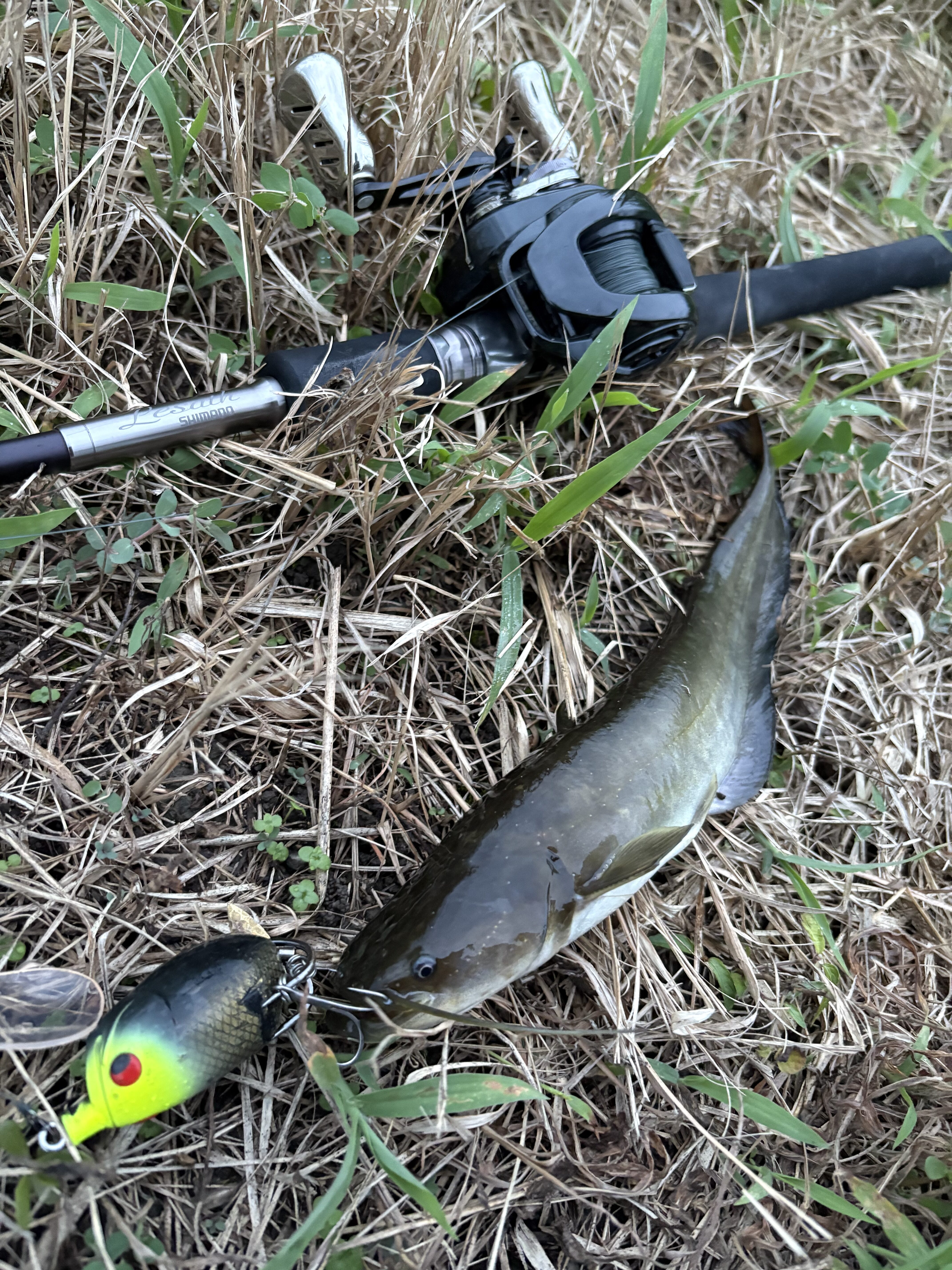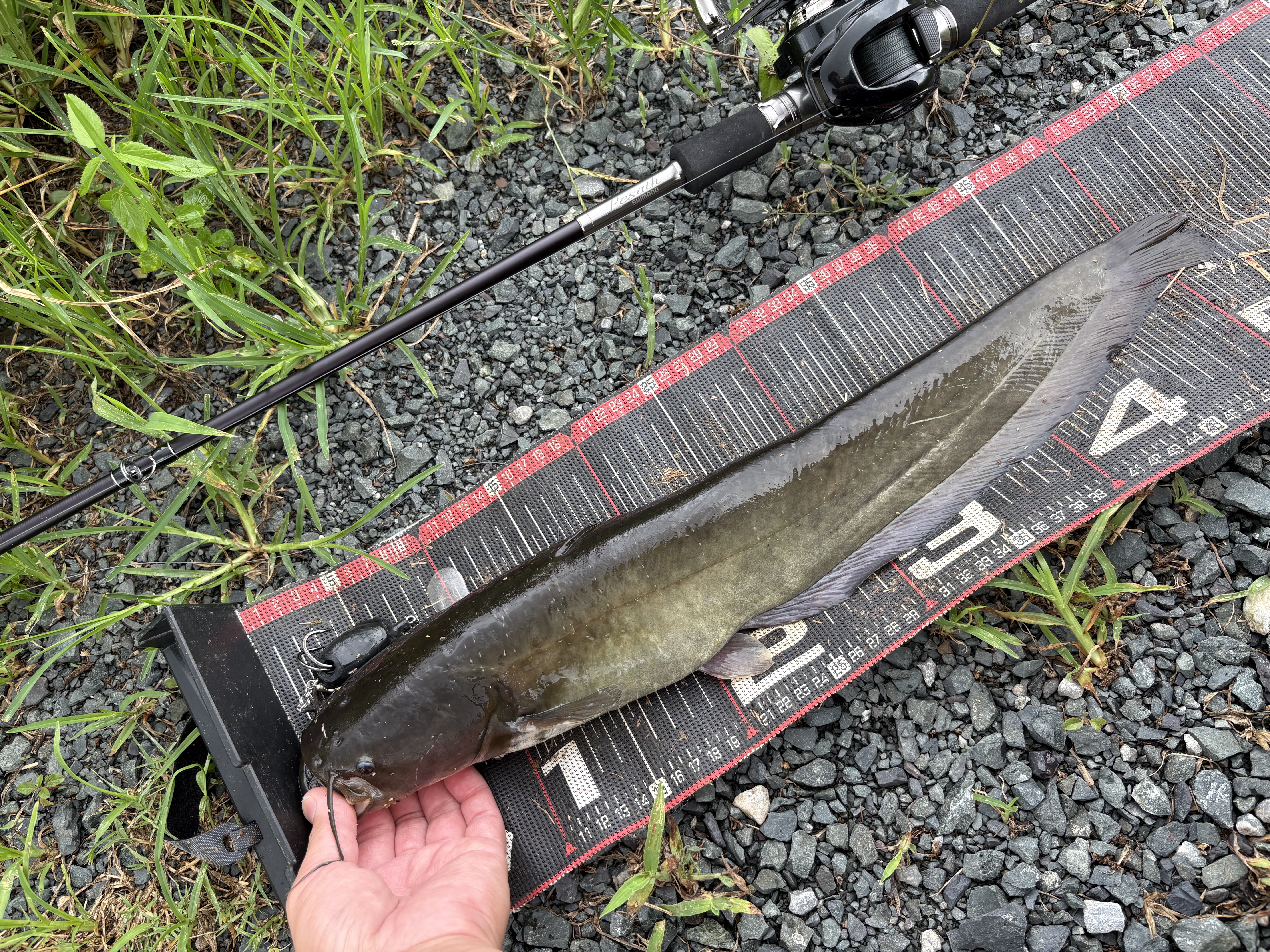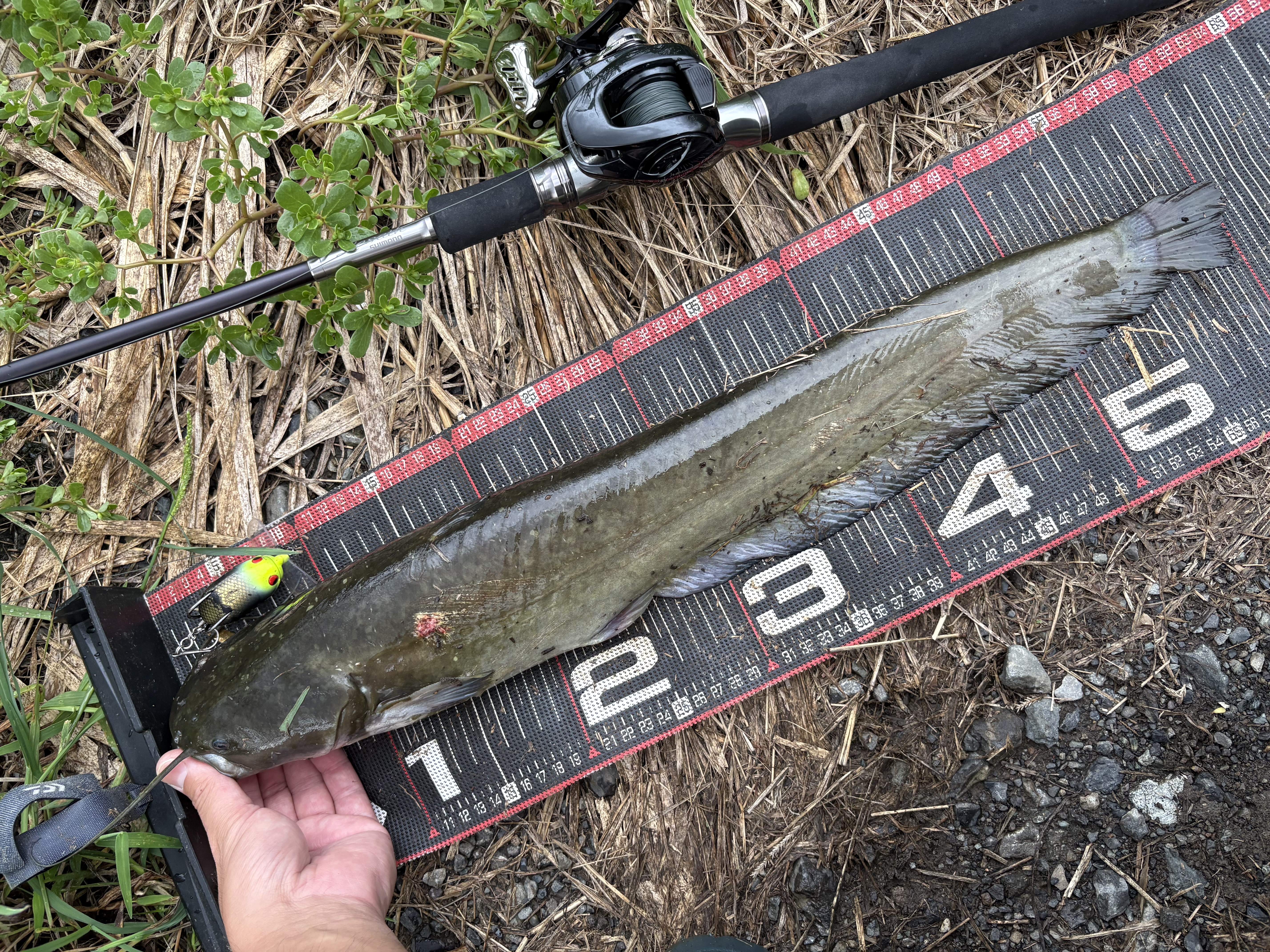向かったのは通称「どんつきエリア」。上流のほうからランガンしていくと、インレット着水から追いかけてくるナマズに遭遇!もう1投するとまた追いかけてきますが、流れてきた草に引っかかりバイトまで出せません…!3投目でもまたチェイス!シェイキングしながら手前まで巻いてきたところでようやくフッキング!