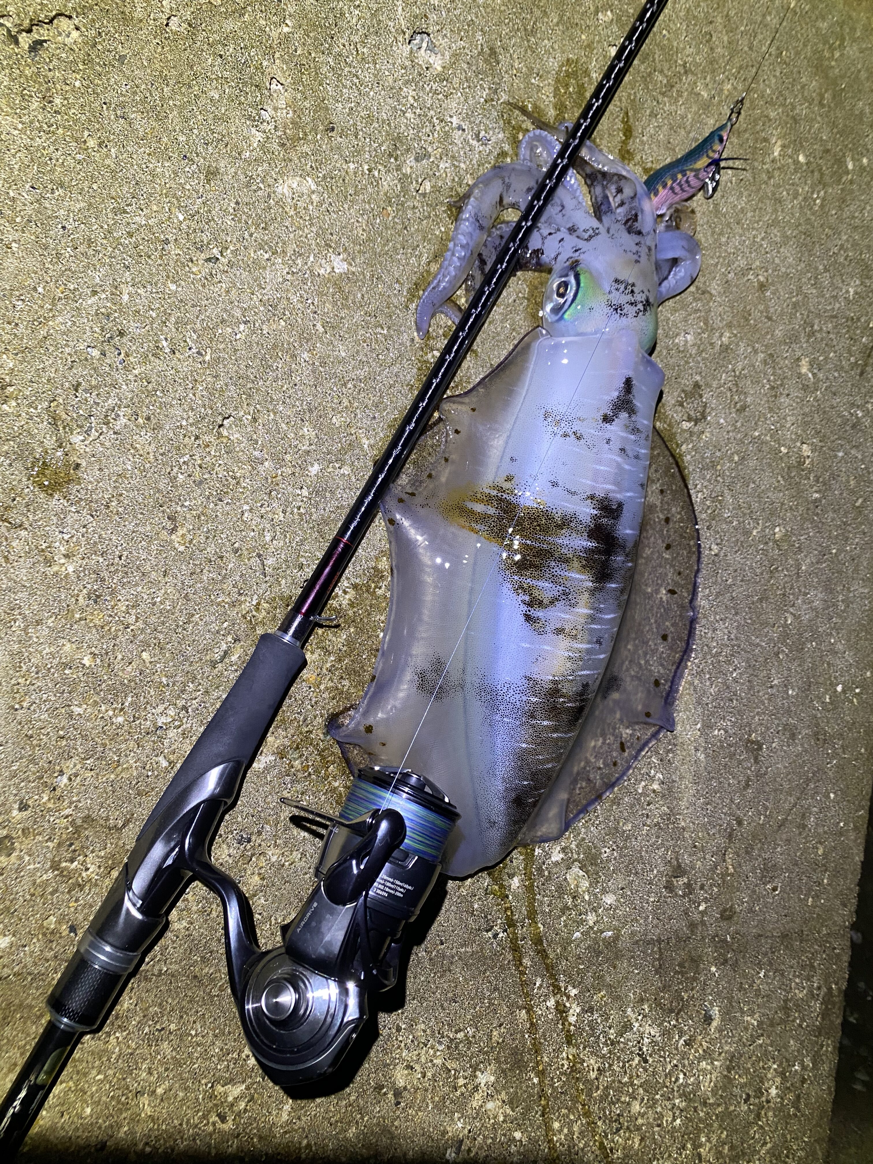 2025.09.17 印刷する 和歌山エギング調査🦑 魚種 アオリイカ 数 アオリイカ/3杯 釣り方 ☆エギング 場所 和歌山県 スタッフ 今中颯 店舗 高槻店 釣行日 2025.09.16 コメント お疲れ様です。高槻店今中です。 今回も新子の調査で和歌山の有田へ。 仕事が終わってからの現地入り、朝の4時頃から釣行開始しました。何ヶ所かポイントを回っていくランガンスタイルで調査しました。 1ヶ所目は、不発。墨跡がそれほどないポイントでしたが、干潮で浅すぎたのかイカの気配はなし。 2箇所目、水深があるポイント。最近、シャロータイプのエギが良いということだったのでヤマリア エギ王Kシャロー3.0号 軍艦グリーンを選択。 2投目、底から3、4回シャクってステイ中。テンションがフワッとなった瞬間に合わさるとヒット! 秋イカと思いましたが、秋イカではない引きと重さ。上げてくると800gの良型アオリイカでした! 日が登り、新子の調査をしましたが、不発。やめようかというタイミングに新子の群れの回遊があり、コロッケサイズ2杯キャッチ‼️ 和歌山は新子サイズの他にも思わぬ大物も釣れることがあるので是非行ってみてください‼️ 使用した釣具 ロッド セフィアエクスチューンS804L+ リール セルテートLT2500S エギ ヤマリアエギ王シャロー3.0号