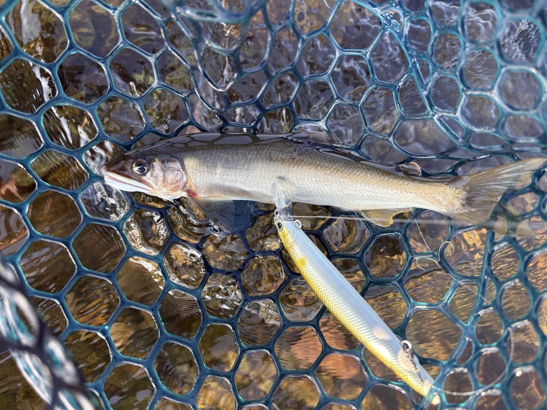 2025.09.18 印刷する 相模川 午前狙いでアユルアー 魚種 アユ/鮎 数 アユ 6匹 釣り方 鮎釣り 場所 神奈川県 天候 晴れ スタッフ 岩田直幸 店舗 イオン相模原店 釣行日 2025.09.17 コメント イオン相模原店の岩田です🍀 相模原店 川口さんがアユルアーデビューで同じく相模原店 浦田くんと釣行するとのことで、前日にお誘いいただき急遽相模川に行ってきました。 私はこの釣りは気が向いたら、誘われたら行くくらいの感じなので専用竿は持っていなく、いつもメバルの長尺ロッドでやっています。 たまにやる程度なら長めのライトゲームロッドはアリです。 硬さは感じるので、今回は弾性の低いカーボンでレギュラーテーパーのトラウトロッドでやってみます。 76なのでアユには短いですが、手持ちの竿の中では専用竿に1番近い調子かなと思います。 発売30年前の竿です笑 6時すぎくらい?に釣りスタート。 めぼしい瀬周りのポイントはすでに先行者が入られています。 広い釣り場とはいえ、午前釣行でいい場所に入りたければ朝一からいかないといけないかもしれないです、この釣り物の人気さを感じます。 パームス エスケード80MDFから始めますが、水深と流れ的にもう少し水噛みの悪いルアーの方がよさそうで、ダイワ アユイングミノー94SFにチェンジ。 はじめ入った辺りでは掛かる気配なく、瀬と岸の間を流すとヒットするもバラシ。 スイングメインで広範囲に探っていると瀬肩の辺りでティップの入るいい当たり! 1匹目から18〜20cmくらいのまあまあいいサイズが釣れました。 このくらいのサイズになると力強い当たりと引きを楽しめます。 空いてるさまざまなタイプの流れをいろいろチェックしていきますが、良型はぜんぜん掛かりません。 暑くなる前に、私も夕方から予定があったので11時に竿をしまいました。 釣果的には3人とも同数程度釣った感じかなと思います。 今日はこれでいいやと渓流のトラウトで使っているネットを持っていったところ、予想はしていましたが目から抜けて舟に魚を入れる前に何匹も逃げられました笑 目の細かいものにしましょう。 まだまだ暑いので、滑りにくいフェルトソールの履き物で涼しい川に浸かりながらアユ釣りもいいですよ、竿やリール、ルアーなどは他の釣りものの物で代用できるものも多いです。 使用した釣具 ロッド 《ダイワ》 シルバークリークS 762-ULRS リール 《シマノ》 21コンプレックスXR F4 HG ライン 《バリバス》 マックスパワーPE X8 ライムグリーン 0.6号 リーダー 《サンライン》 トルネードコング 1.5号 ルアー 《ダイワ》 アユイングミノー 94SF、《パームス》 エスケード 80MDF 針 《オーナー》 こだま 3本錨 7.5号 等