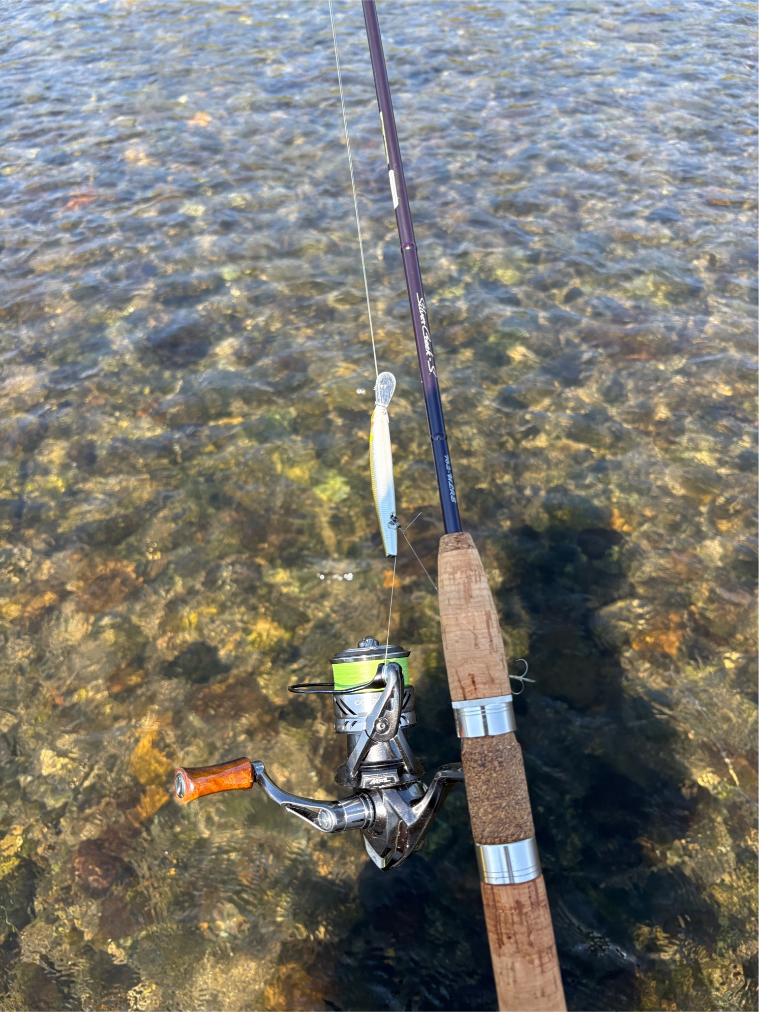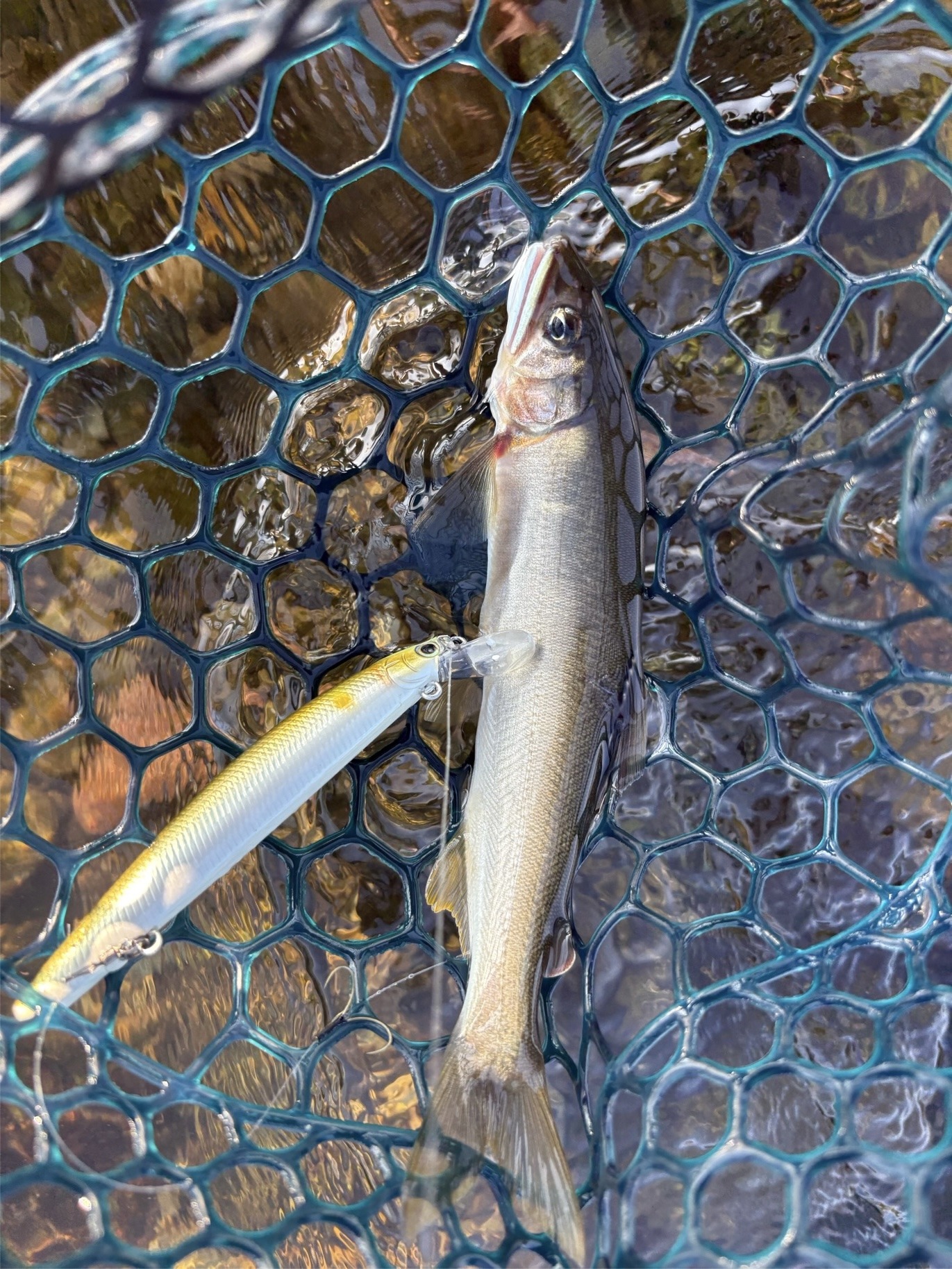 パームス エスケード80MDFから始めますが、水深と流れ的にもう少し水噛みの悪いルアーの方がよさそうで、ダイワ アユイングミノー94SFにチェンジ。