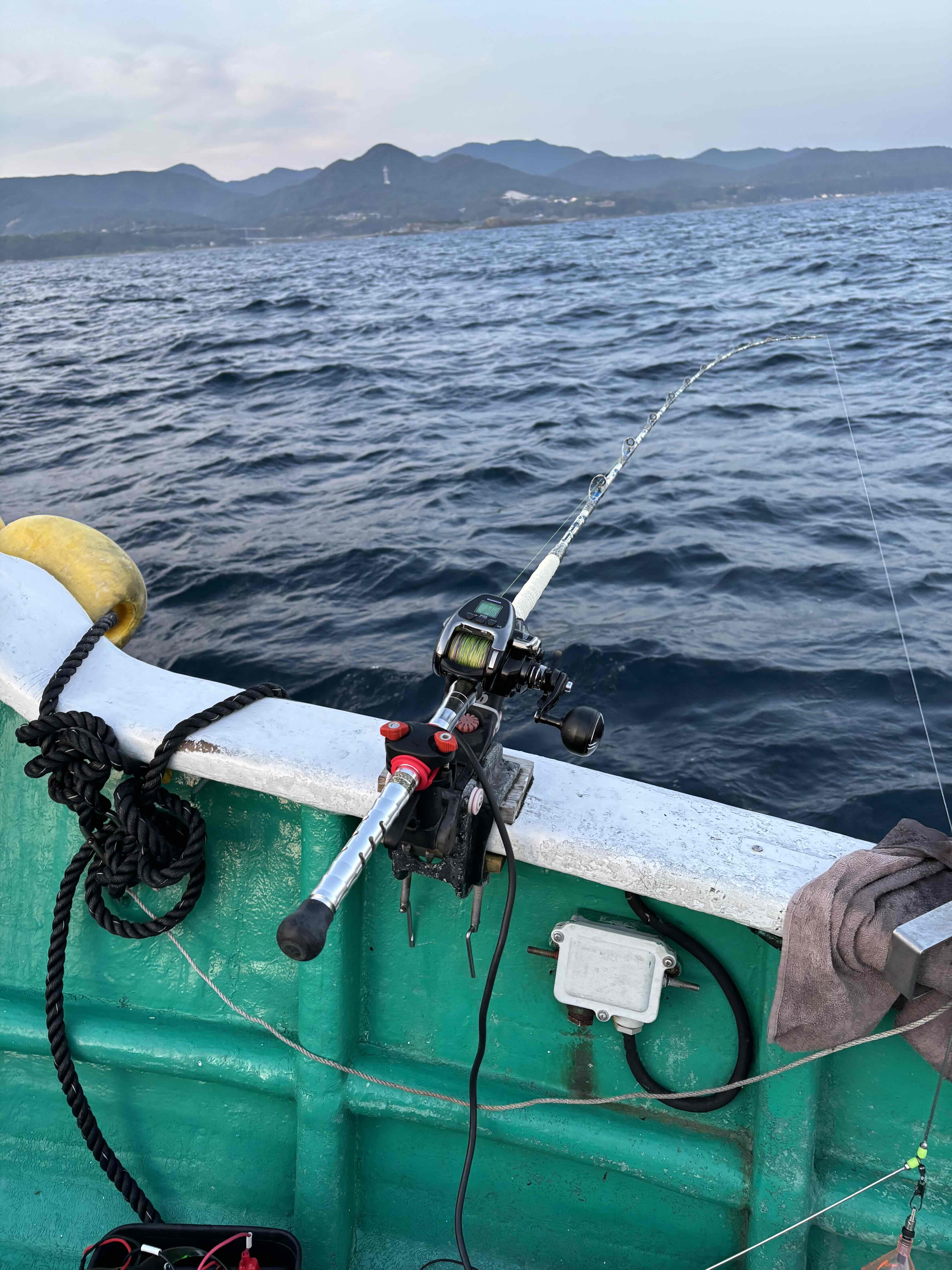 串本のシマアジはいつ来るの? 今回は久美丸での夜のシマアジ調査 夏は夜シマアジが定番 お盆までは釣れていたのが居なくなり水温下がり、魚の反応も無くなったポイントで挑戦 夕方18時に出船ポイントまでは近く15分ほどアンカー下ろしての船が安定してから釣り開始 夕方はサメも多いポイント 仕掛けを投入してから少し巻き上げてコマセを打つとアタリ イサキ?の引きポイ感じで上がってくる途中に魚が変わり引きが強くなりラインブレイク 隣でも大型魚とやり取り中(サメです) 大型サメが海面を割ってジャンプ 暗くなりサメも落ち着いたら大型サバの猛攻時よりムロアジも釣れるが底中心に探っていてもサバだらけ 後方ではイカメタルでスルメイカ 水面にもアオリイカが見えます 串本の低水温は山を越えた感じですお盆頃は探見丸にも魚は見えなかったようですが水面から底まで魚は戻っている感じです。今回シマアジは釣れませんでしたが昨年は9月末からスタート 海中公園沖での朝便でも釣れだすことも多いのでぜひ高級魚シマアジ狙いにチャレンジしてみてください。