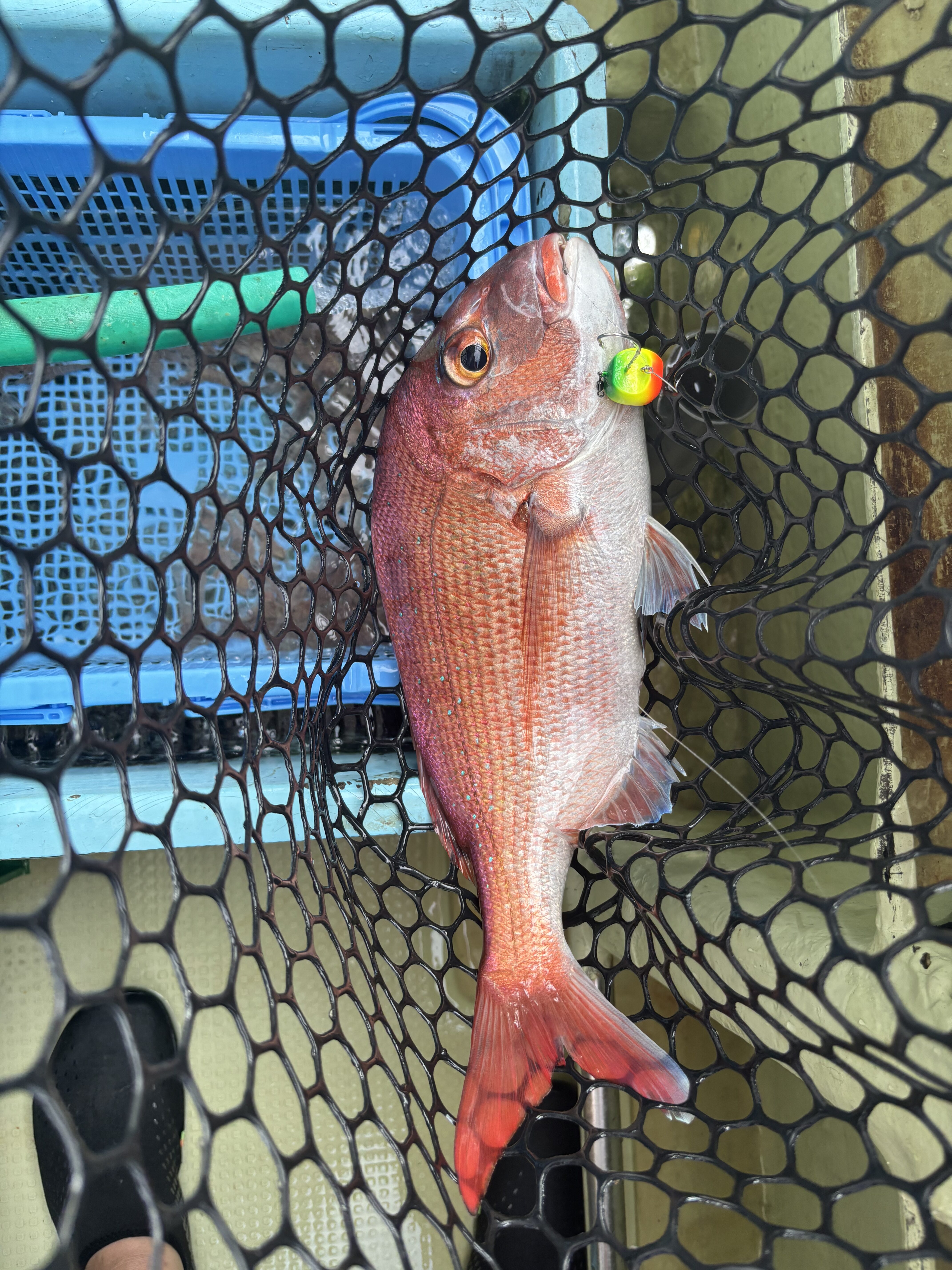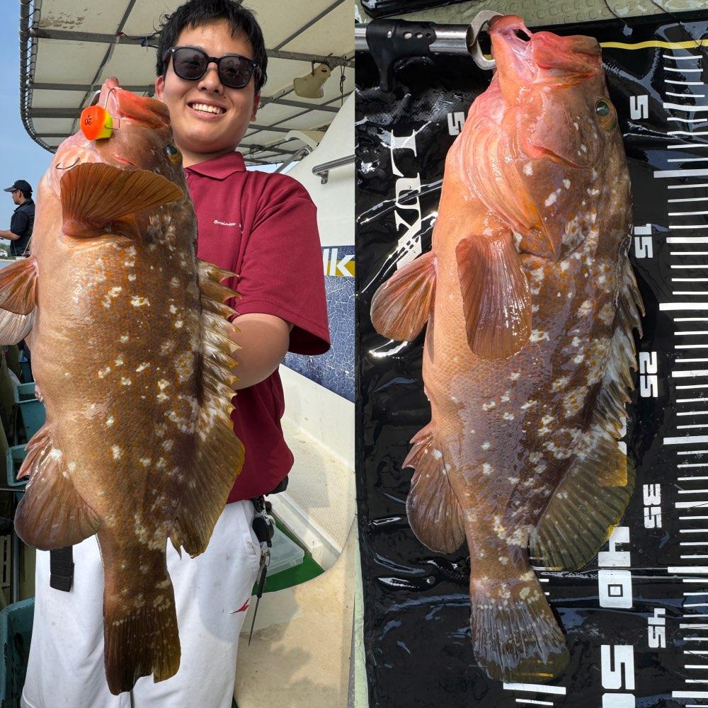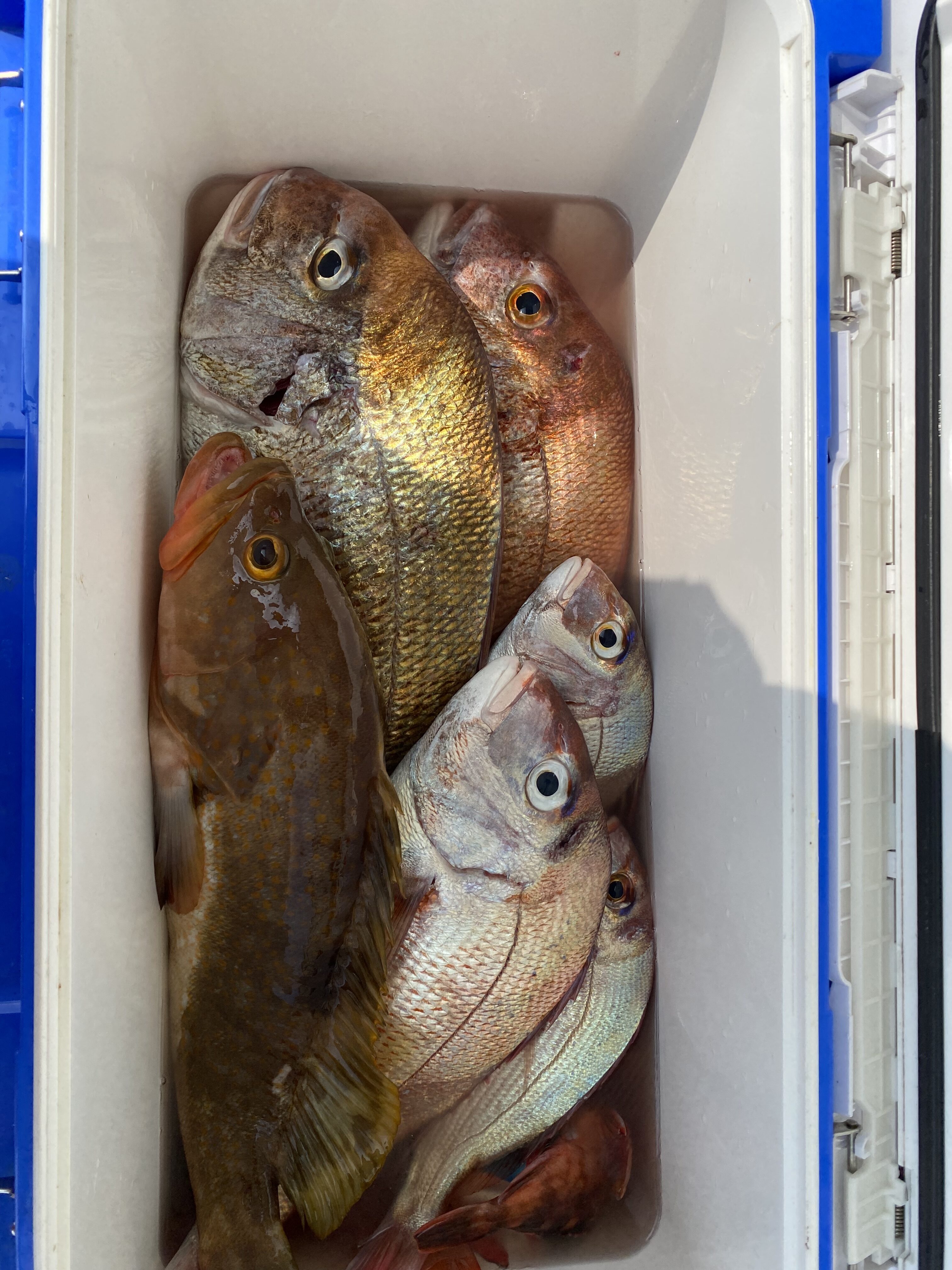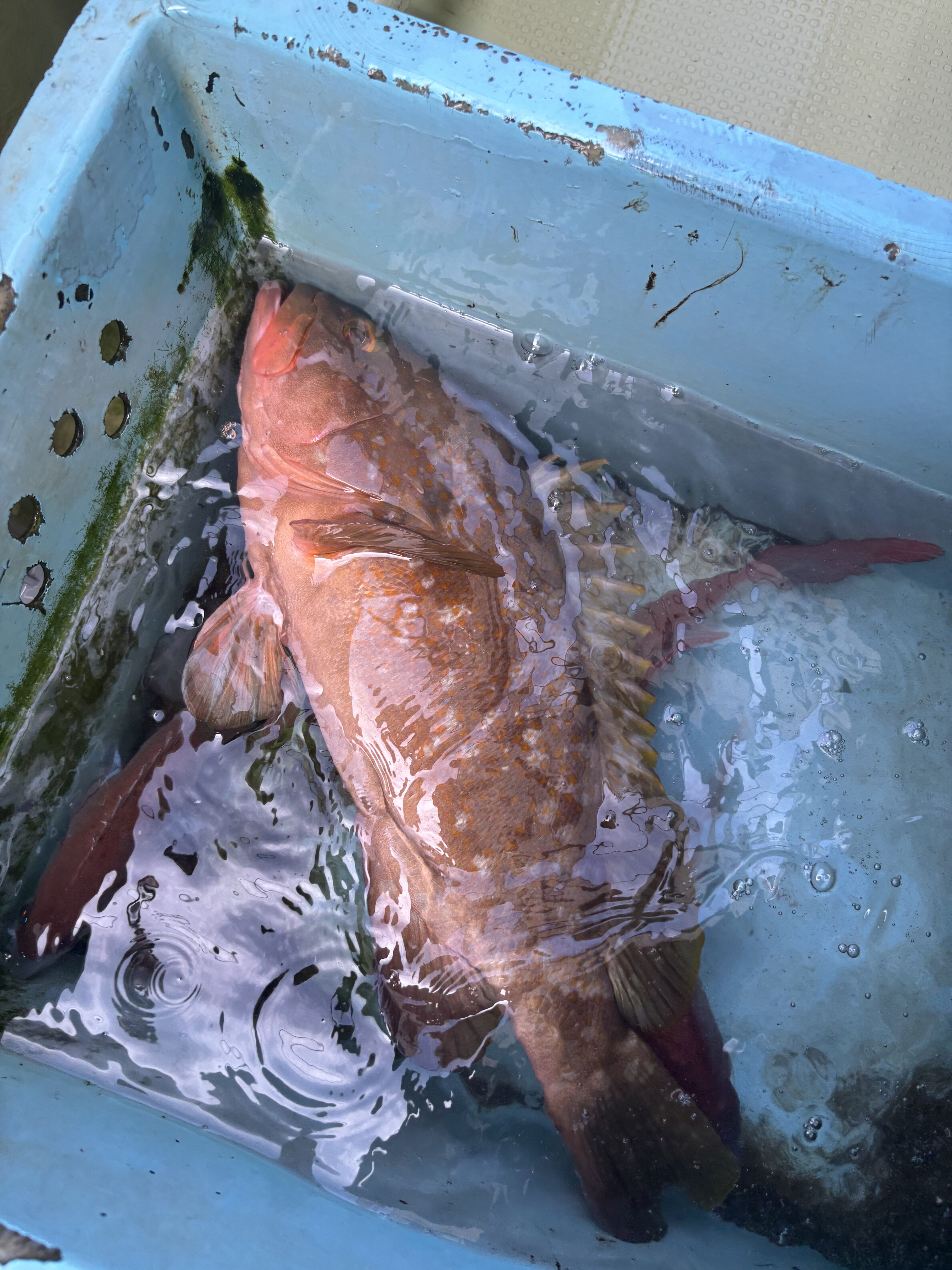序盤は船中全体で当たりが遠のきましたが、船長から「フォールスピードを速めてみて」とアドバイス。実践するとすぐにヒットし、65cm・59cm・53cmと良型の真鯛をキャッチ\(^o^)/ さらにリリース含め計11匹、加えて自己記録となる50cmのキジハタ(アコウ)も登場!調べてみると40cmに達するまでに10年かかる魚とのことで、このサイズはかなりレアらしく感動でした。
