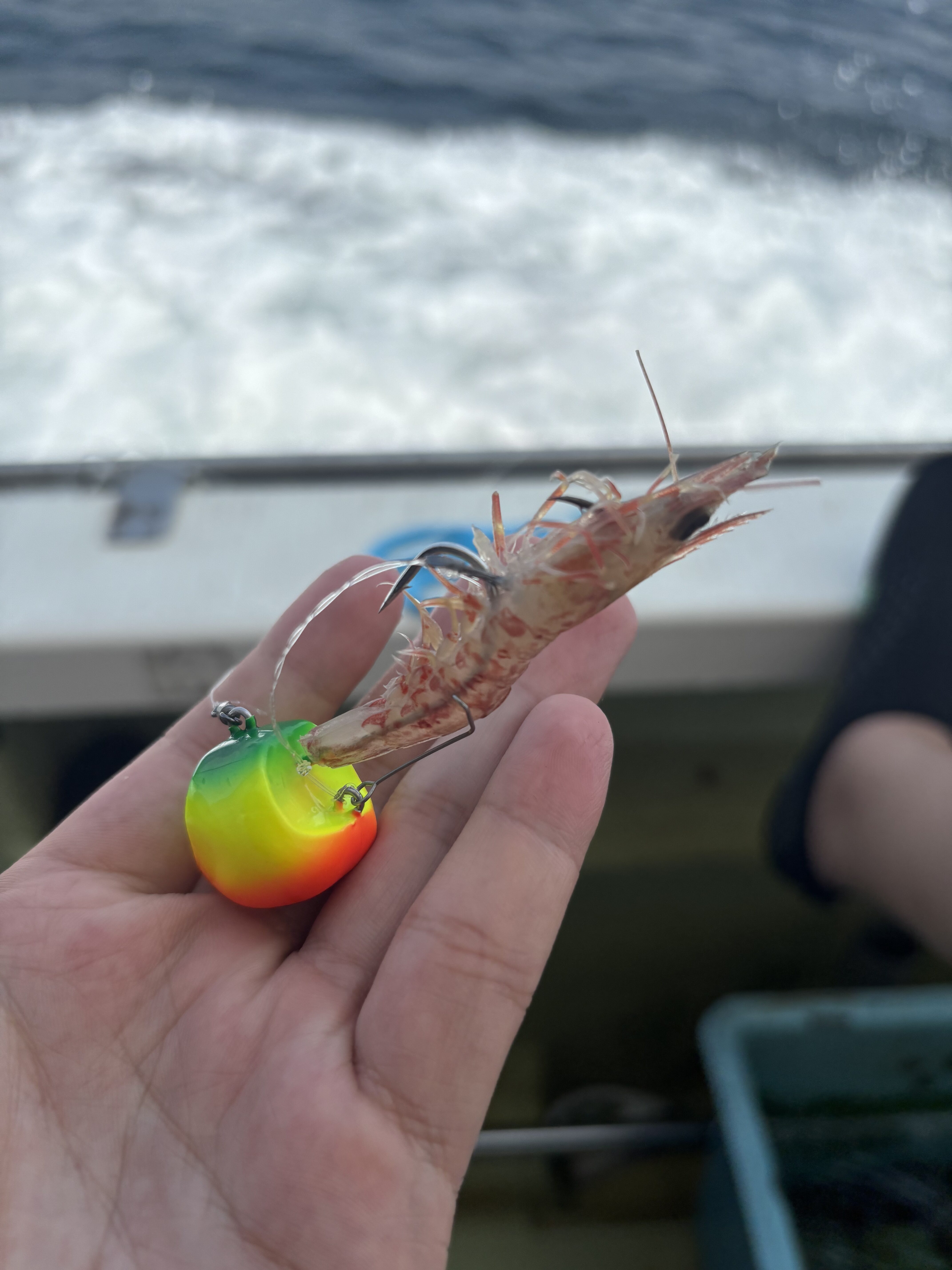 明石港を出船し、明石海峡大橋を横目に淡路島沖まで20分ほど。餌は活けのサルエビ(ヨシエビ)で、船の個人生簀で一日分が確保されているので安心です。釣り方は仕掛けを底まで落とし、エビが跳ねるイメージでしゃくりを入れ、テンションフォールで誘うシンプルなもの。小さな“コツコツ”という当たりを掛けると、予想以上の重量感と強い引きが楽しめました。