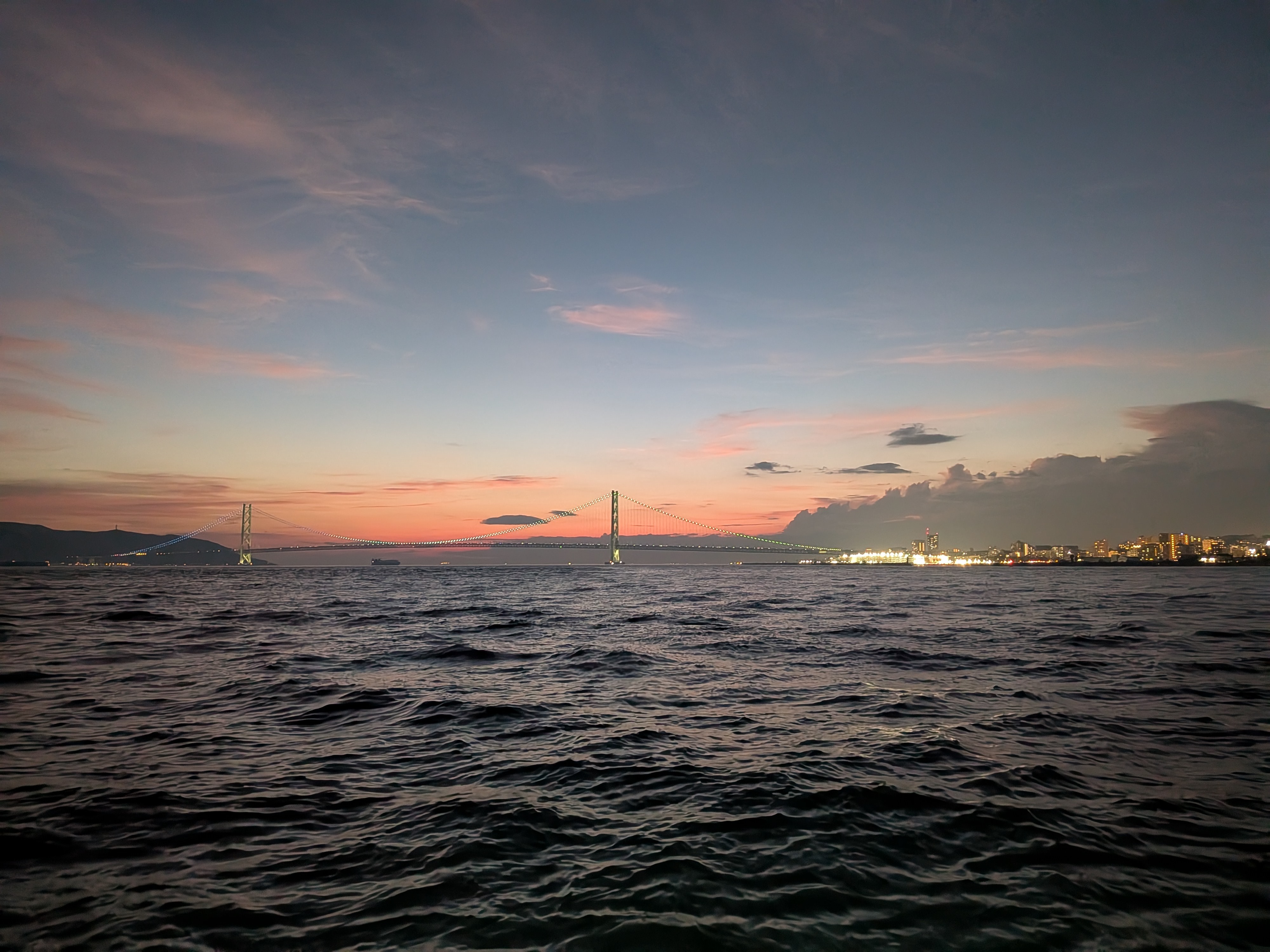 さて夕方の美しい明石大橋をみながらのアオリイカ!