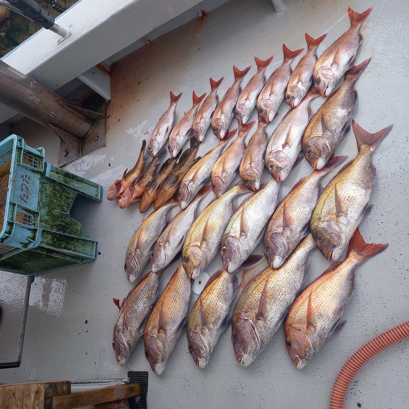 2025.09.22 印刷する 明石沖タイラバ連チャン釣行2日目! 魚種 真鯛 釣り方 ☆タイラバ 場所 兵庫県 天候 曇り スタッフ 嘉田康司 店舗 堺店 釣行日 2025.09.19 コメント 前日のまさかのラスト1枚がクリアできずに2日目に突入(笑)、今回は西昆陽店の厨師匠も同行で心強いです♪ パターンは分かっているので朝一勝負、最初のポイントは前日とは違い橋脚周辺からスタートです。早速厨師匠にヒット!師匠は予選通過まであと7枚とちょっと遠いので出だし良好です。私も昨日と同じ45gのTGベイトをバーチカル気味に巻いていると底から5巻きほどで違和感、そのまま巻き続けていると8巻目にひったくるアタリで即フッキング!小気味よい引きで上がってきたのは40cmほどの規定クリアサイズ、久しぶりに釣った後の安堵感を味わいました。 前日同様、朝の2時間くらいはジグでのアタリがコンスタントに続き私が4匹、師匠3匹、回りの方もジグを巻いている方は複数枚確保されている方が多かったです。そして8時を回った頃からは同じような2枚潮地獄・・・で船中もあまり追加なく終了となりました。 現在の明石沖、とにかくアタリがジグに偏っています。これがいつまで続くのか、またネクタイにアタリが戻りだすのかよくわかりませんが直近で行かれる予定のある方は必ずジグを2~3個持って行ってください。今回の実釣では50gくらいまでのタングステンジグにアタリが集中し、底が取れないからと60g以上のタングステンに変えたら途端にアタリが出なくなりました。45gに戻すとまたアタリが復活したのでできるだけシルエットの小さいサイズがよさそうです。常連様も同じことをおっしゃっていたので間違いないと思います。あと、ジグだからと変にしゃくったりせずただ巻きに徹すること。しゃくると真鯛のアタリが遠のき、逆にサゴシや太刀魚、青物が食いついてジグを無くすだけでした。。。特にサゴシが多いようで皆さん結構やられていました。 これから秋本番になってくる明石沖タイラバ、皆さんもぜひ足をお運びください。ジグでもし不明な点あればお気軽にお問い合わせください。 使用した釣具 竿 ヴァデルSLJモデル リール ヴァンフォード4000