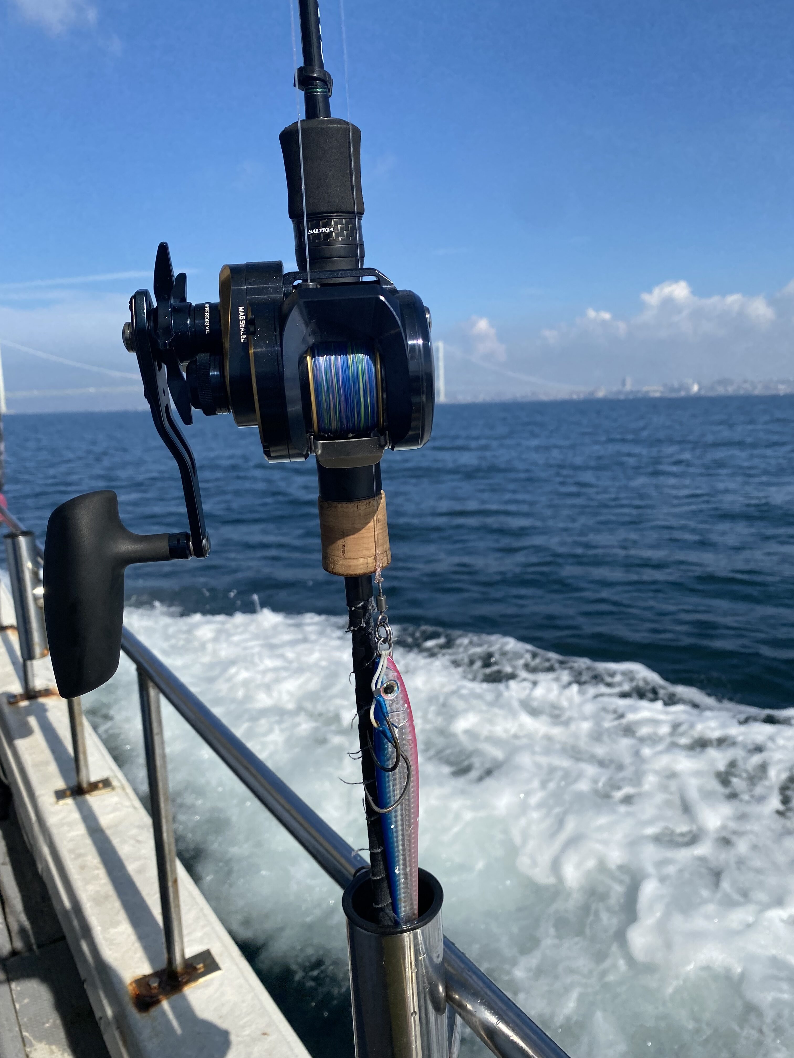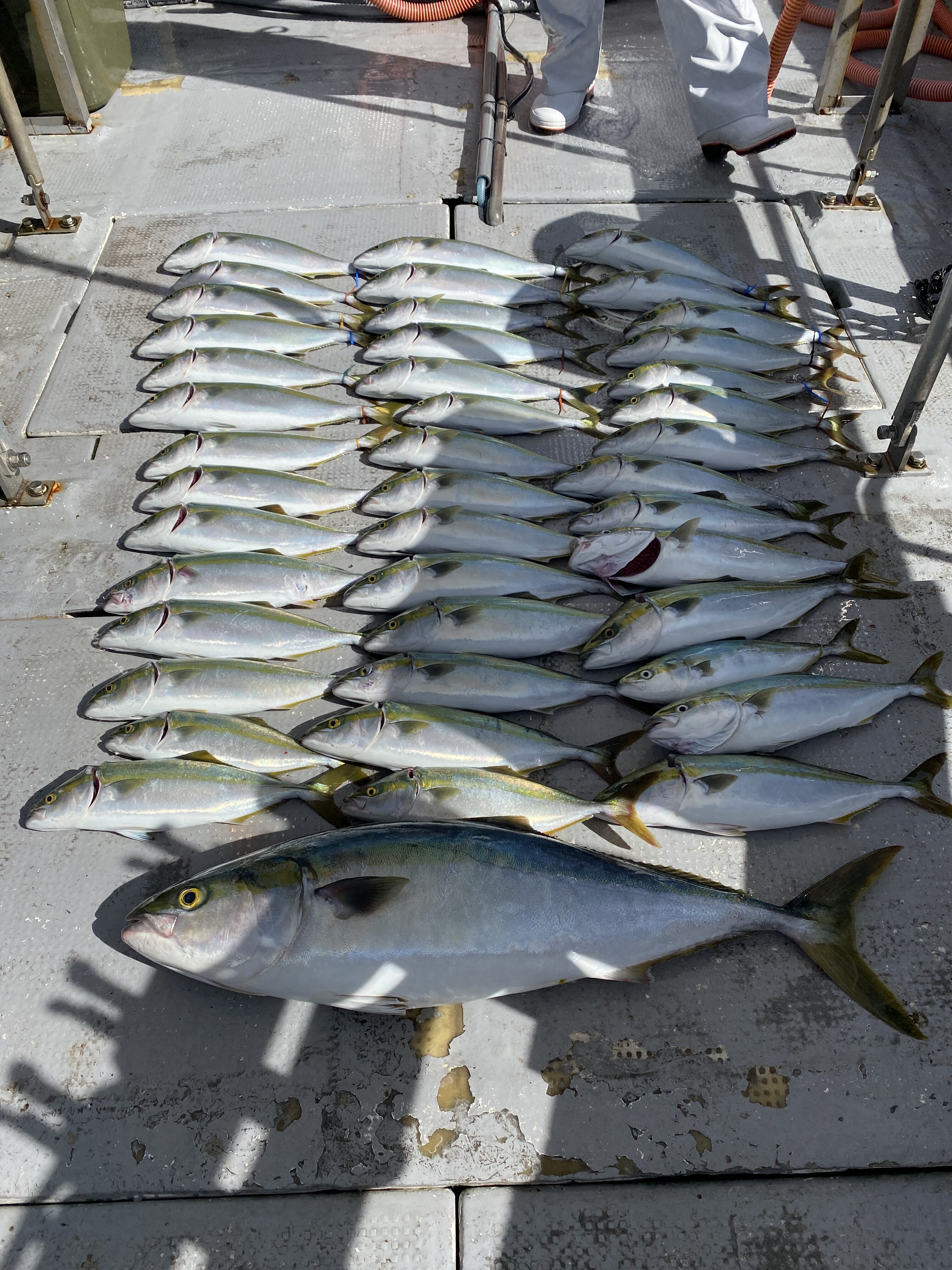 バーチカルにこだわり過ぎている自分にツバスがヒット。船中で約4時間ぶりの釣果でした。ヒットジグは「ウロコジグ 緑金」でした。