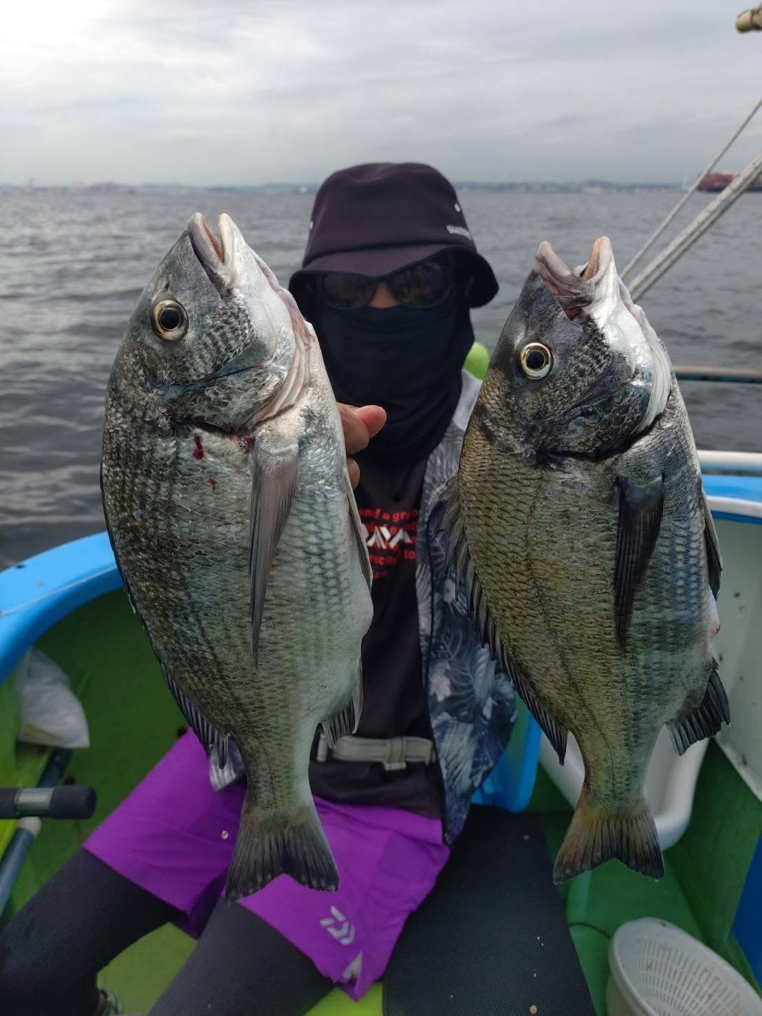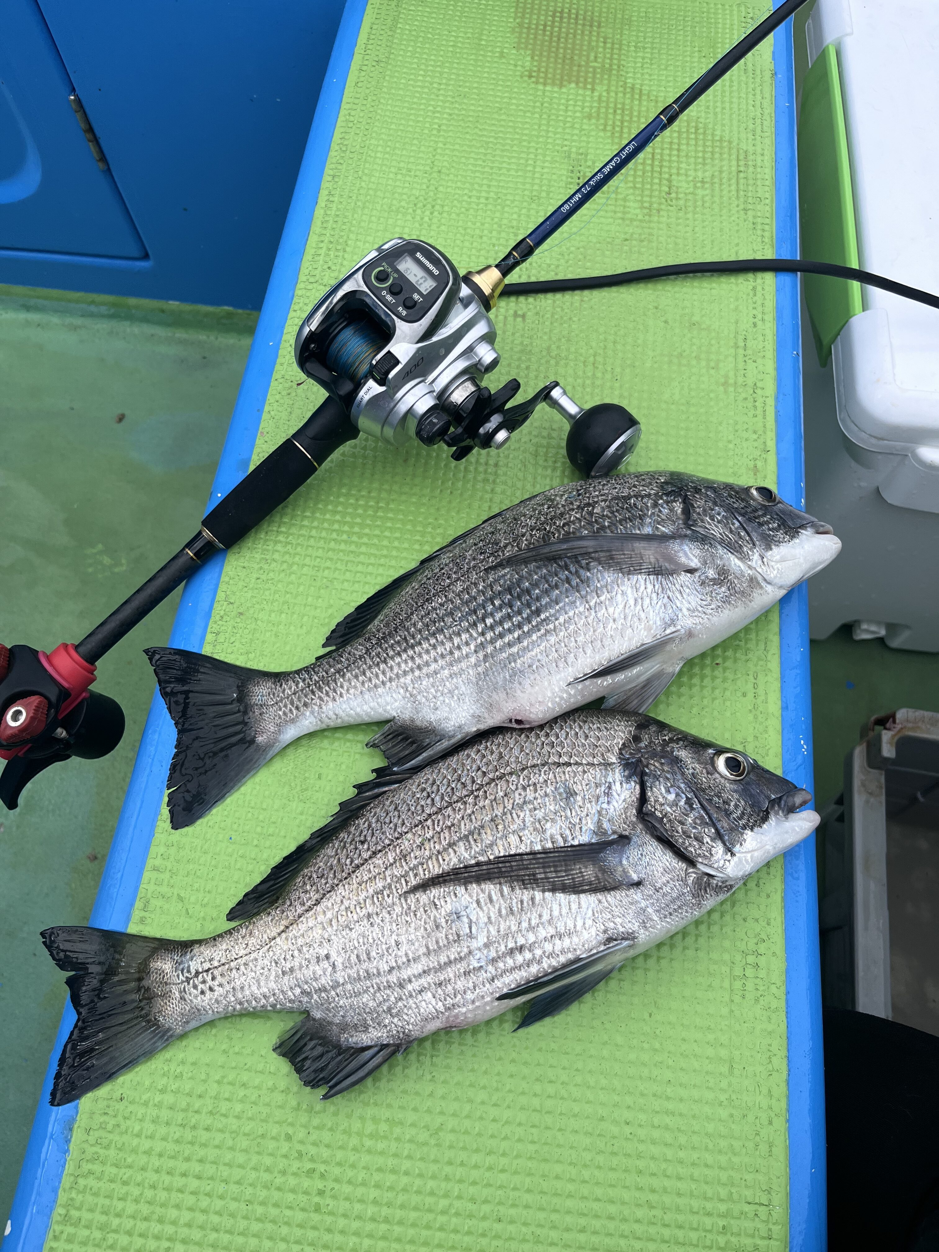 こちらではアジはもちろんだがマダイ、クロダイ、ヒラメも釣れるというポイントだという事で出来ればマダイを釣りたい✨なのでマダイ用の仕掛け6m1本針をセットしチャンスを狙うが反応なし…またまたウィリー仕掛け(船長さん曰くハリス1.5か2号までがオススメ)に戻しアタリを待ちます。すると良型アジを数匹追加し残り30分…アジ以外にも何か欲しい…諦めずにコマセを振っていると明らかにアジとは違うアタリ✨グングン引いてる…なんだなんだぁーとあげてみるとクロダイ✨嬉しい〜✨そして残り15分にももう1匹追加のクロダイ2匹きてくれました〜✨