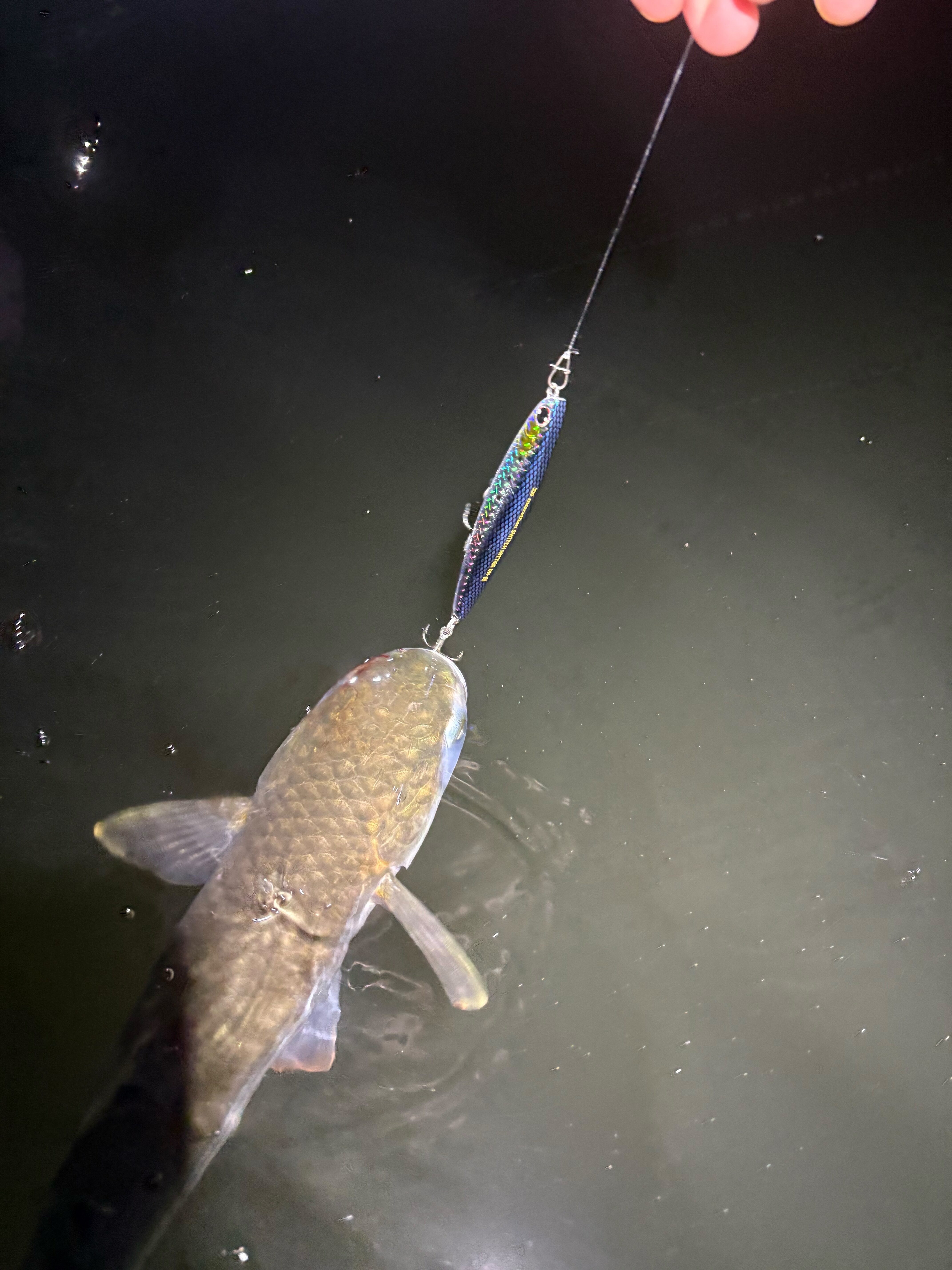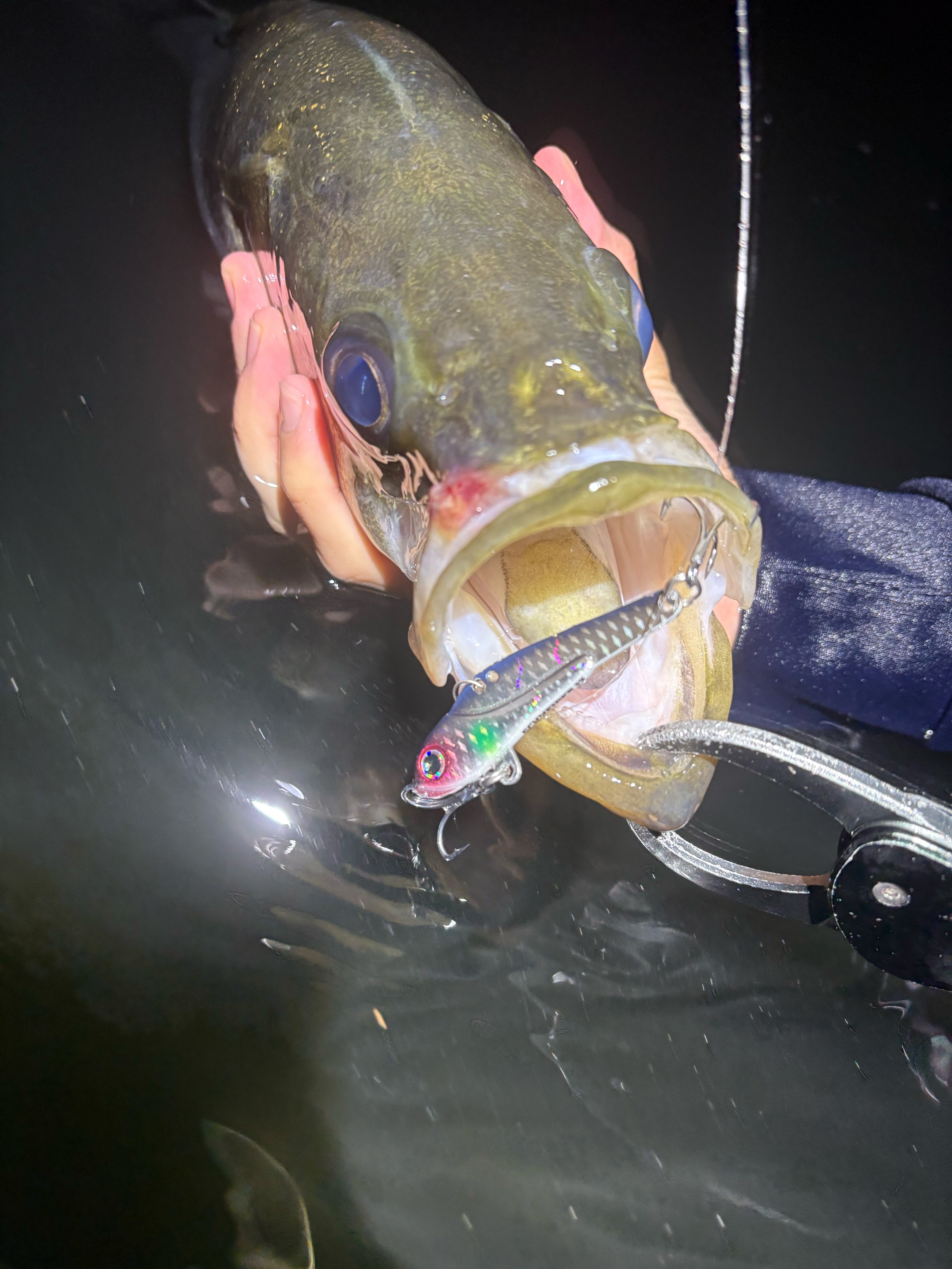 ミノーでは届かないので、シュナイダー13でリーリングジャークをしていると……ゴツン‼️と荒々しいバイト‼️ボラかな〜と思っていると手前でエラ洗い‼️少しサイズは落ちましたが、良型シーバスゲット✨️
