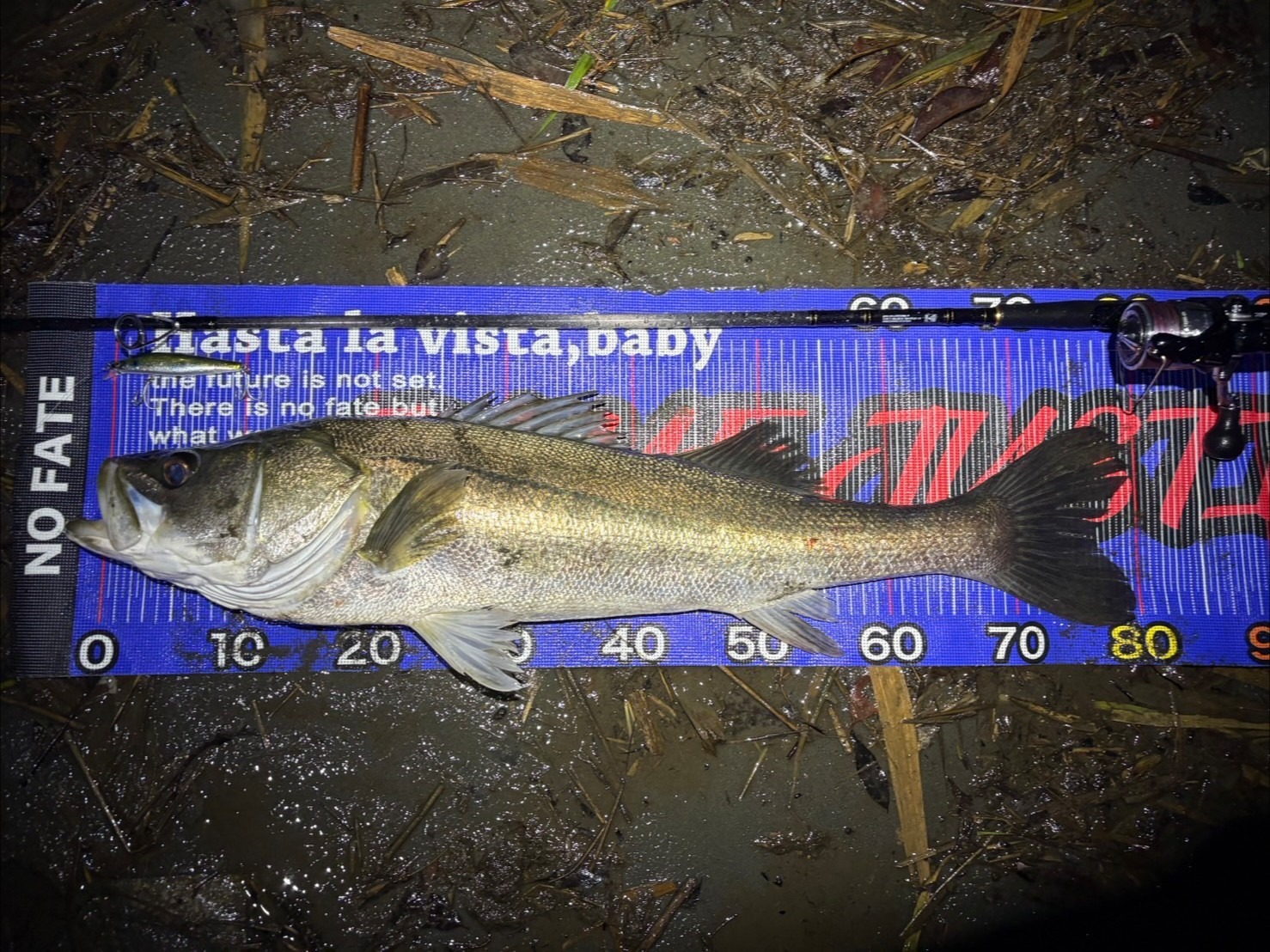 まずは「サイレントアサシン99F」を投げます。ブレイクにゴリゴリ当てながら2ジャーク1ポーズをしていると…ポーズ中にゴンッ!丁寧にファイトして上がってきたのは、79cmの良型シーバス‼️食わした感満載で大満足です✨️