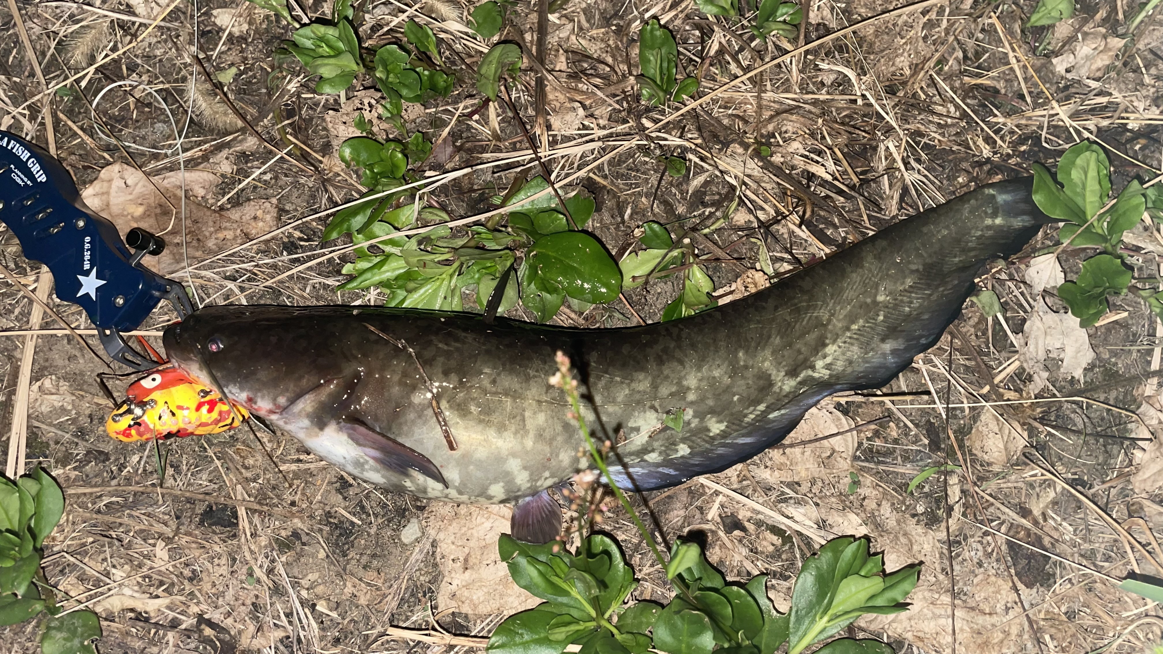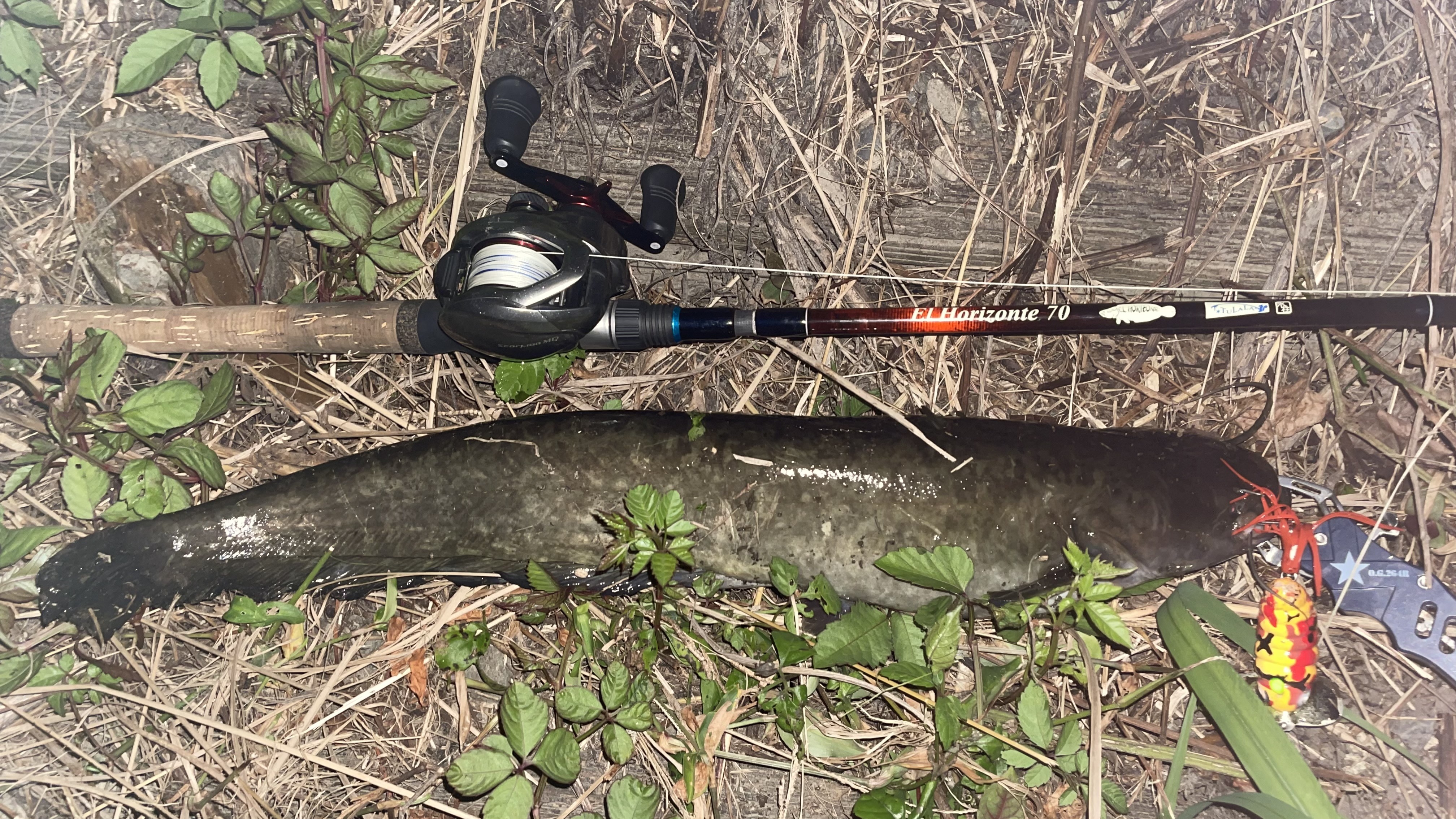 その後違う河川へ移動し、ポイントを点々としながら探っていると、3箇所めで何やらナマズが群れている。が、小さい。まだまだかあ、と思っていたら1バイト!ズッシリとした重み。デカい!我が愛剣エルホリゾンテのパワーで引っ張ってくると…