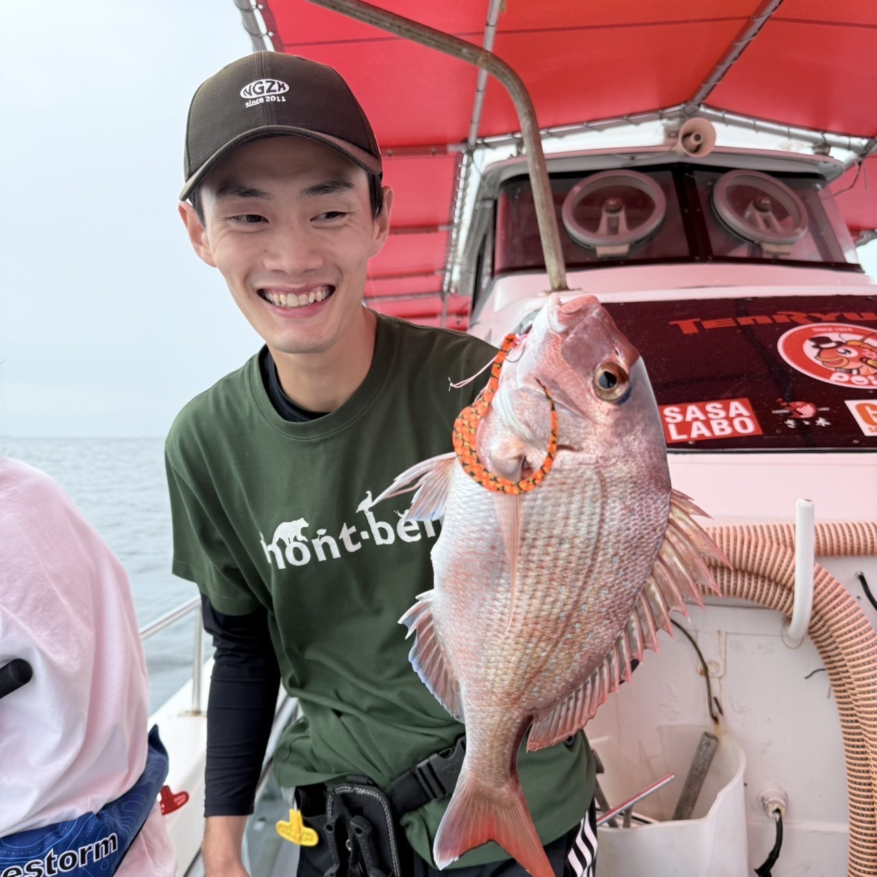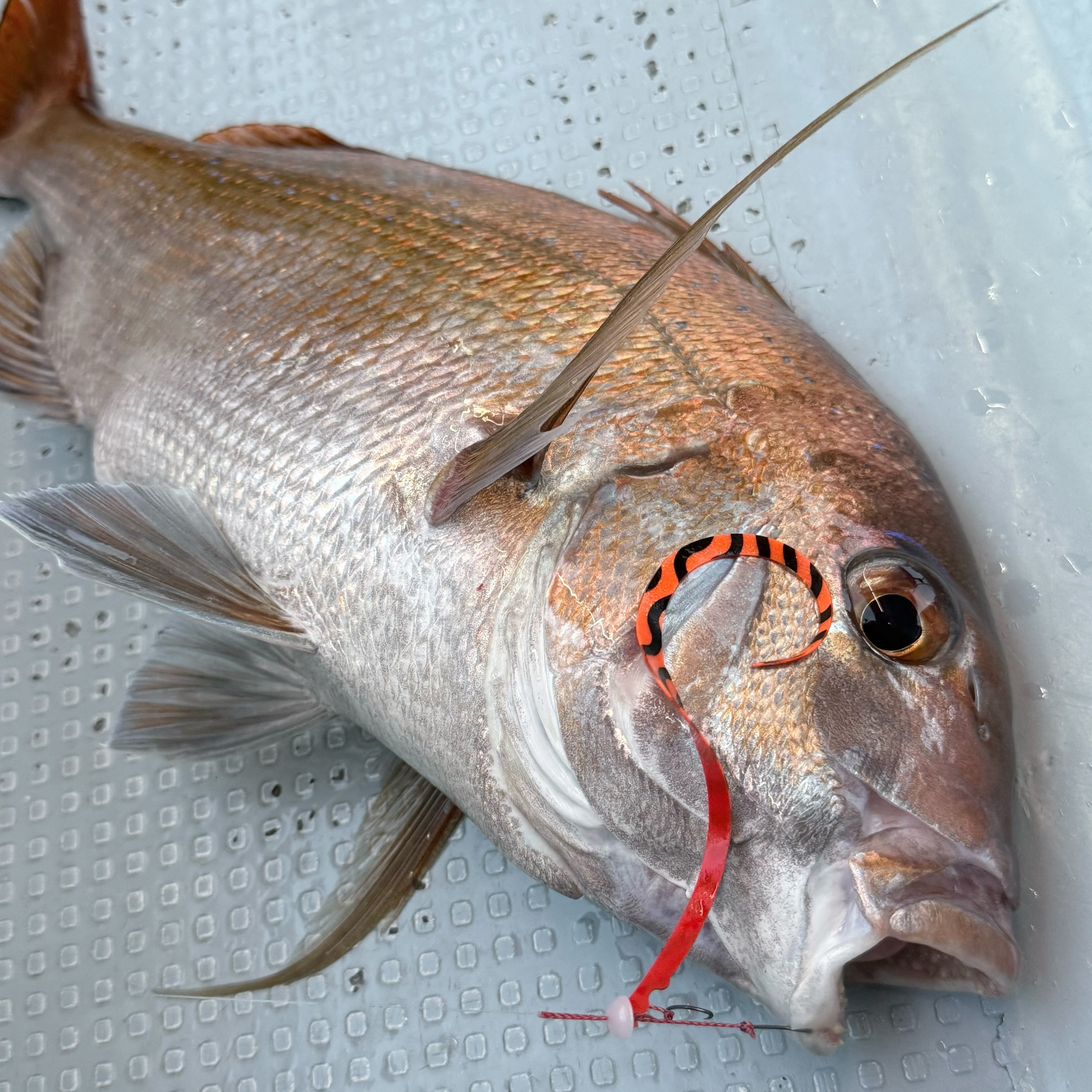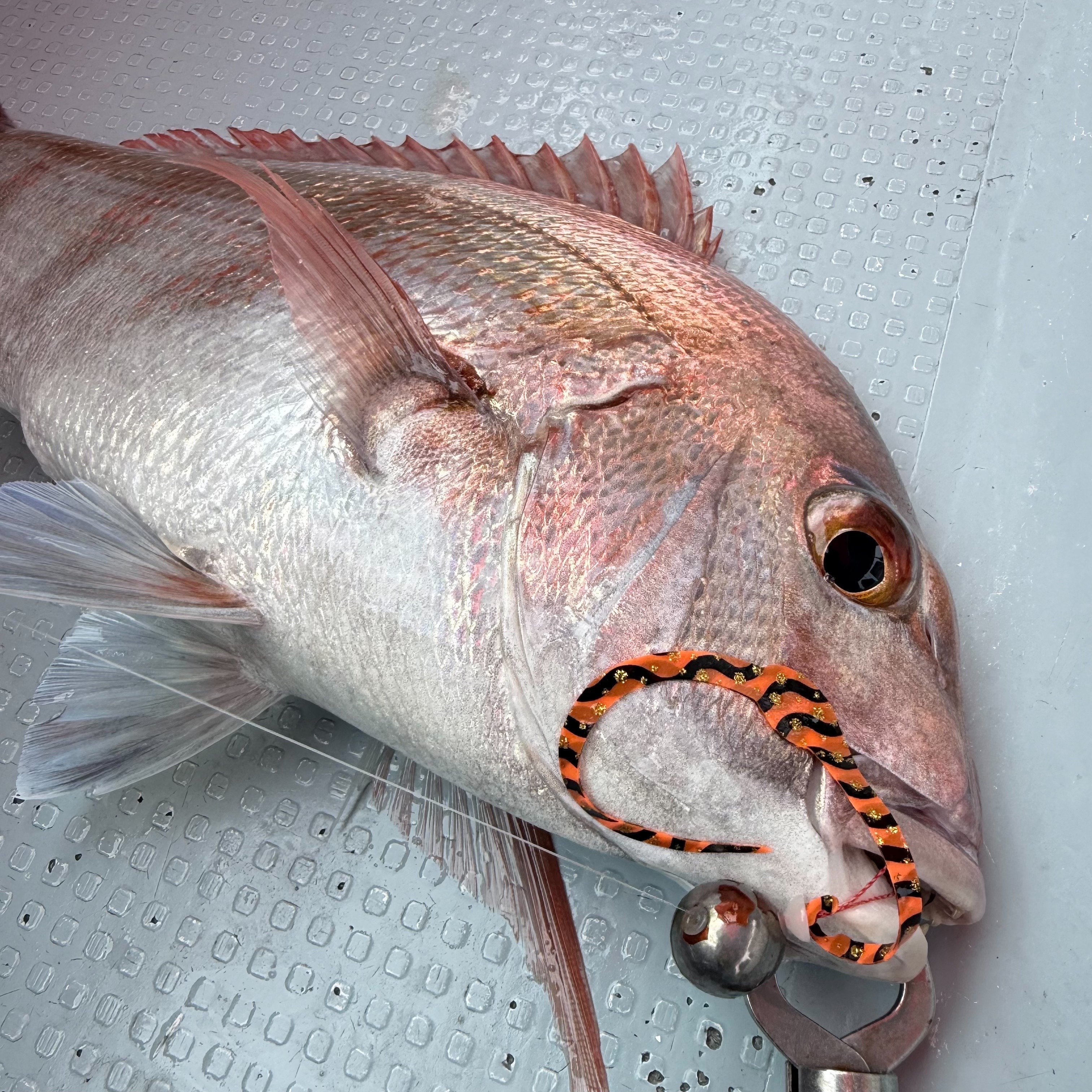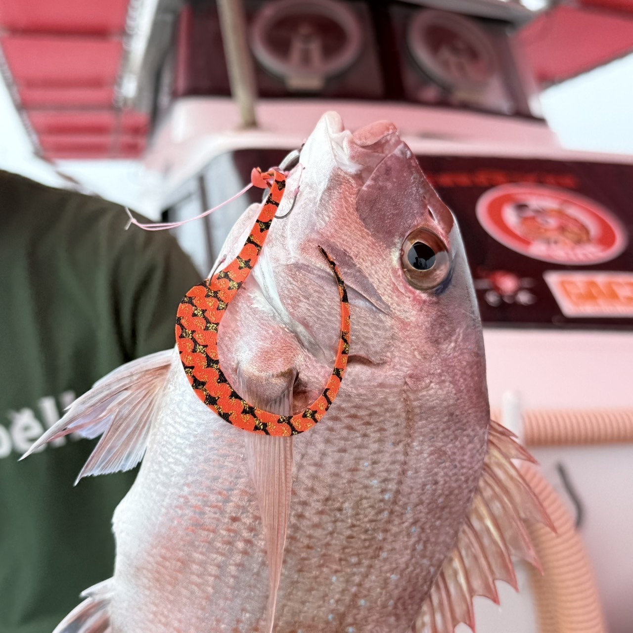 すると、さっそく佐々木主任の竿が叩き出し船中初ヒット💥上がって来たのはいいサイズの明石真鯛🌸🐟ヒットネクタイはササラボさんのシングルコブラカーリーとの事。