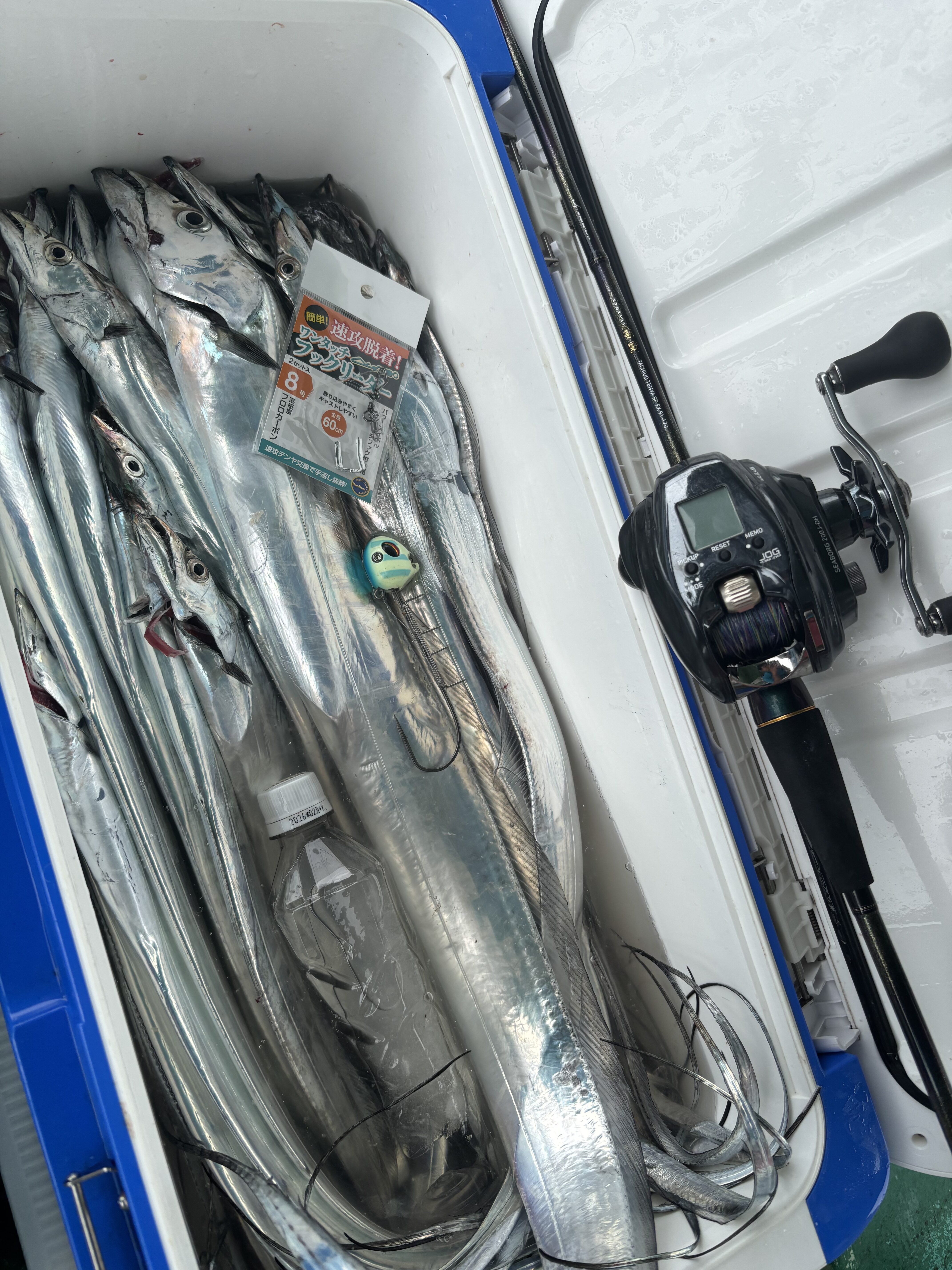 またまたホームの「第二小島丸」さんにお邪魔して、タチウオテンヤ釣りへ行ってきました。今回は大潮。朝イチは小島沖を狙うも濁りがきつく、ポイントをアカマツへ。すると投入直後からストップ&ゴーで連発し、1流しごとに6匹ずつキャッチしてあっという間にツ抜け達成‼️ ただその後は睡魔との戦いで、休憩を挟みながらの釣りに。