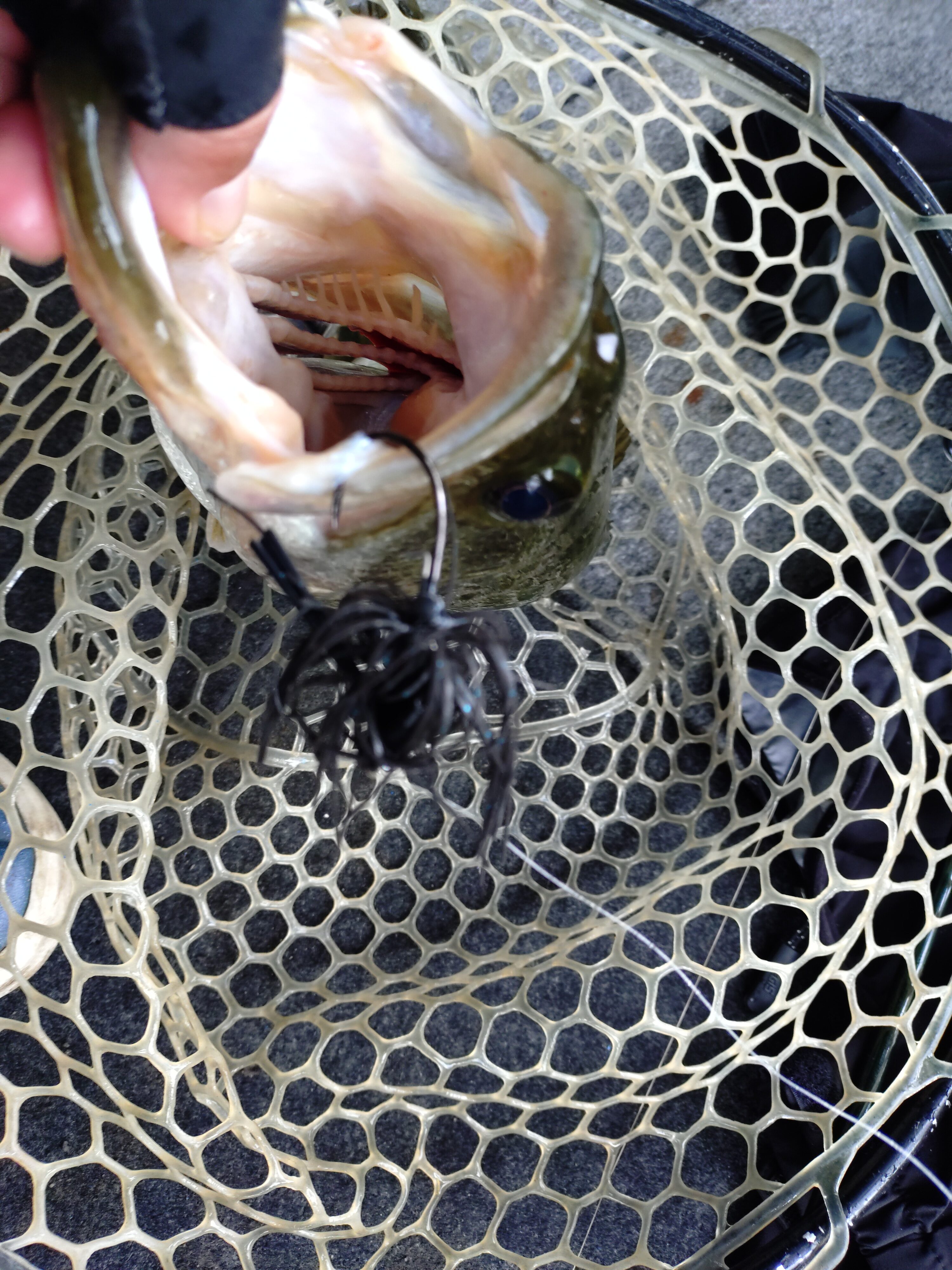 ……そして来る時がきたのは、午後3時前に大又川筋、上〜中流エリアの頑張地帯、水質は濁りぎみ、カレントが発生、そんな状況に、前々から試したかったラバージグにブルスレンダーカットチューン、ブルフラット3.8を付けてのジグストを投入………答えは早かったです(^O^)v