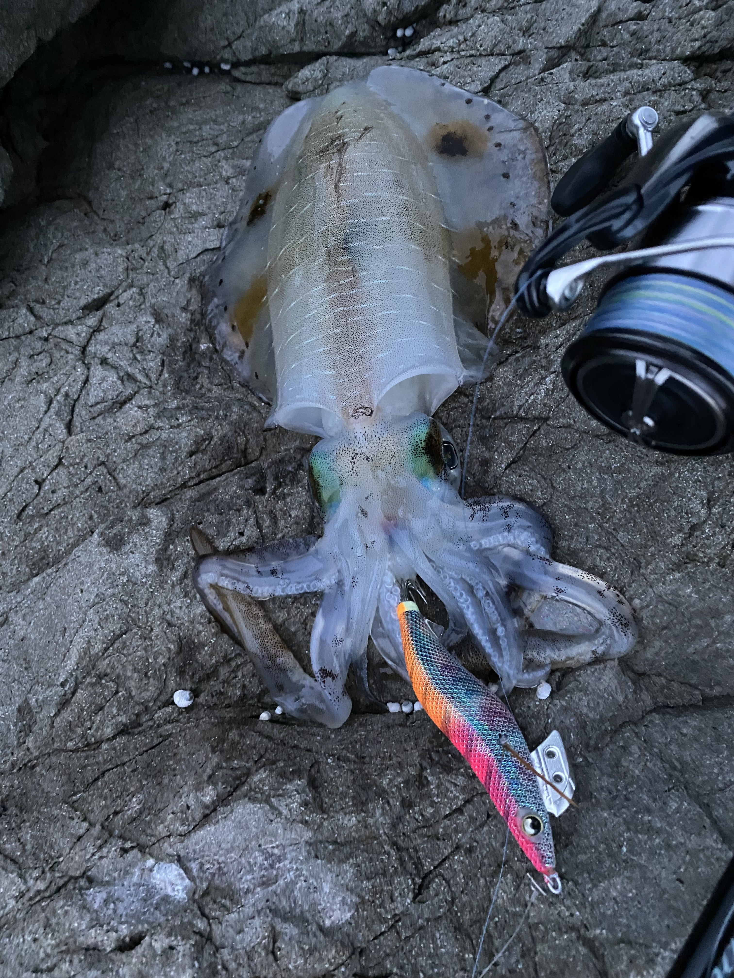 沖の方で潮が流れていたので、遠投してフォール中に抱いてきました。プレッシャーのないイカが来たタイミングとエギを投げたタイミングが合致しました(*^^*)