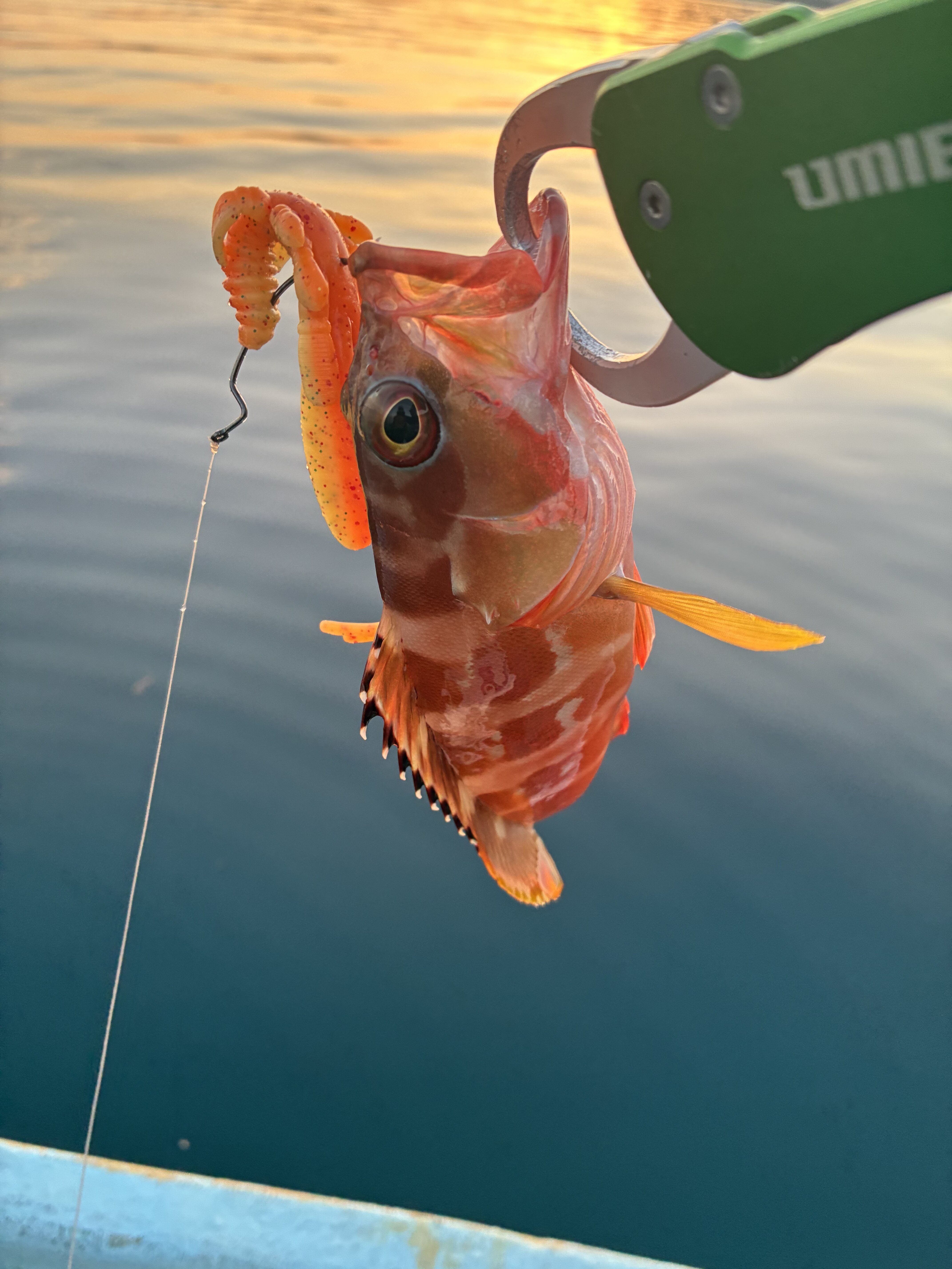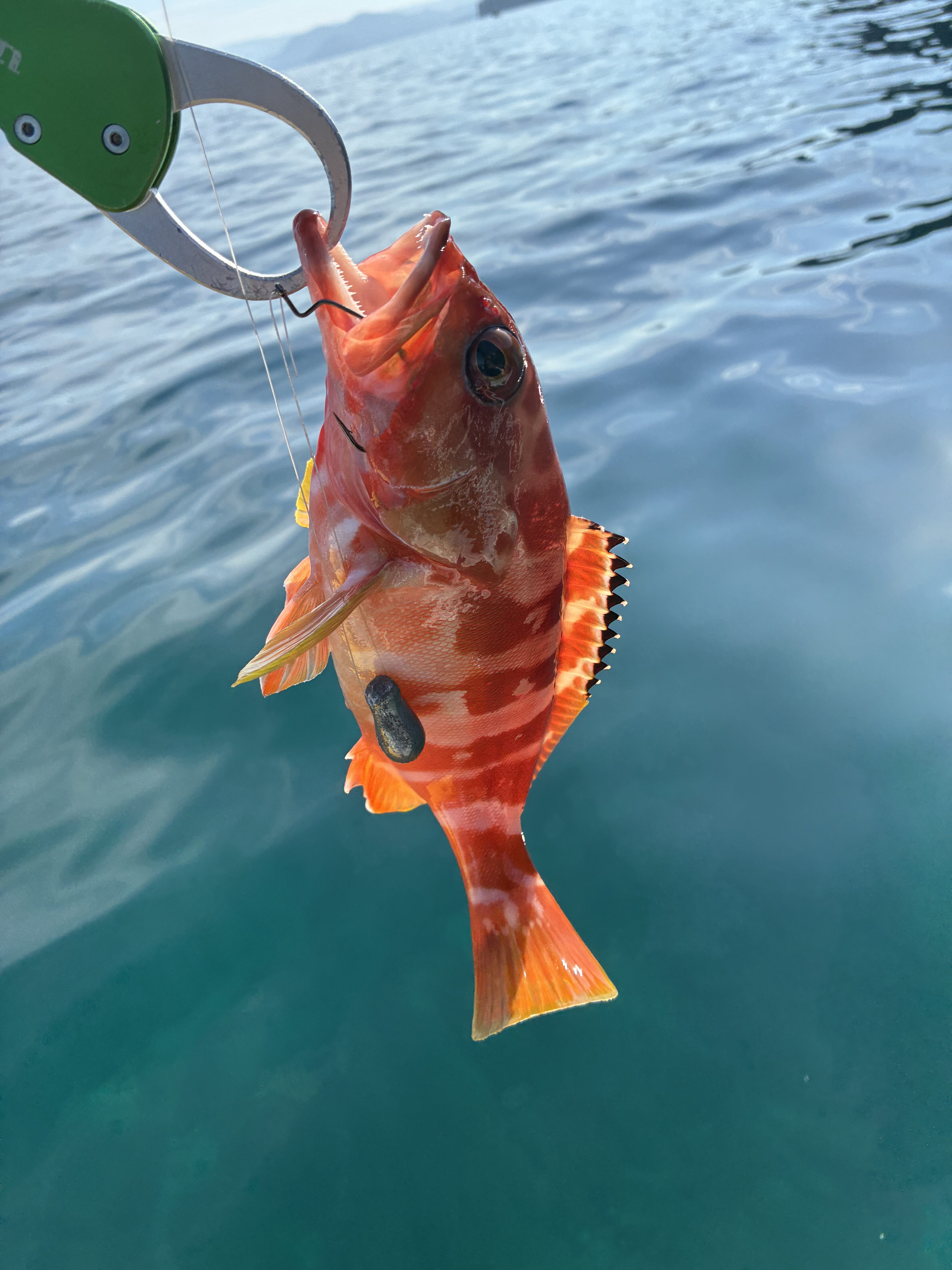 キャストして意外と深いな〜何て思っていると着底!からのすぐにガツガツとアタリが!!小さいですが、アカハタをまずはゲット!