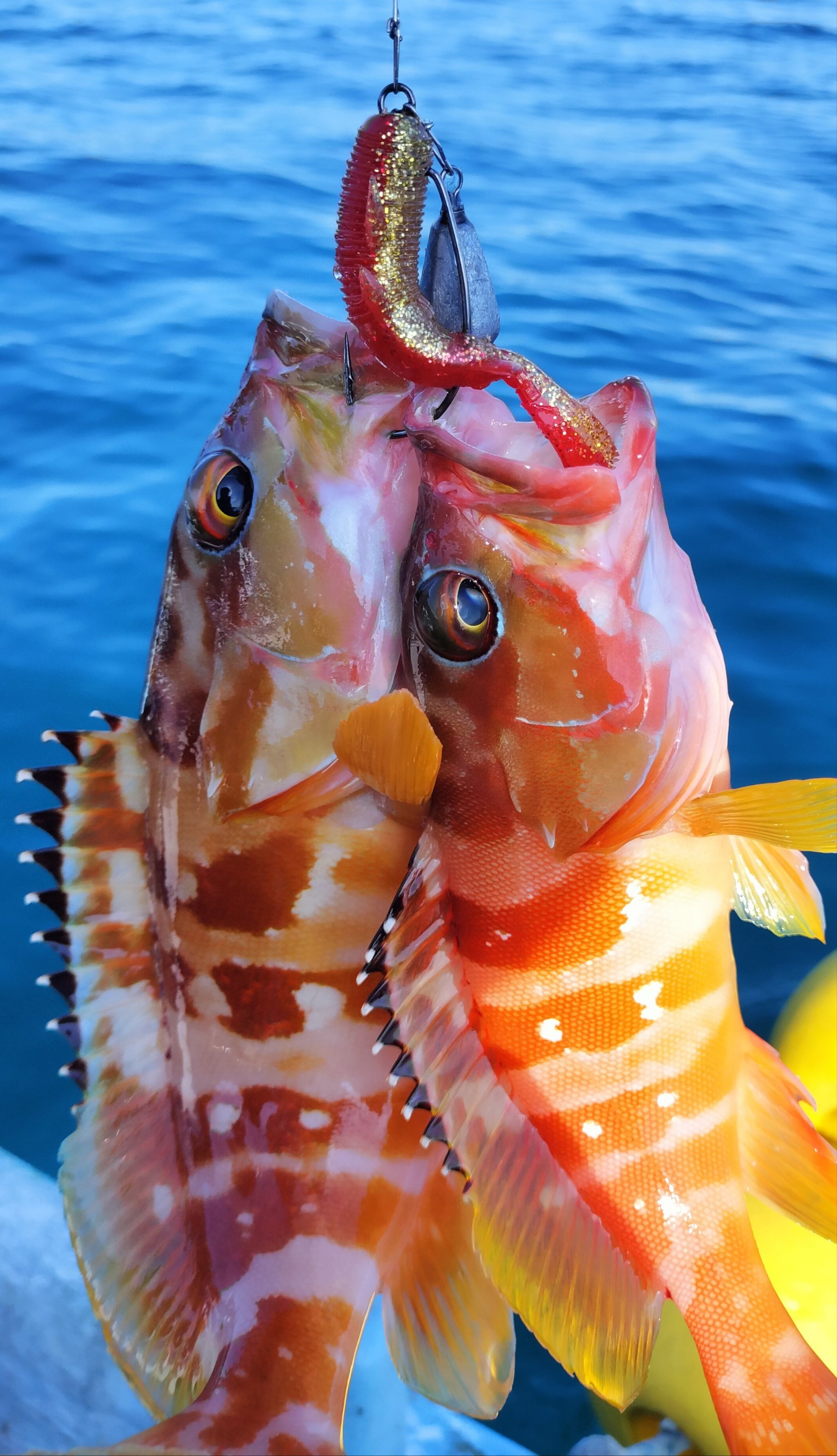 すると水深5〜10mの浅場で中小型のアカハタが活発な食いを見せてくれ、3投連続ヒットが出たり、更に1本のオフセットフックに2匹のアカハタが掛かったりと、30センチアップを含んで2人とも数匹ほどキープ。