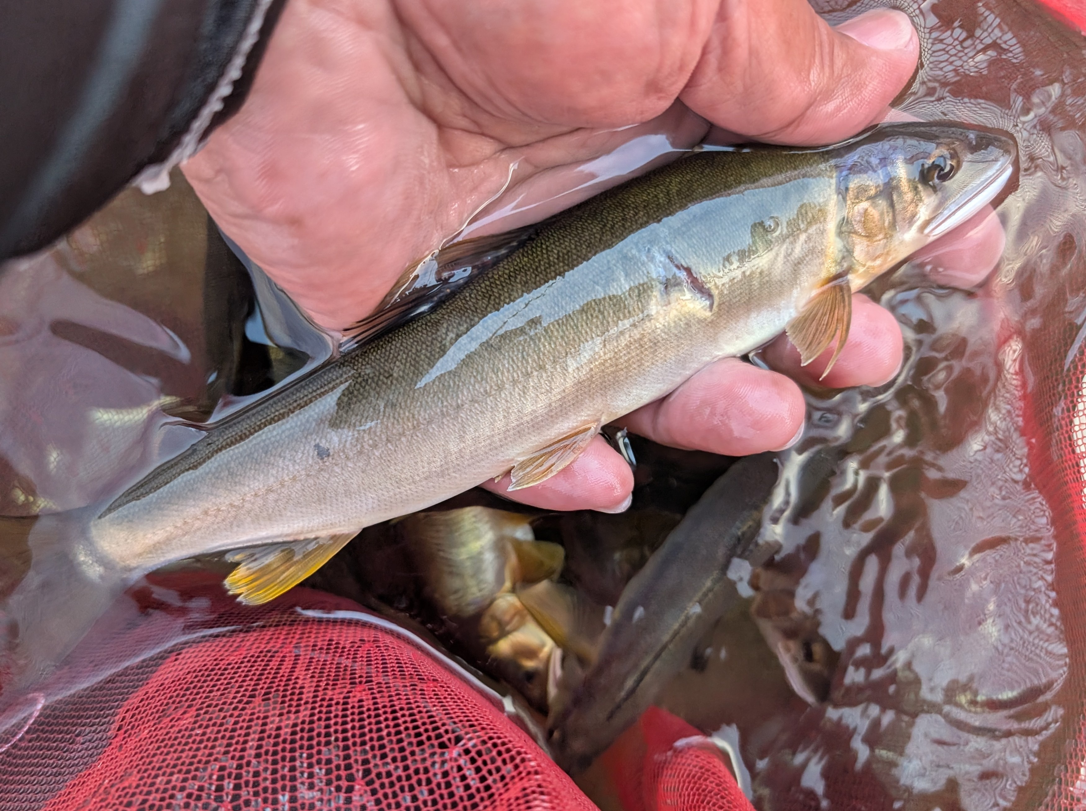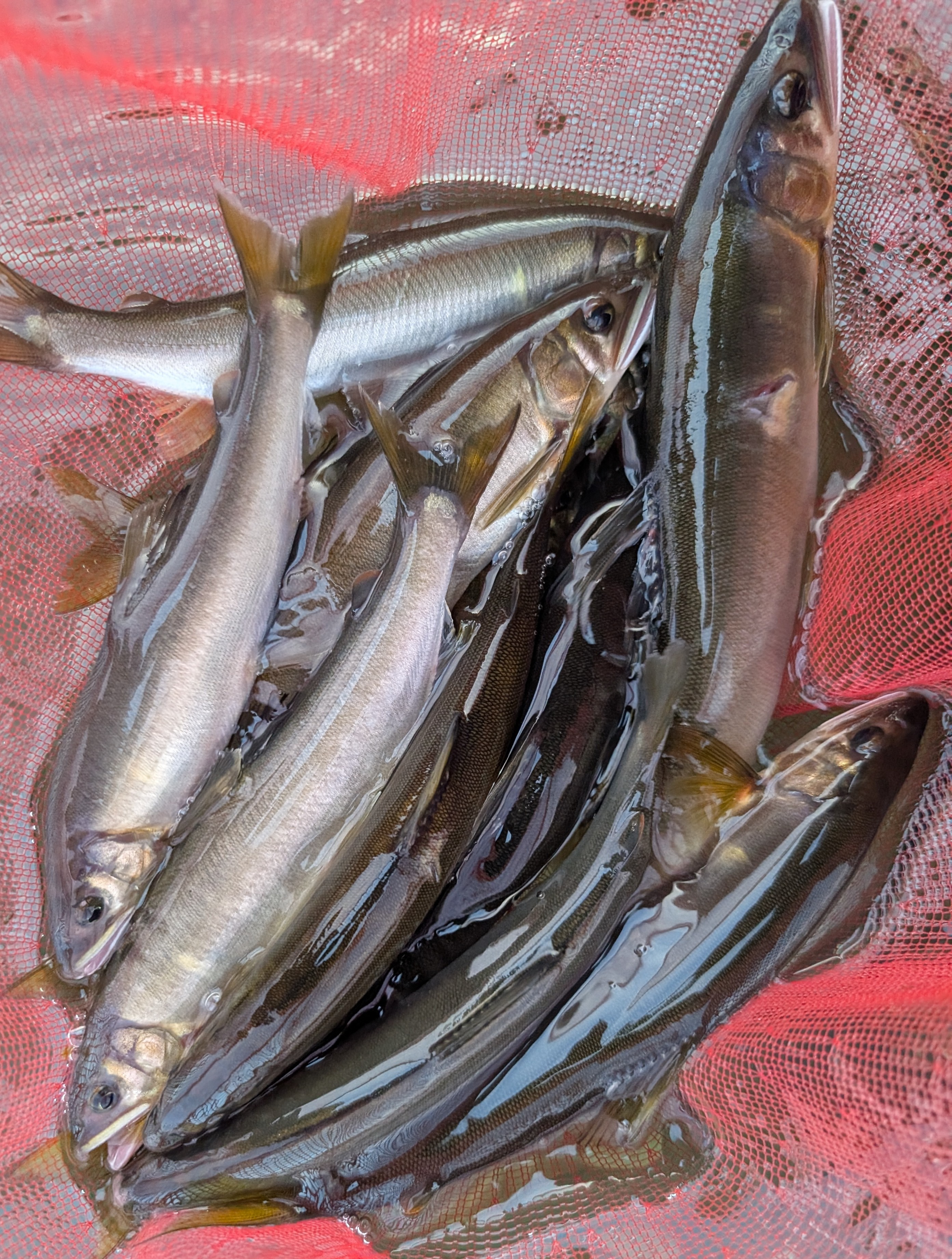開始から10分で1匹目、16cmぐらいの小さめですが野鮎に入れ替え成功。そこから5匹目までは5~10分に1匹ペースで順調に掛かって、サイズも18~20cmと少しづつ大きくなってきましたが、そこから反応がぴったり止まってしまいました。ちょっとずつ移動してみましたが、最初の場所が竿抜けだったようで、移動してからは中々掛かりません。なので、ヘチなどの釣り難い場所を狙ってみると・・・ガガガッといいアタリ!そこから一気に目印がぶっ飛んだので、慎重に寄せながら自分でも鮎に近づいて、この日最大の24cmを無事にキャッチ。