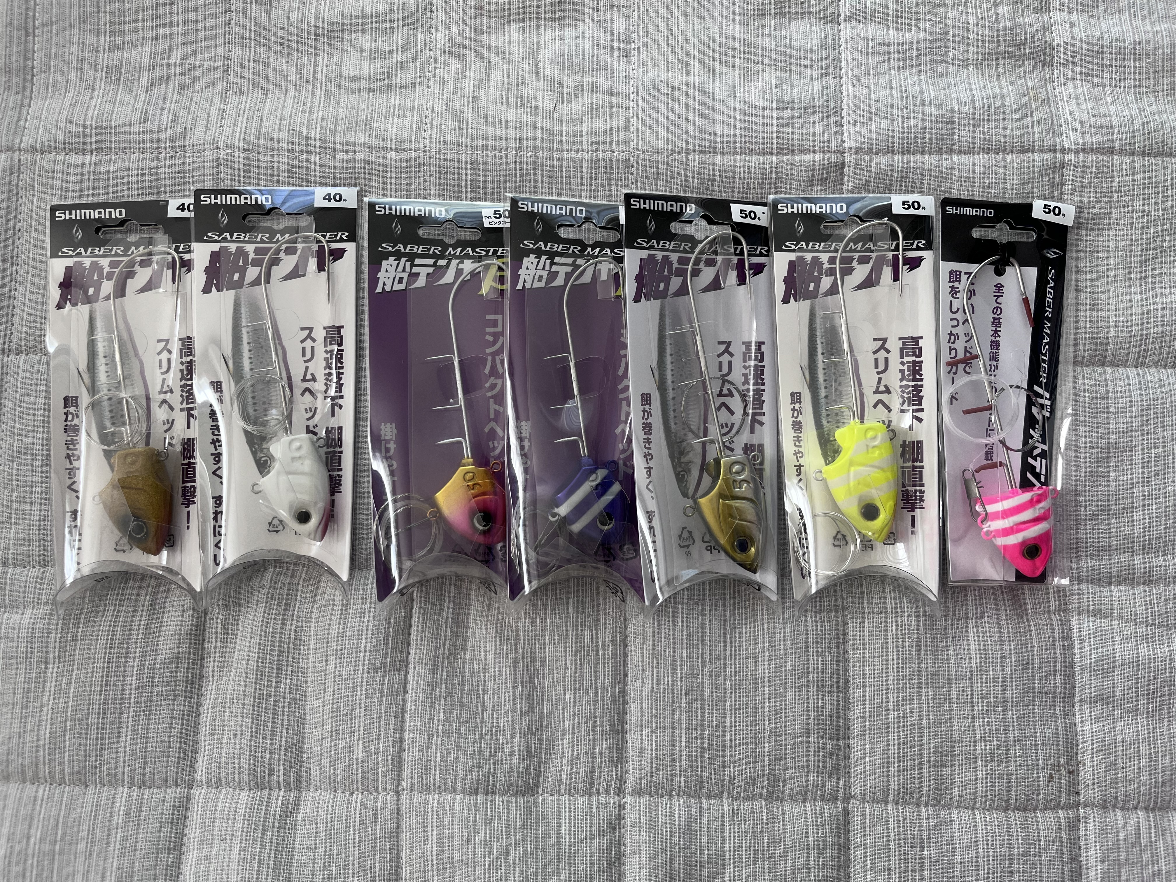 ポイントまでは10.15分程で開始早掛け賞ありますよ〜と言ってる側から反対側左舷で早々上がり早掛け賞の『シマノ バレットテンヤ2個』が配られて盛り上がってました 今回はテンヤの使用もシマノ製品のみの使用なので用意したテンヤ達はこちら…