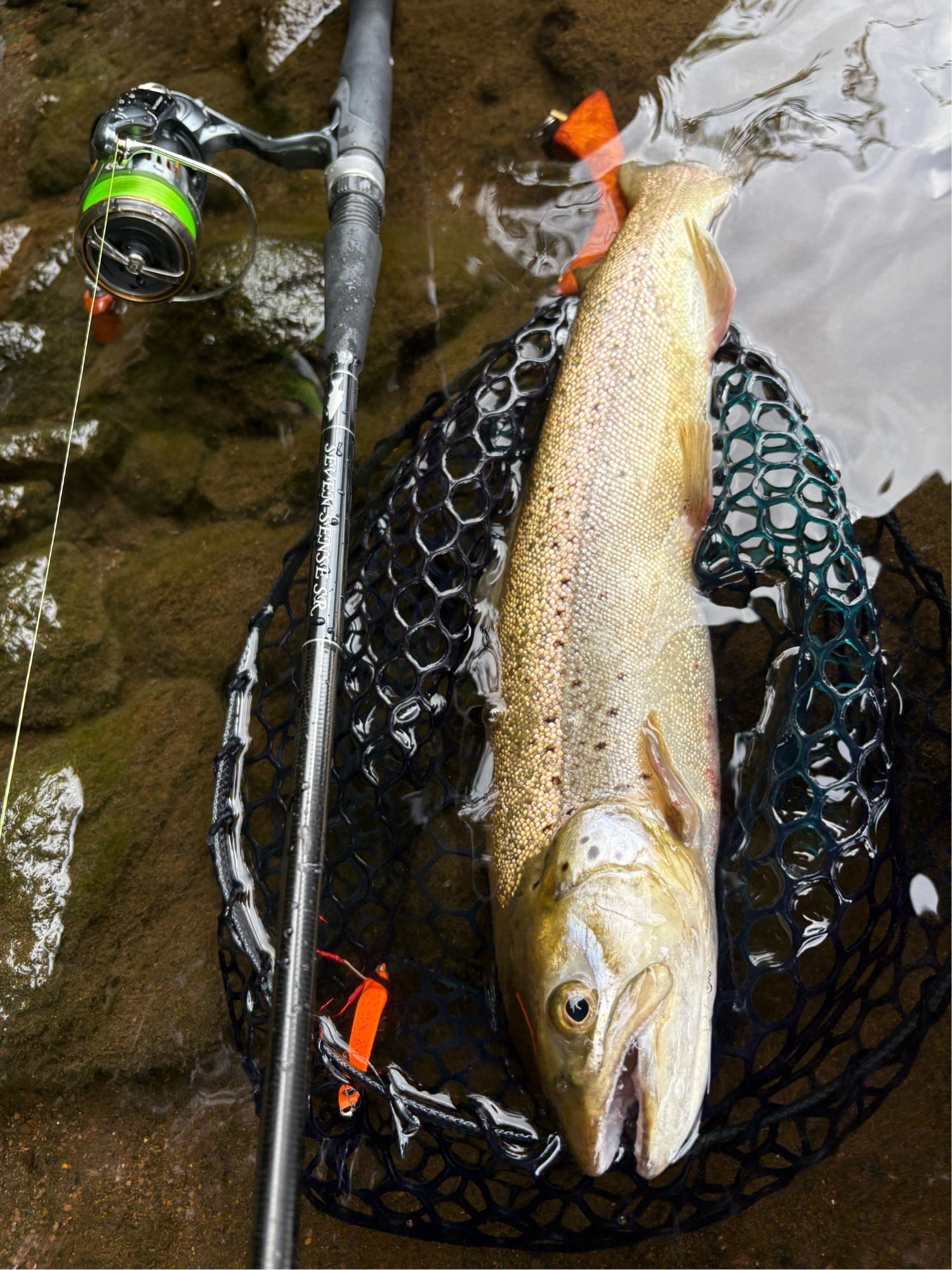 サイズ的にもヒメマスっぽいので慎重かつ早めに上げてくると、ブレイク上のウィードに引っ掛かりフックアウト、、、