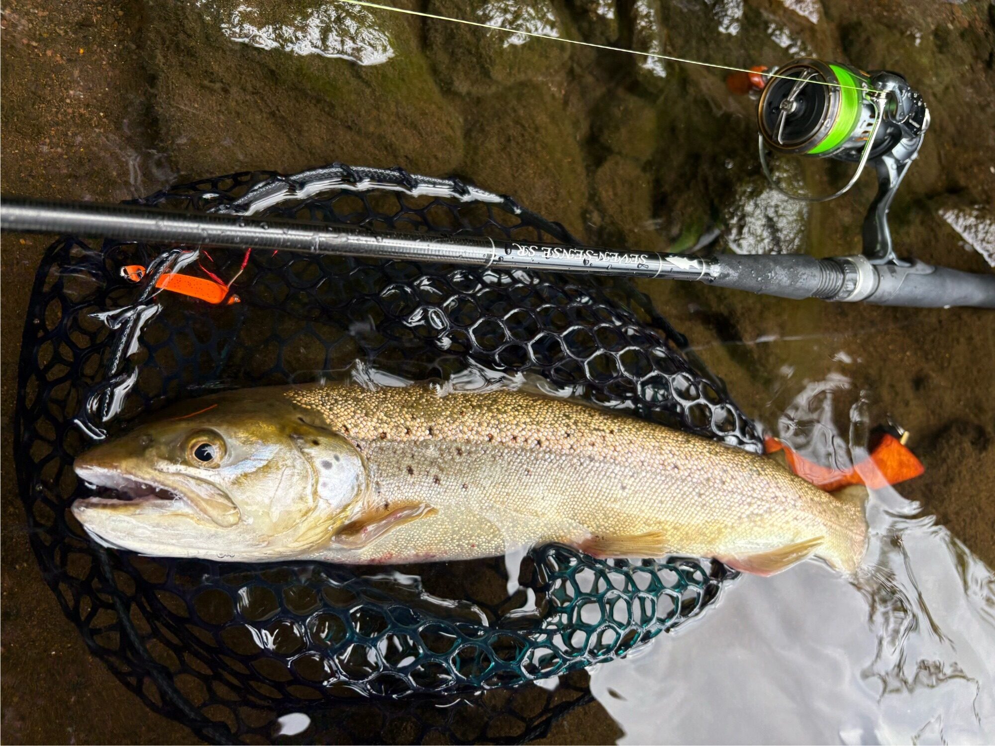 いつもジグやスライドスプーンで使っている86MHのトラウトロッドではゴツすぎるので、細身でMLのシーバスロッドにPE0.6号+フロロ8lbのセッティングにしました。 ミッドウォーター872SR、湖のトラウトロッドとしてもかなりオススメです、ウェーディング設計ということもあり、グリップの長さも取り回しがよいです。