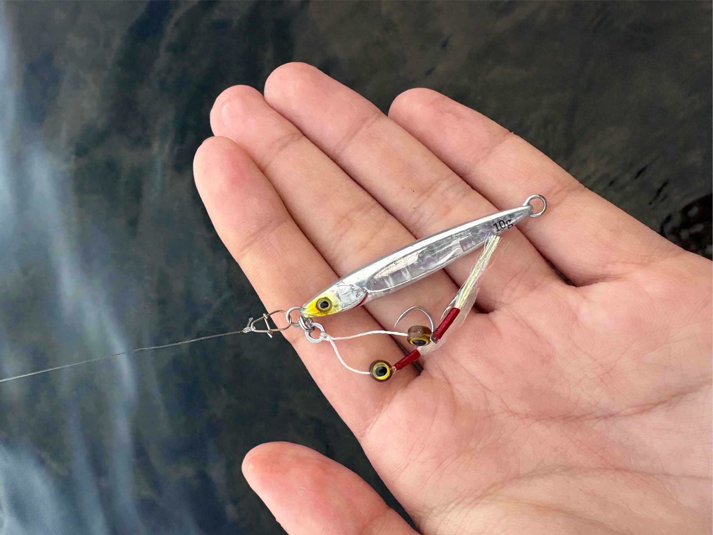 しばらく反応なく釣り方を少し変えようと、シルバーで細身のビッグバッカーフィットジグ10gにチェンジ。 ティップで跳ね上げ短いフォールの誘いを試してみるとフォール中にバイト!