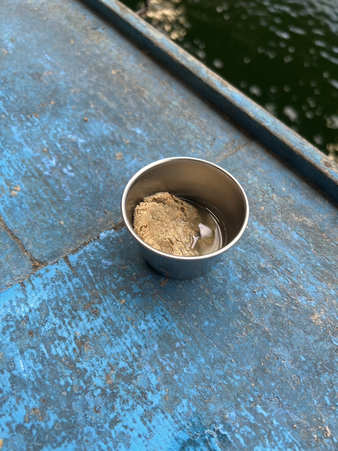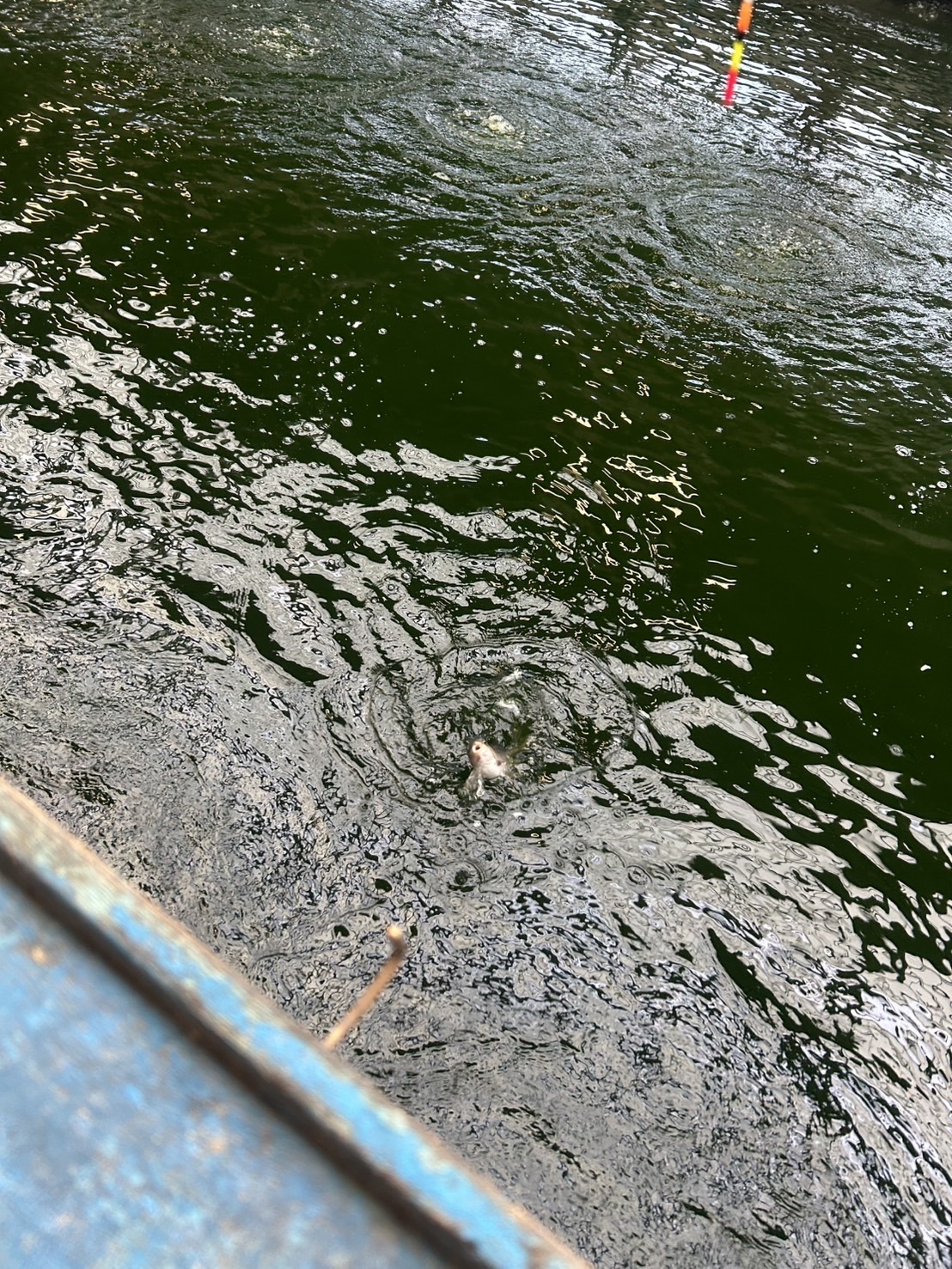 さて今回は地元の釣堀におじゃましてみました。自宅から車ですぐのとこにあるので、実は暇ならちょくちょく通う釣堀なんです。駐車場完備、全天候型で屋根はあるし、扇風機も、冬はストーブもあります。手洗い場も自販機もあり、釣り池には転落防止柵もありお子様連れも安心です。時間制で、竿1本につき1時間1500円、針切れは1回50円でした。嫁さんとシェアして釣ります。餌はダンゴ。あらかじめ練られたモノです。ここでちょびーっとだけ手洗い場で水を足して、少し柔らかめに団子を練り直しするのが個人的におススメです。針がギリギリ隠れるくらいの大きさに丸めてつけて投入。