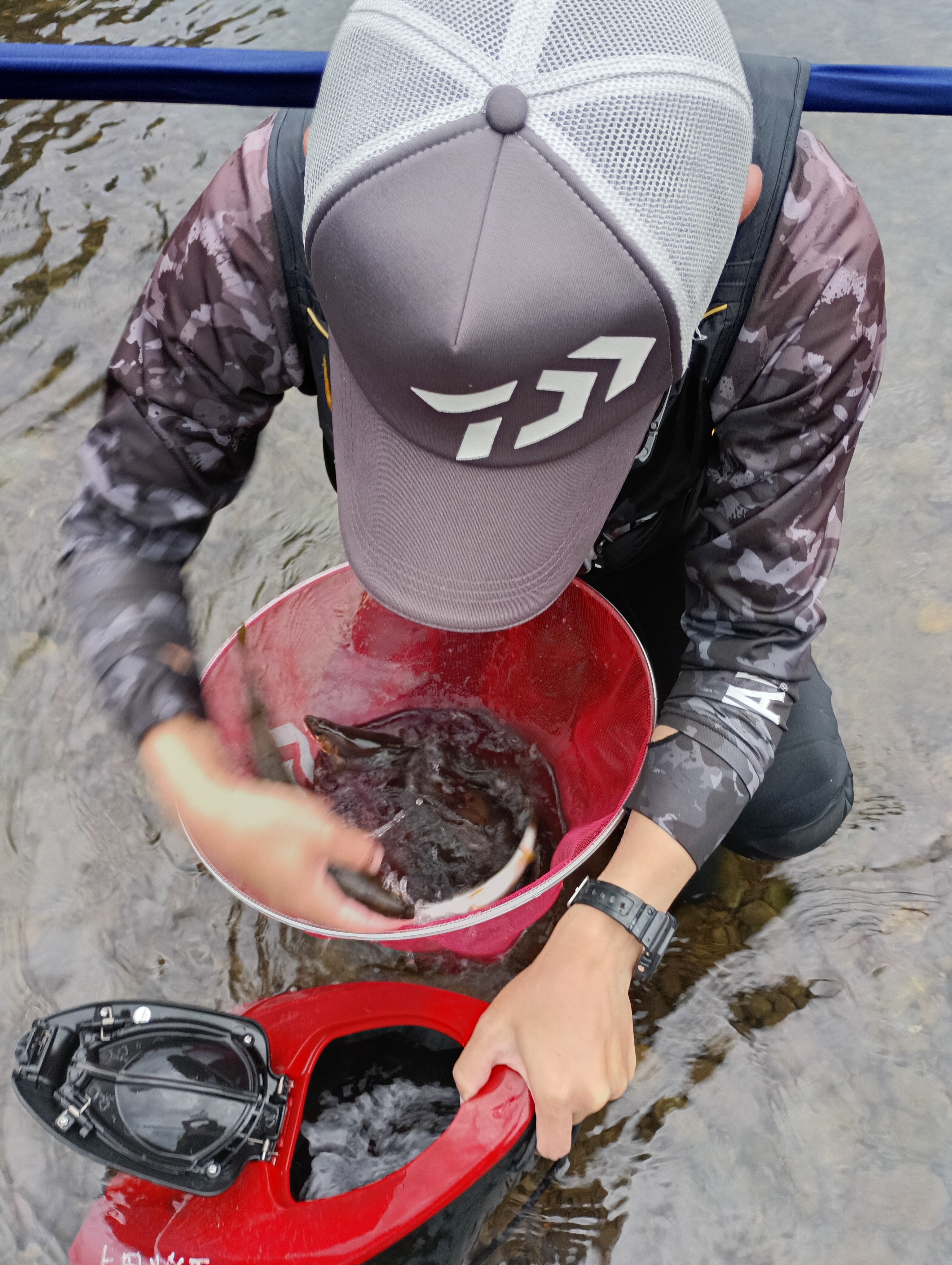 2025.09.30 印刷する 奈良県吉野川へ尺鮎チャレンジ♪ 魚種 アユ/鮎 サイズ ゼロ 数 ゼロ 釣り方 友釣り 場所 奈良県 天候 晴れのち曇り スタッフ 平川葉子 店舗 堺店 釣行日 2025.09.28 コメント 今日は堺店のお客さんと、奈良県吉野川へ尺鮎チャレンジに来ました。 ブンブンの早野さんのホームリバーでもある吉野川。毎週通われて精通されてるのでご案内をお願いすることにしました。 下西囮店に朝8時集合。 私は何度か来てますが、お客さんは初めてなので手前のローソンで待ち合わせをし、囮店に向かいます ポイントを教えて頂き、妹背という下西囮店まえのポイントからスタート。 瀬落ちでトロが広がります。 なかなか水が冷たいですが立ち込んで流しますが反応はありません。 少しづつポイントをずらしながら流しますが反応はなし… お客さんも反応はないようです。 以前来た時もどんどん下って移動していたので お客さんに声をかけて下へ下りました。 下の浅いトロ場で年配のお客さんが掛けておられました。 早野さんも、この浅いトロも釣れるポイントですと言われていたので、しばらく粘って泳がせるも反応なし… 更に下へ。 小さめの瀬になってるところの瀬落ちをやったり、対岸に渡り流芯をやったり… チャラ瀬をやったり…反応なしです💧 下のトロ場で若い方が1匹掛けておられました トロ場に戻ろうかと戻りながら、チャラ瀬など通してましたが 囮はすでにヘロヘロに。 座って休憩していると、お客さんから声をかけられ早いですが、お昼にしましょうとのこと。 聞くとお客さんはトロ場で5匹ほど掛けておられました❗ しかも最大28センチも❗ それは良かった❤️ お昼を囮屋さんで皆さんで歓談しながら食べ、お客さんの鮎をゲージにいれてはかったりして、 午後の部スタート。 ここのトロ場で掛かればデカいからと、早野さんもおっしゃり、 皆で並んで立ち込みながら頑張ります。 朝は晴れていて暑いくらいでしたが 曇ってきて立ち込んでいるとかなり寒くなってきました すぐ下で釣りをされてる早野さんに大物のアタリ❗ しかしあがってきたのはドデカイ、ナマズ これがあげられる竿(がまかつパワースペシャル)のパワーは凄い❗ さらに下で釣りをされてるお客さんはポツポツ掛けておられました 夕方になり、残念ながら平川にはアタリはなかったですが お客さんは初めての吉野川で28センチを筆頭に11匹も掛けておられ、 囮屋さんで「こりゃ竿頭やで❗」と皆さんに褒めてもらってました かなり、初めての大鮎釣りに不安を持たれてたので、心配でしたが 好釣果で本当に良かったです❗ 早野さんも太い鮎を数も掛けておられさすがです❗ また、ぜひ来年も懲りずにチャレンジしたいと思います 使用した釣具 竿 ダイワ銀影エアmt87h