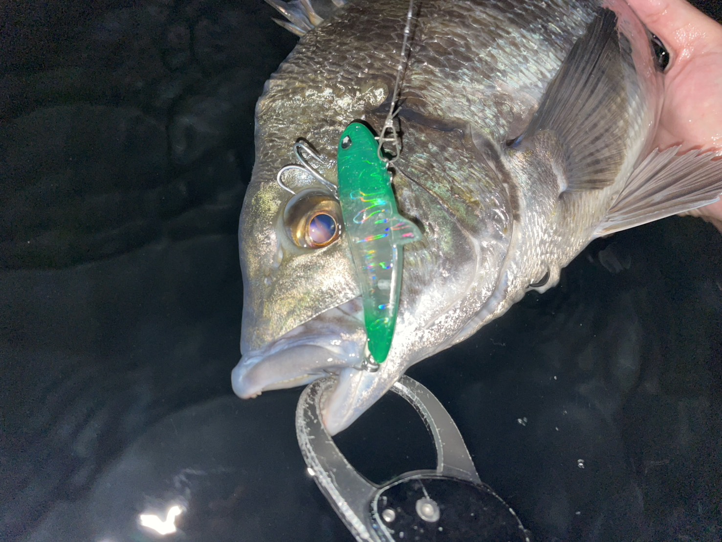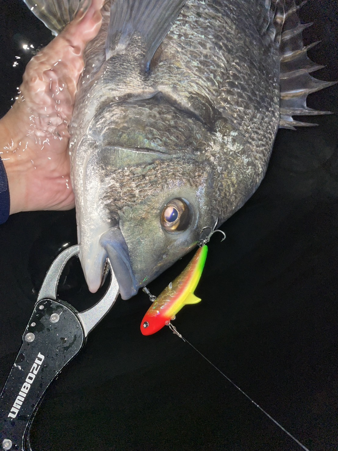 オリカラからではなく既存カラーのディモルに立派なクロダイが釣れてくれました!今回はシーバス狙いのため、即リリース。