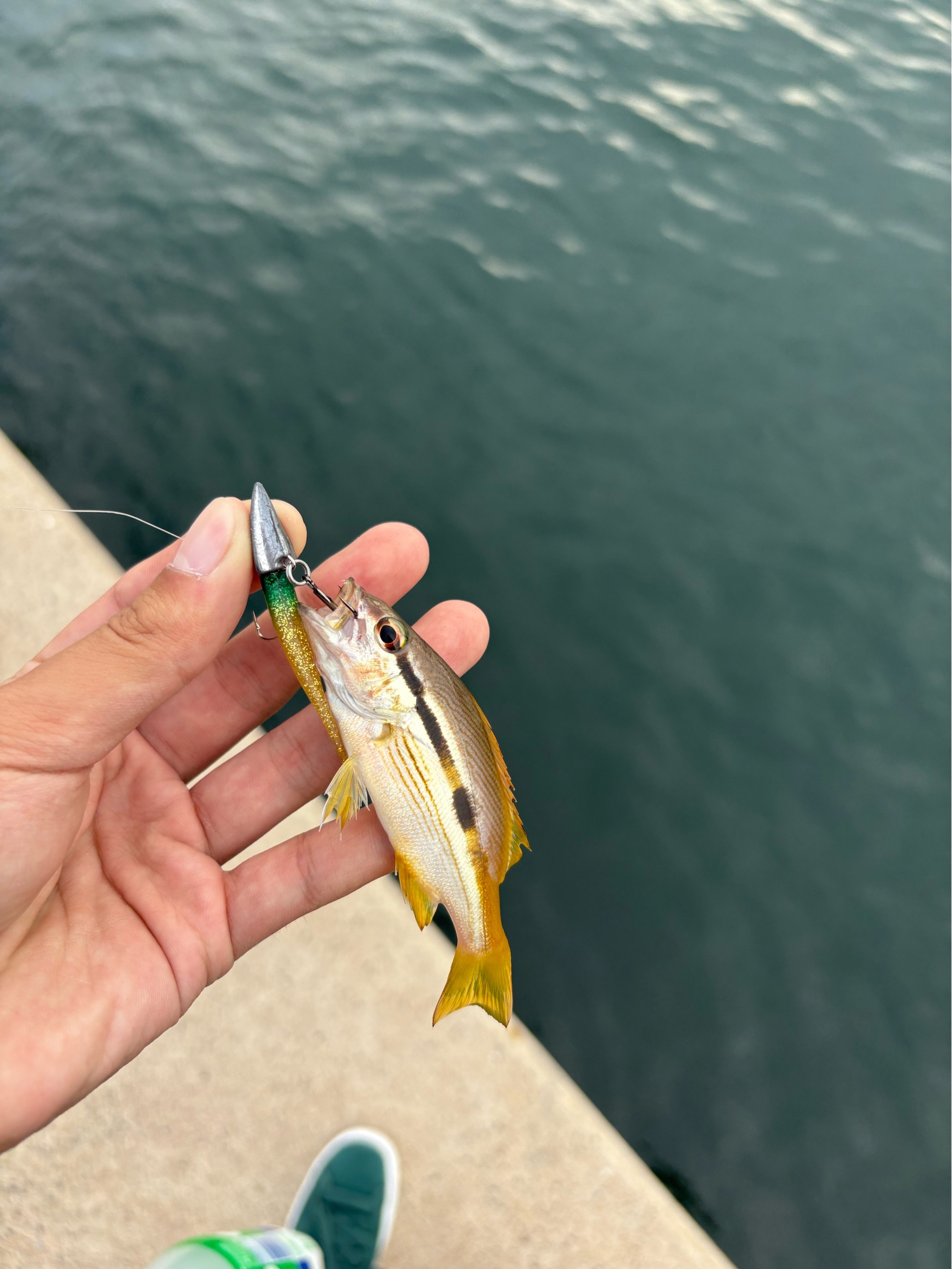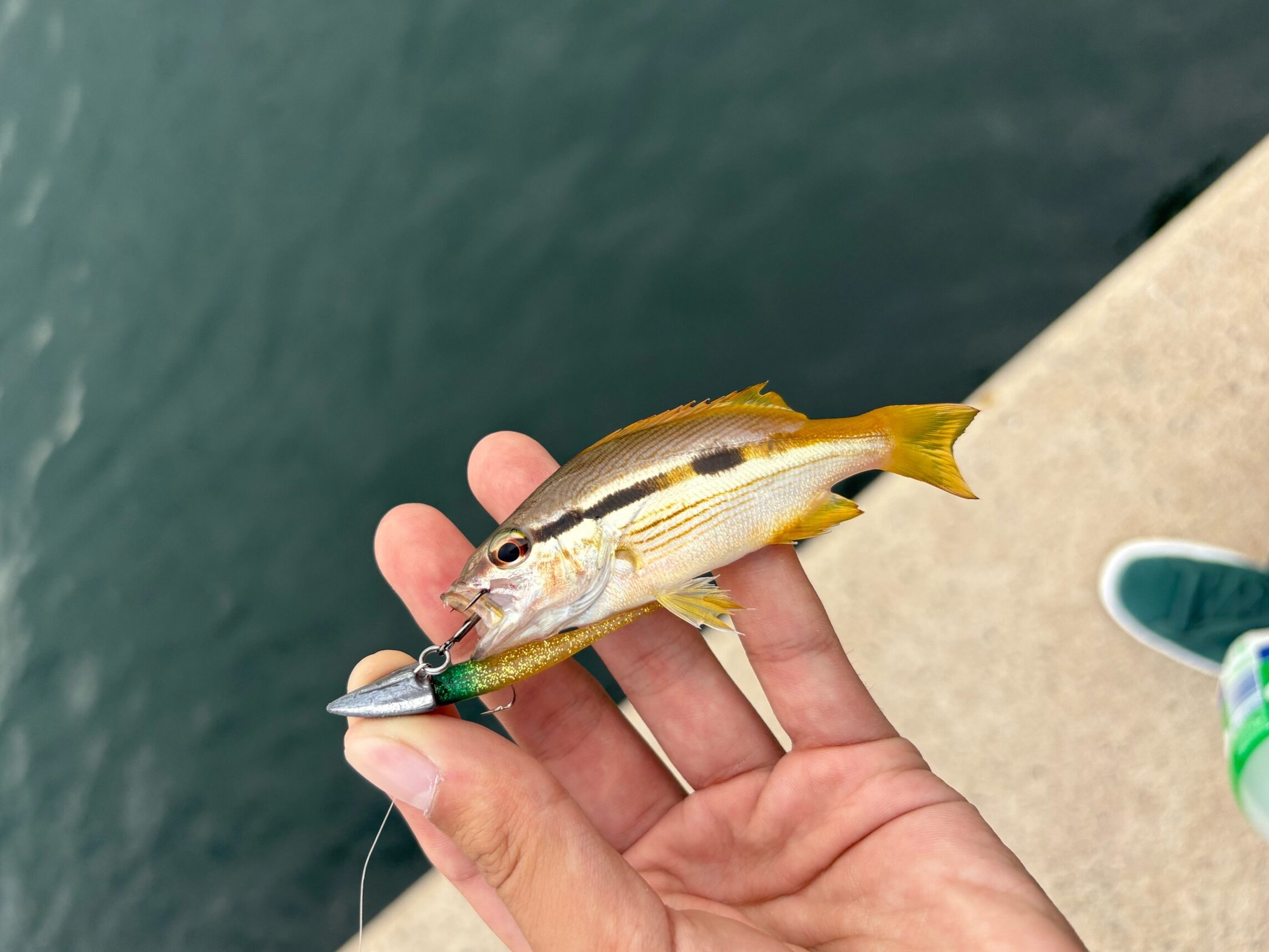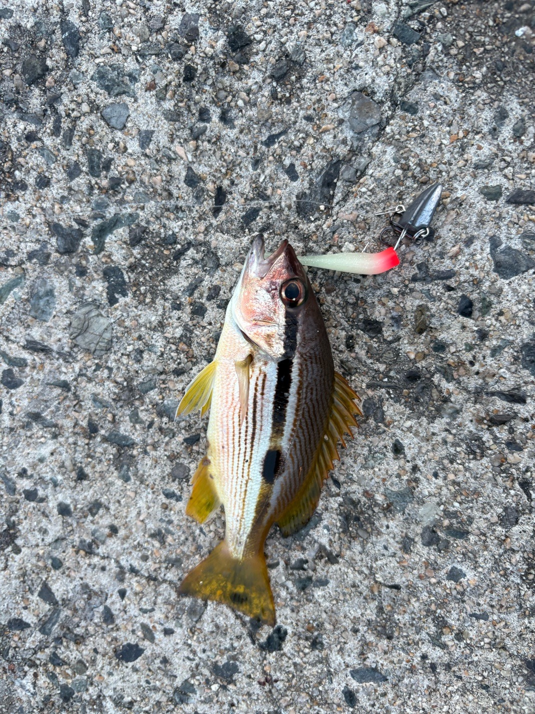 1匹目は小さすぎて付いているのかわからないくらいの引きの魚。 初魚種のヨコスジフエダイをゲット!