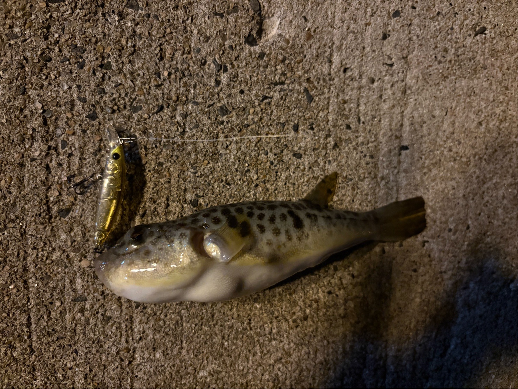 サイトでフグを狙い、何度もスローフォールで食わせようと試すとなんとか1匹ヒガンフグが釣れました。
